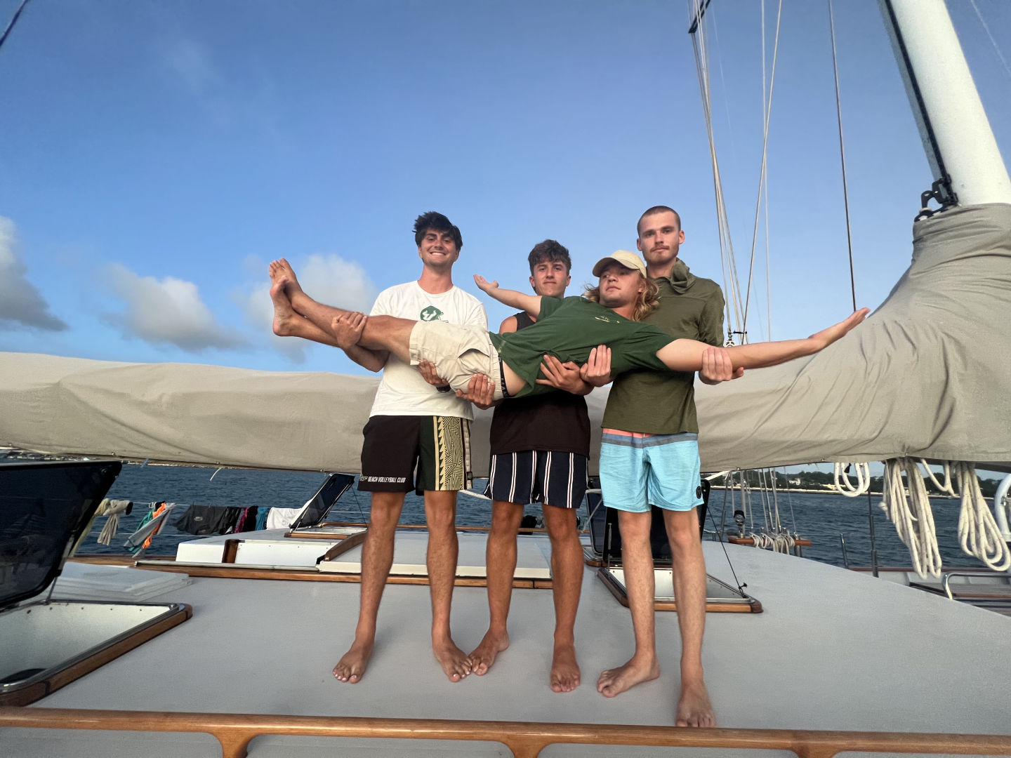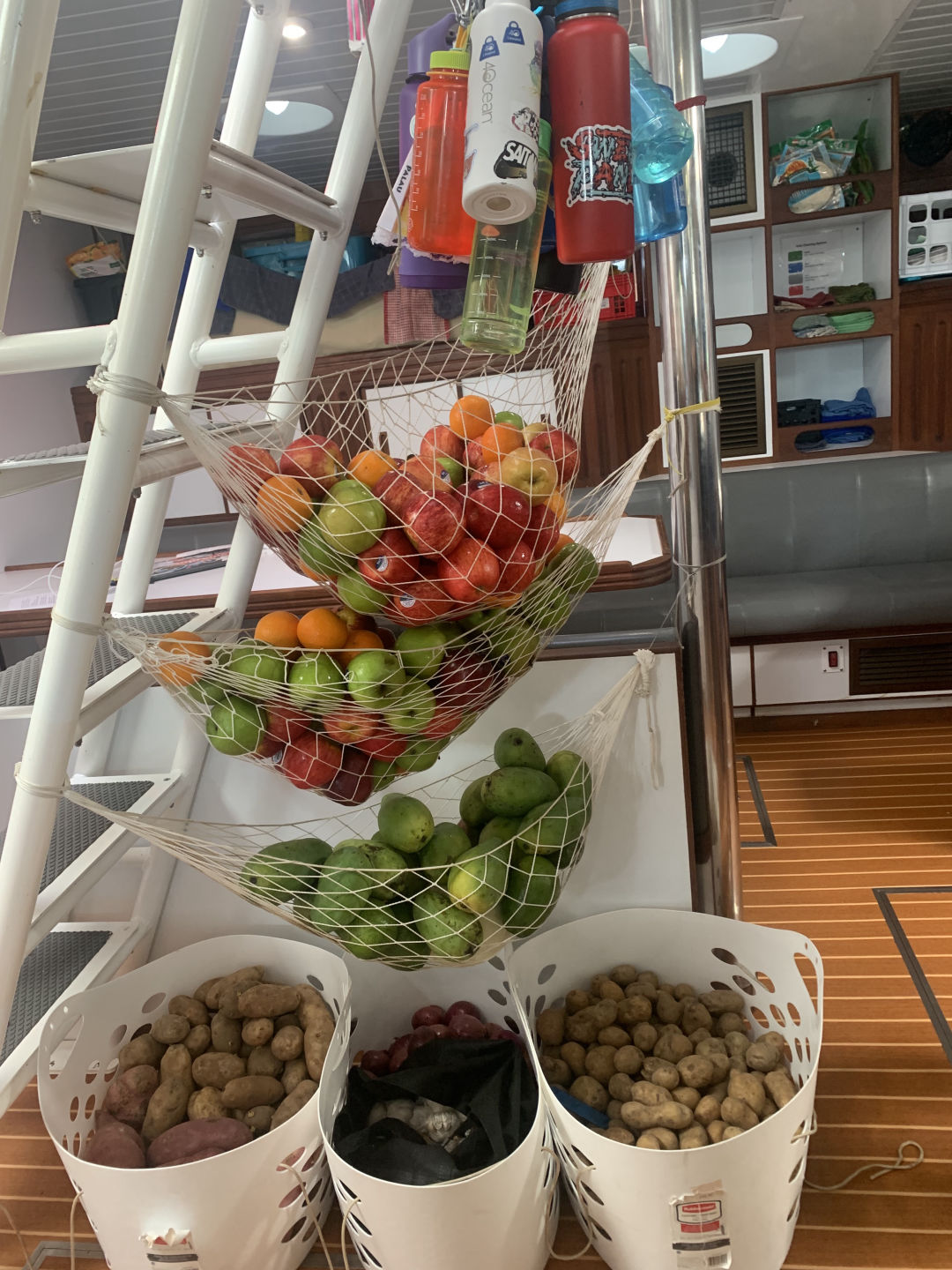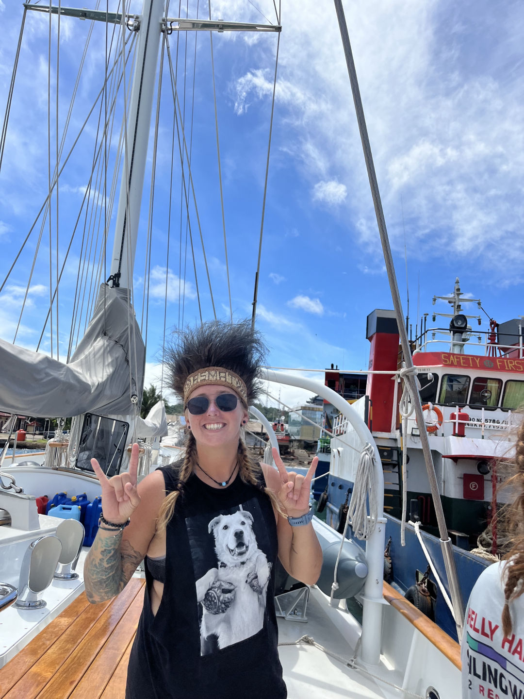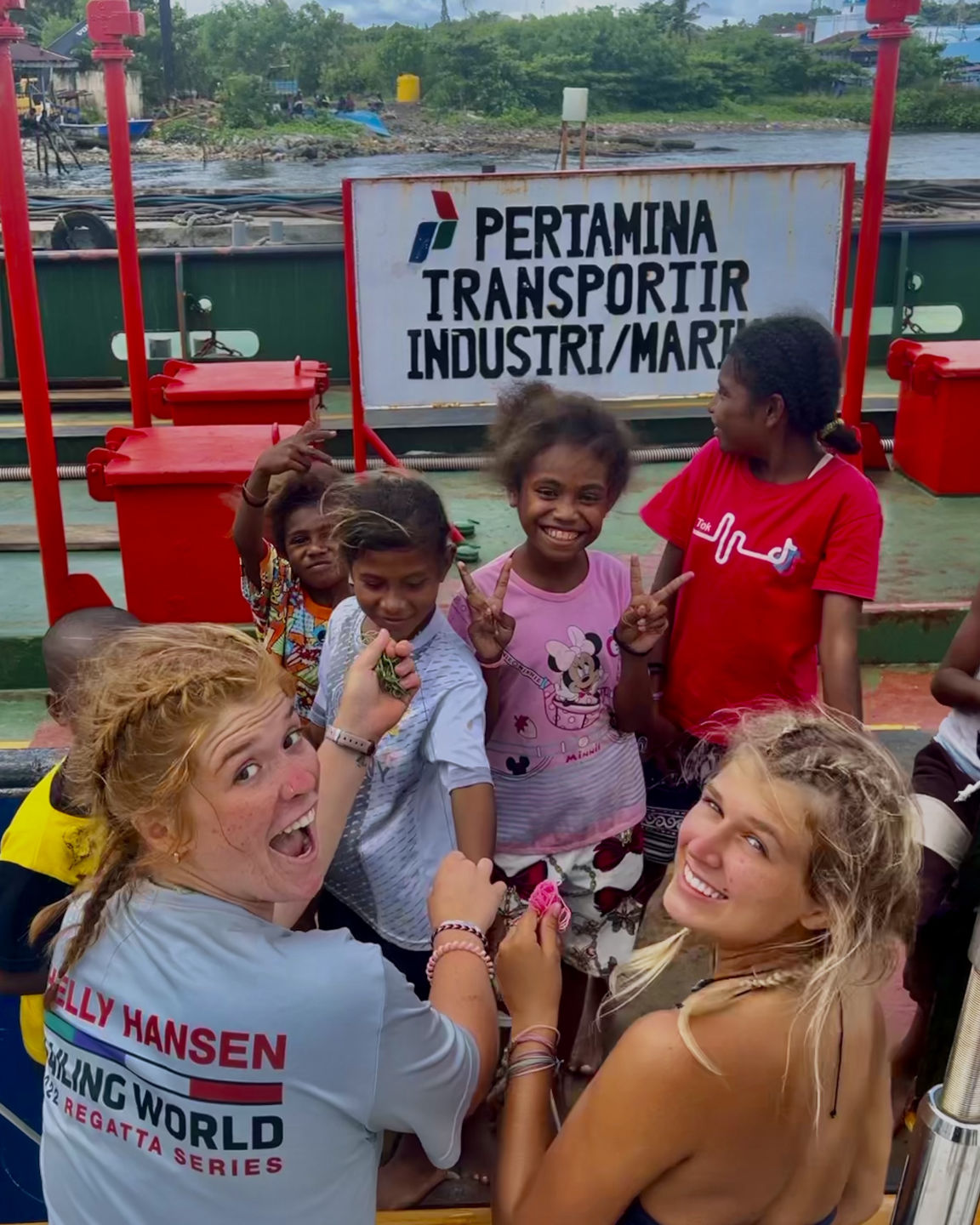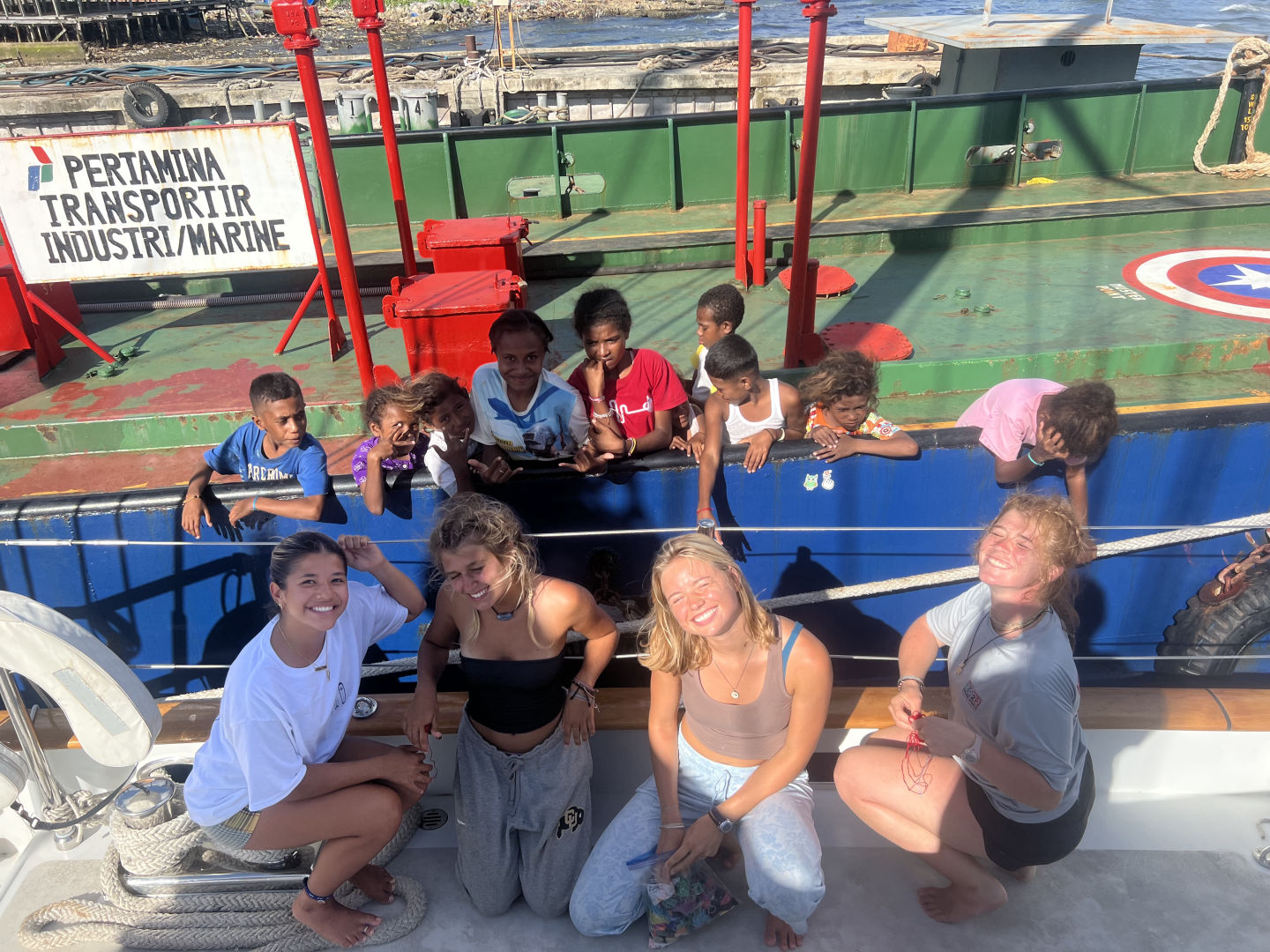 HI! so excited to be skipper for the first time. It’s wild to think I’ve already been here two weeks. I couldn’t have dreamed of a more welcoming, wonderful crew to join. Today we had a bit of a lazy day while waiting to finish being cleared into Indonesia. Where we are anchored outside, Sorong is nothing notable with dirty water and a constant fear of dinghy pirates, but all the passing boats have been very friendly, always waving to whoever is on deck. We woke up this morning to a breezy clear sky (the cooling wind very appreciated) and a delicious breakfast of overnight oats and eggs made by Kygrstan with some quick thinking after weevils completely took over all of our flour, ruining her original plan of French toast. After breakfast, those who are doing their rescue diver certification took the final test and then picked up anchor to move to the fuel refill station. Once we were docked and met by the wonderful smells of trash and fish, we all headed back inside to get our Emergency First Responder tests back and go over them as a class. After class, we had time to ourselves to relax, catch up on homework, touch in with friends and family back home, or hang out with our new friends on the barge next to ours. Said friends were a group of three girls between the ages of 6-10 that ended up growing into a group of around 12 children who stuck around for hours and hours learning everyone’s names, making handshakes, trading dance moves, and making friendship bracelets. The little girls loved Jack requesting many photos with him and begging for him to come back whenever he went below deck. Ben was also a huge hit with all the kids, and they showed their love by screaming his name when he came back on the boat, then collectively flipping him off. Sydney and Nora were also a big hit and spent almost half the day with the kids (besides a brief intermission of yummy enchiladas).