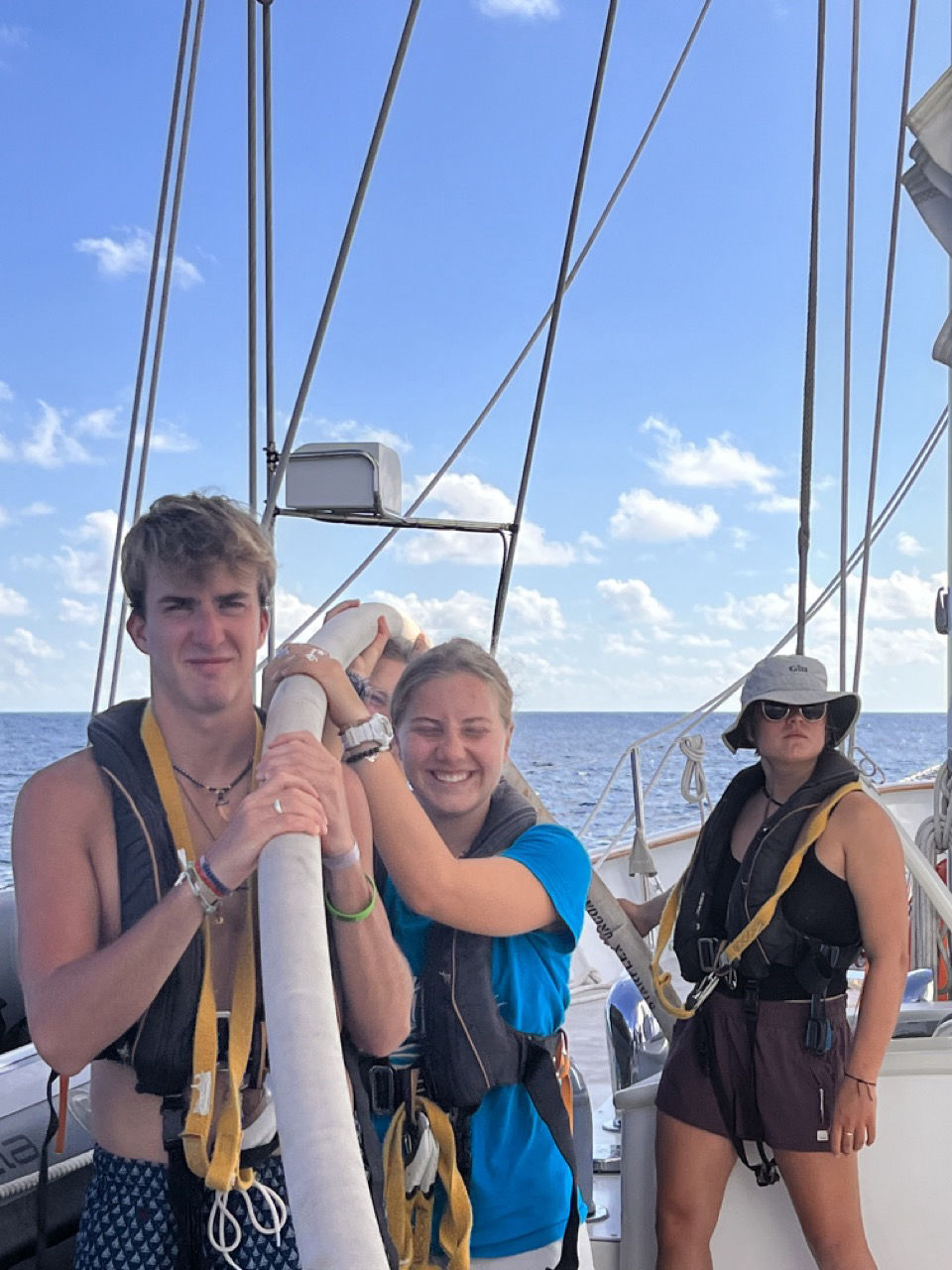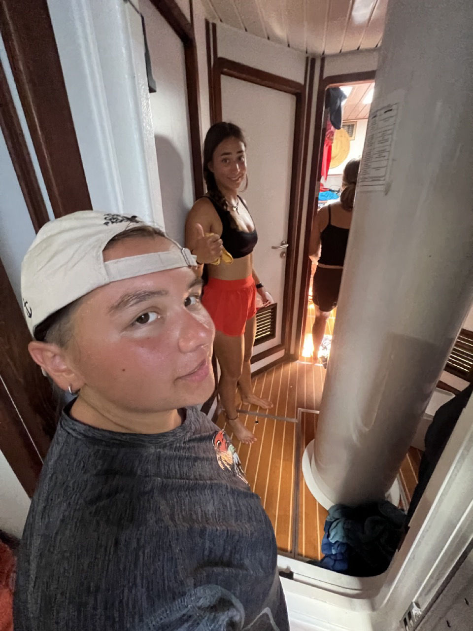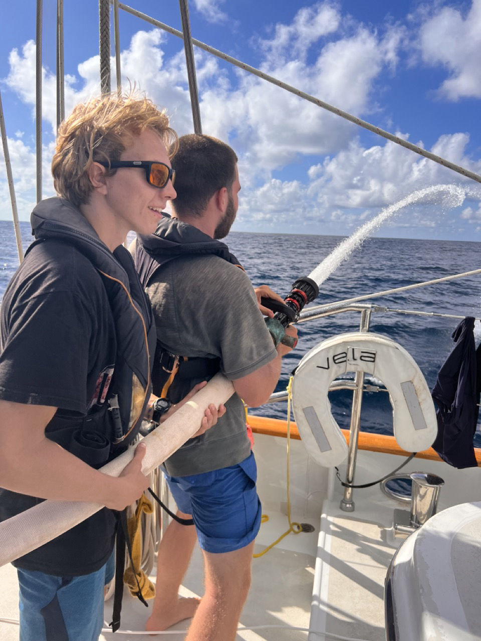 Happy Easter from the crew of Vela! Today we hit the milestone of 4000 Nautical Miles over the trip(still another 3500ish to go). Today started off for me with a red-eyed watch from 4-8 AM with watch team 2 (MVPs). We had another great watch, and in the meantime, Kirby and Fargo (at 4 AM) decided to make a batch of brownies for the crew. However, things went somewhat awry and led to the whole event being dubbed ‘Brownie Gate.’ Firstly, Kirby accidentally put a rotten egg into half of the brownie mix, which led to that half (and his hands) stinking. To rectify the situation, the ever-tiring boys, who had just had watch from 12-4 AM, made a second-half batch of brownies and left the ready mixture to be baked by Allie at about 5 AM, and they headed to bed. The thing was, and nobody knows what, something went a bit pear-shaped with that other batch. I saw it baking at 8 AM when I went to bed and can confirm that there was a layer of oil on top of the brownies. And so, when the boys woke up, they were not pleased to find out the other batch had largely been chucked overboard and were visibly not in a great mood all morning. Their mood was probably further heightened by the sound of the fire alarm going off just after Oceanography. Let me say that this fire alarm is the loudest alarm I have ever heard; it feels like it’s going to perforate your eardrums. It actually hurts to hear and is worse than any house, car, or school fire alarm. We had to carry our type 1 PFD and Gumby suit to the cockpit, and so the challenge of covering your ears and carrying the stuff up the companionway was tough. Turns out it was just a practice, and we then broke into our watch teams to act out what we would do in a fire emergency which was cool to learn about. We ended our training with a fun go on the fire hose, which you can see in the pics.