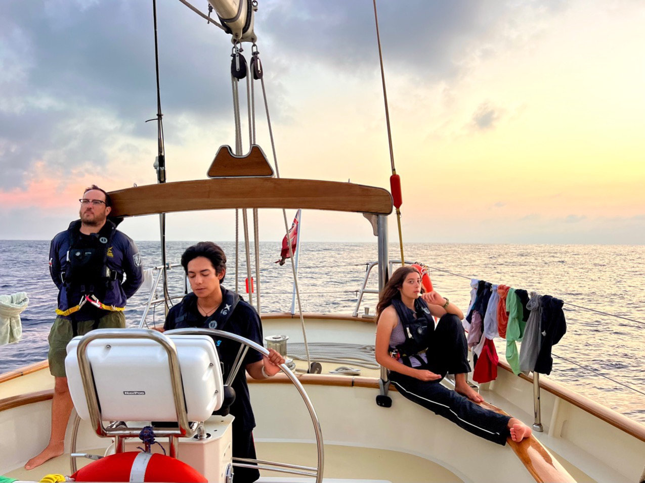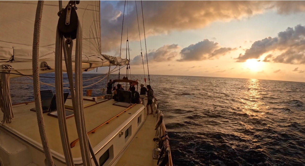 Hello everybody! Your fellow Norwegian girl is back as a skipper to tell you all about this amazing day at sea. My day started at 3.30 this morning when Kelsey woke me up for my shift that started at 4 am. Toby helmed for 1,5 hours just so he wouldn’t fall asleep. Chance, Emma, Anna, Penelope, and Felipe struggled to stay awake while Ash and Claire made sure that they did. I, however, was busy setting up my GoPro camera to do a timelaps-day-on-passage (one picture attached is from the timelapse). I don’t remember who won Forbs (guessing when the sun will rise), but my 06.07 was way off! The sunrise was beautiful as usual, and so was the nap I took after my shift ended at 8 am. A lot of people used the morning to study for the oceanography quiz that was coming up after lunch. Lunch was a really good pasta pesto with salad served by today’s head, Emma. Next, we had Oceanography and Leadership classes, with a little snack and chill time between the classes. The motor was running all day due to lack of wind, however all the dolphines in the sunset during our delicious pizza dinner made up for it! It is currently two days and 10 hours til our estimated arrival, and although we have had a great passage so far, we are all very excited for the Galapagos island. I almost forgot! Today, we had seven Fredricks bird-pooping at us during dinner; it was a blood bath. If you want to see the timelapse video, I will probably be posting it on my Instagram when I have internet again. 🙂 Thank you for today!!! Sandra