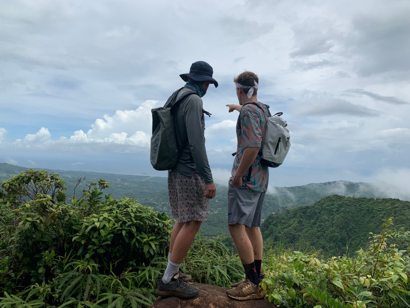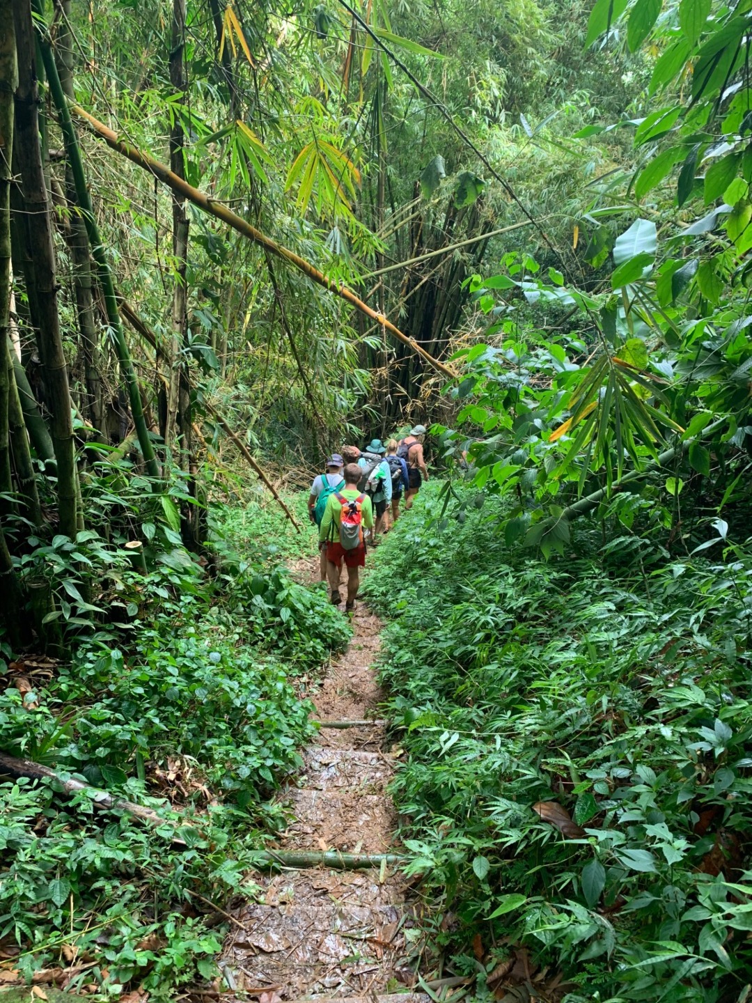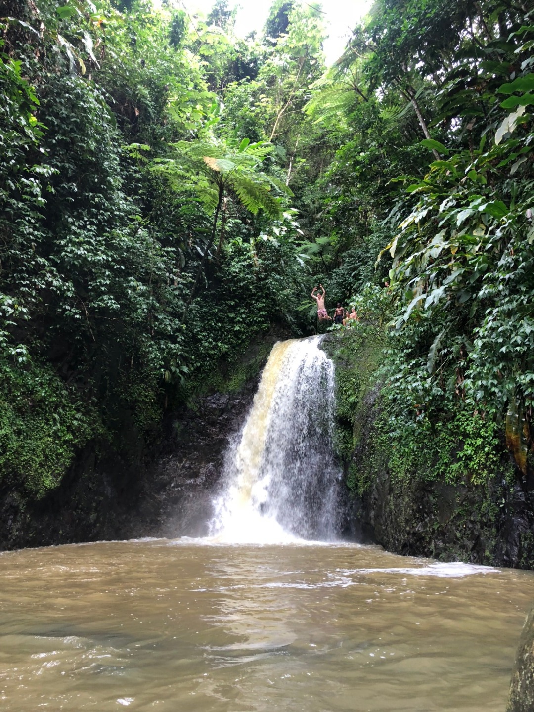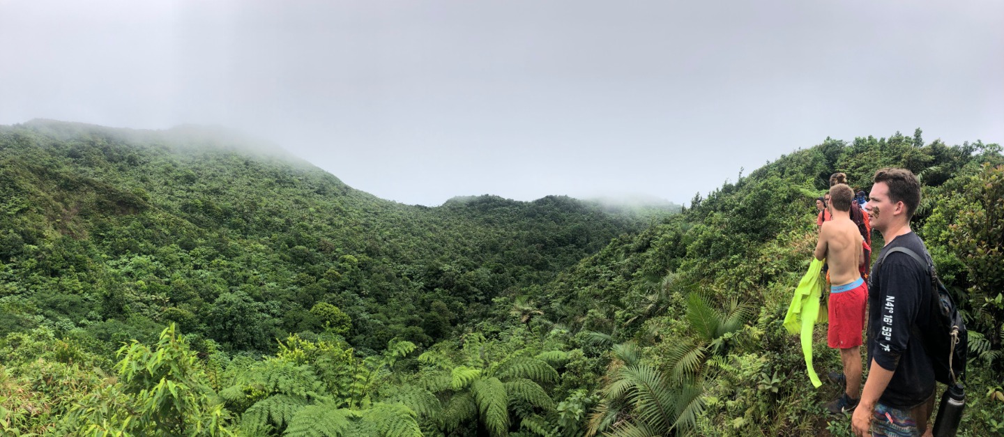 This morning as skipper, I had to wake everyone up, so I decided to play Brit Higgins “Winter” as loud as I could through the speaker. It started the day off on a great note because I watched multiple people go from sleeping to singing along in a matter of seconds. This tune is on apple music; y’all should give it a listen. After we brushed our teeth and ate breakfast that consisted of mini croissants and yogurt, we took to the dinghies and, through the pouring rain, headed to shore. We found shelter in a nearby restaurant and waited for our taxi. After a 30 minute ride, we were at the trailhead of Mount Qua Qua, all of us very unsure of the amount of mud we were going to face. After 5 minutes of climbing, we were in past our ankles. This did not stop us from reaching the top. We did have some fallen crew members along the way. Matt, being the first down, fell right in a puddle and hopped right back up and explained how the mud was healthy for his skin, and he was happier because he didn’t have to worry about getting muddy any longer. Next was Amy, who then led to Miranda falling and a chain reaction of butt sliding. Overall the hike was a very enjoyable mudslide in which we did reach the top of Mount Qua Qua. Next, we walked a few miles and met our guide for the waterfall tour. He took us for another short hike. When we came to the waterfall where we were all excited to clean off the mud and jump in, after all, but one of us jumped from the 30-foot waterfall, our guide showed us the natural waterslide. It was a bumpy ride. A group of us gathered at the bottom to watch people’s faces as they slid down. After we walked back to the road, we were picked up by a taxi. In no time, we were back on O-Star and eating yummy lasagna prepared by Carolyn and Jon.