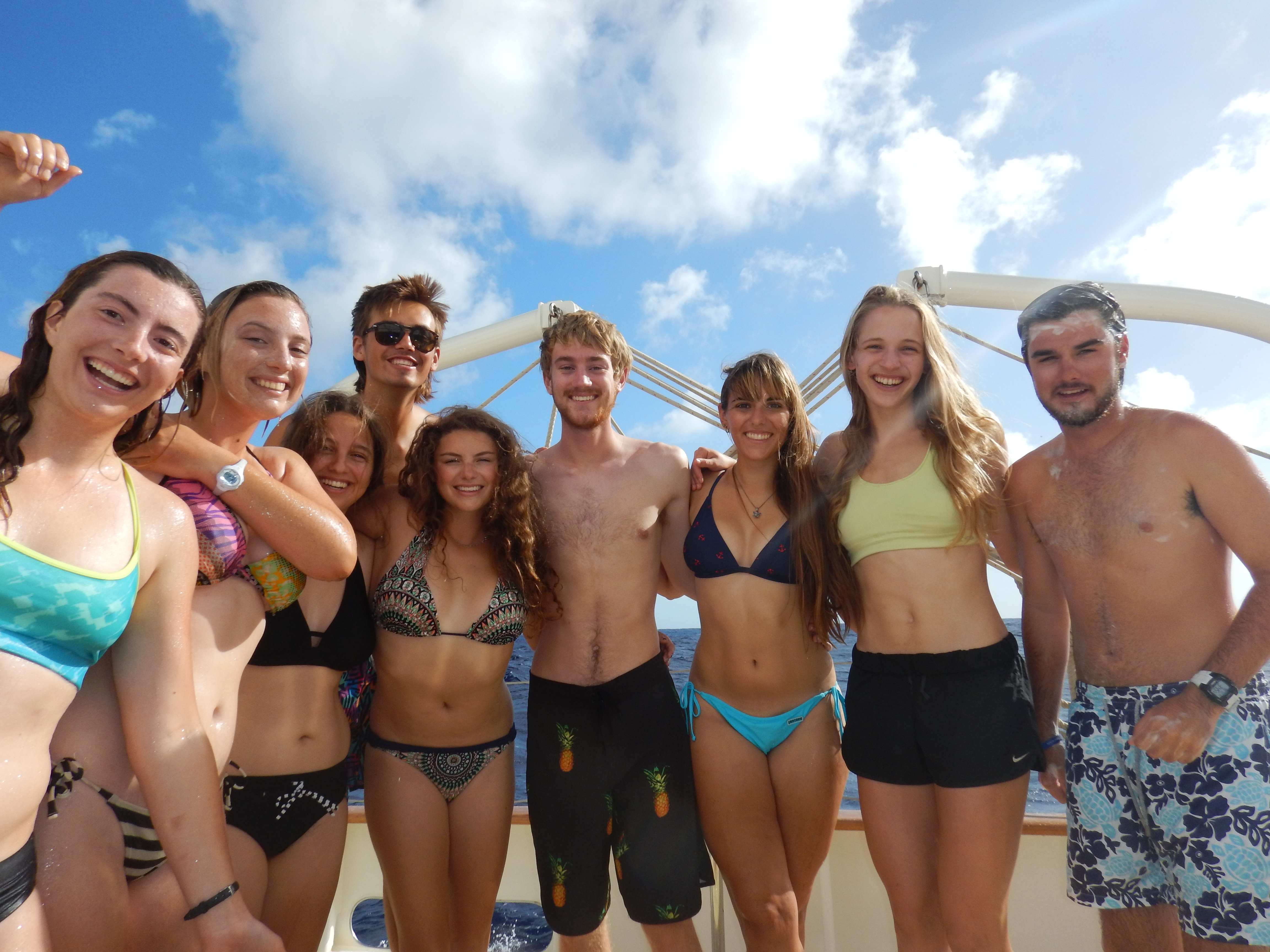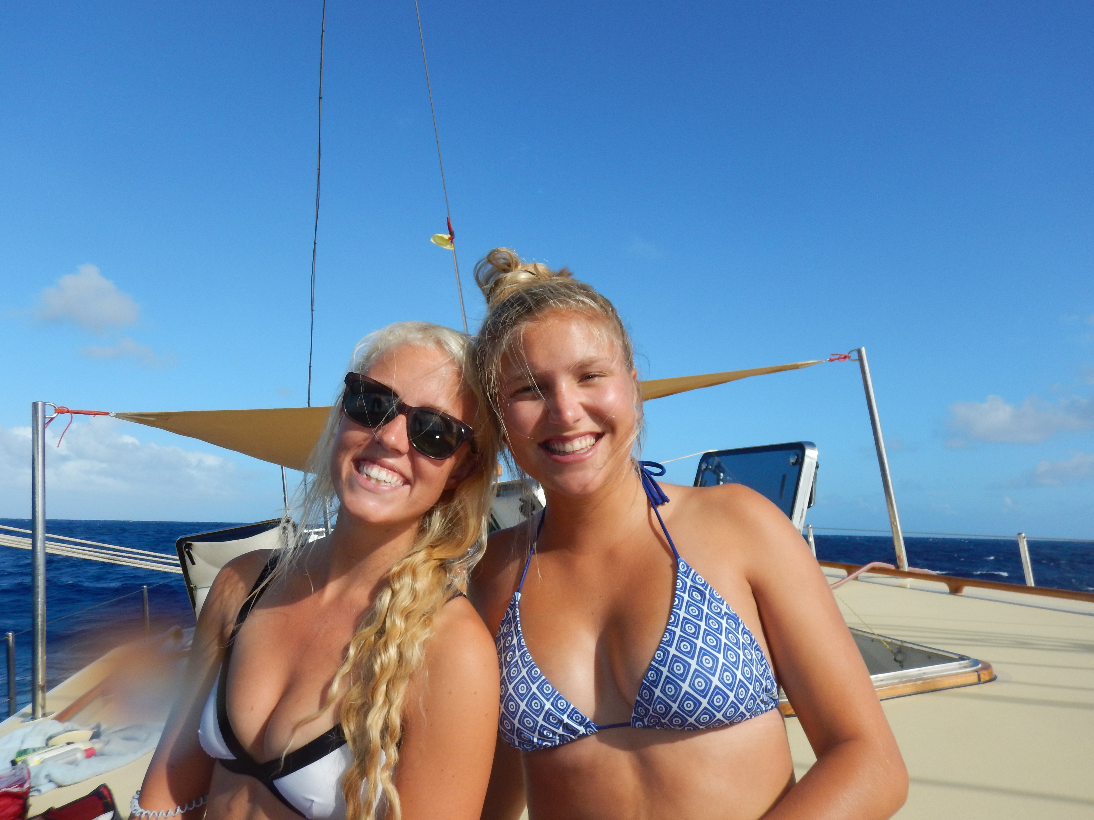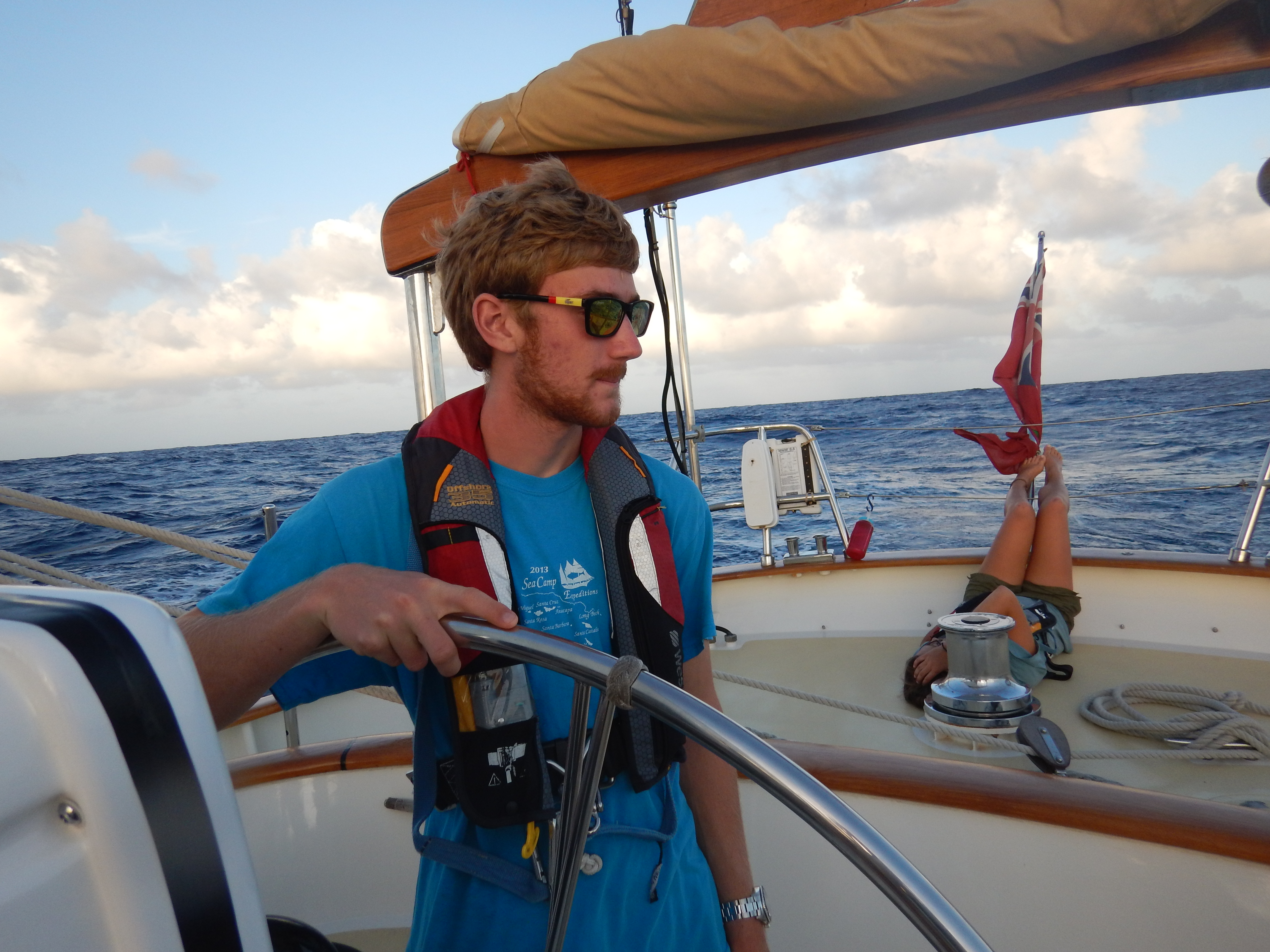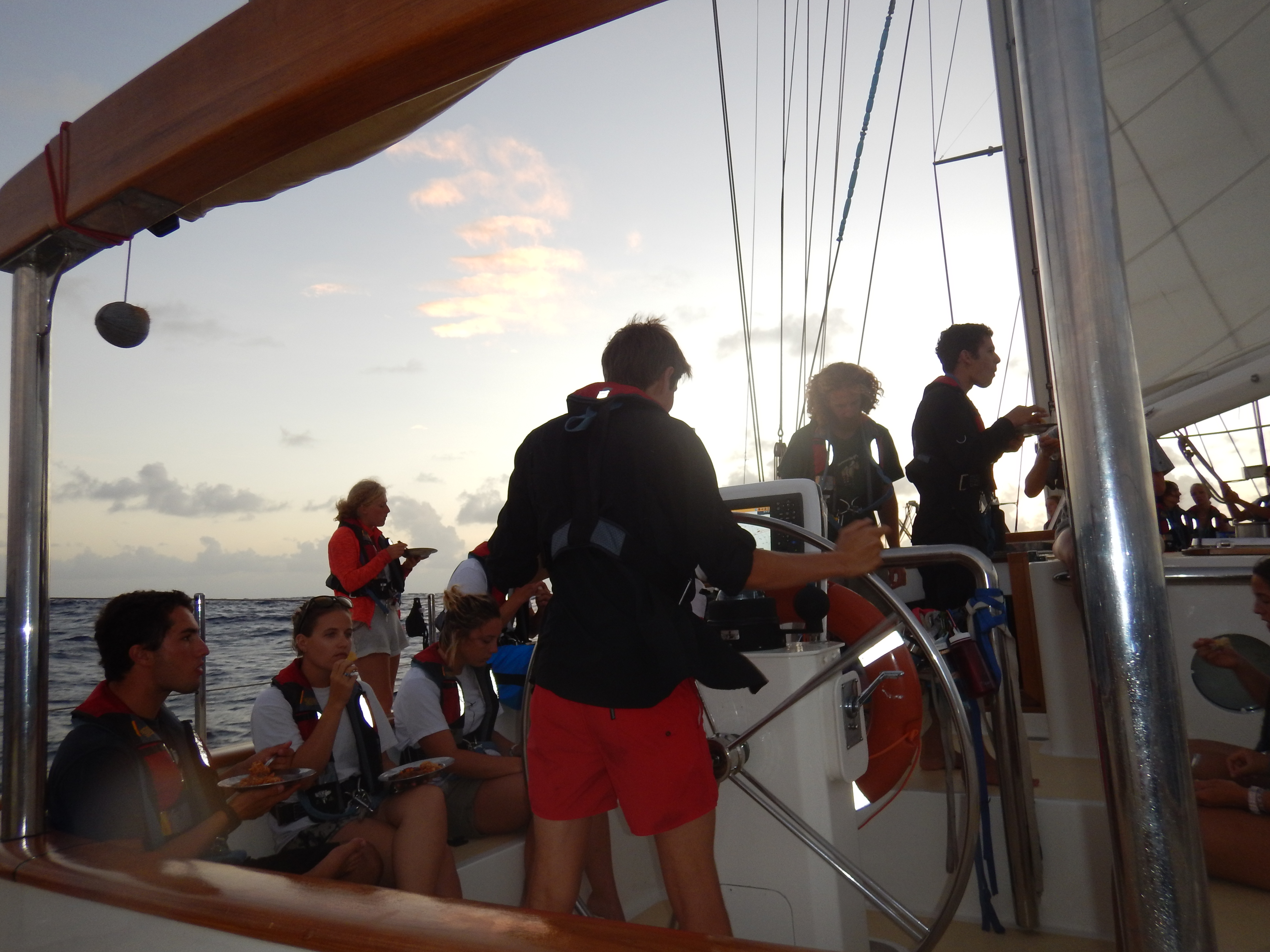 Seventy-one miles. That is the distance until we reach our waypoint in Dominica. It’s strange to look at our navigation equipment and charts and actually see a destination instead of the sameness of the middle of the ocean. Today was like many of our days on passage, a mixture of downtime and learning. Before lunch, I met with some of our aspiring marine biologists. We talked about the best ways to find jobs and graduate school opportunities in the competitive world of marine biology. As our provisions of fresh food run low, we get creative with what we have. Kiara, Townes, and Brahm served peanut butter and jelly on homemade bread with a fruit salad on the side! We are excited about Dominica and eating fruit that did not spend a good portion of its life in a can. After lunch, the students learned about climate change in Oceanography class and began to review for their final navigation exam in sailing class. We are all eagerly awaiting the arrival of land and cannot wait to begin showering daily in the crystal, clear Caribbean waters. But I will miss being out on the open ocean, watching birds foraging for fish, dolphins riding our bow, and especially the camaraderie that is established when you have nothing else to do but sail west and enjoy each other’s company.