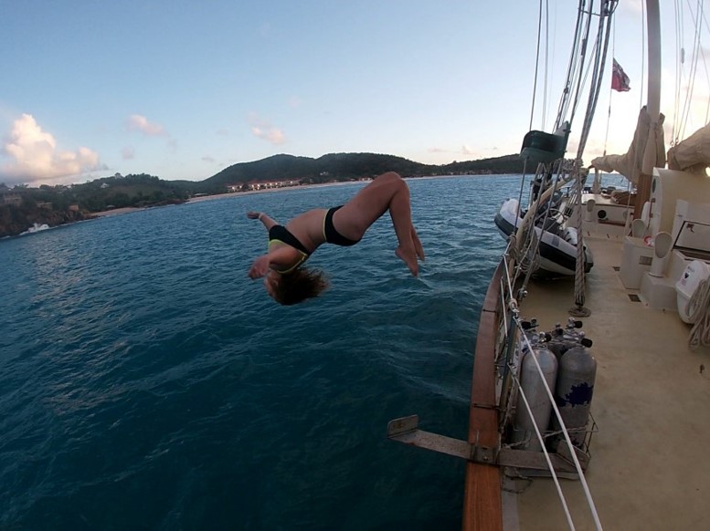 We did plan on doing a night snorkel at the Tobago Cays, but the conditions were a bit sketchy. So, when we were in St. Lucia, we were pretty anxious to be able to partake in this mysterious event. When the day came, or should I say night, Amanda warned us that there might be too strong of a current to be able to do it that night. However, she tested out the water near Ocean Star, and near the shore, and decided that strong swimmers would be able to partake. As many of our classmates stayed down below working on assignments, Isabel, Tye, Faith, Kenz, and I were very excited and suited up. We all went overboard, you know what I mean, and swam out in the dark with nothing but our torches (flashlights) giving us light. Now I would also like to inform you that my snorkel was no longer having difficulties after I had rinsed it with fresh water following the Tobago Cays snorkel, but I digress.