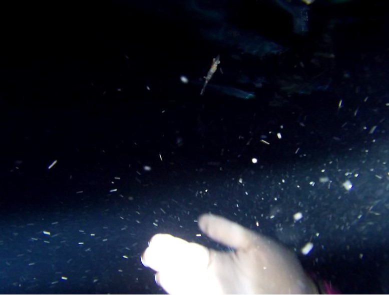 We swam back to the boat, and everyone was chucking up their fins when I decided to look down at the drop off that we were moored on. As I looked down, I saw a large orange blob approach me, and I began to retreat but then noticed some familiar-looking creatures. About five tiny squids emerged and swam towards my mask as I began filming and started to yell, LITTLE SQUIDS! I did get Tye and Amandas attention as the invertebrates dove once more into darkness.