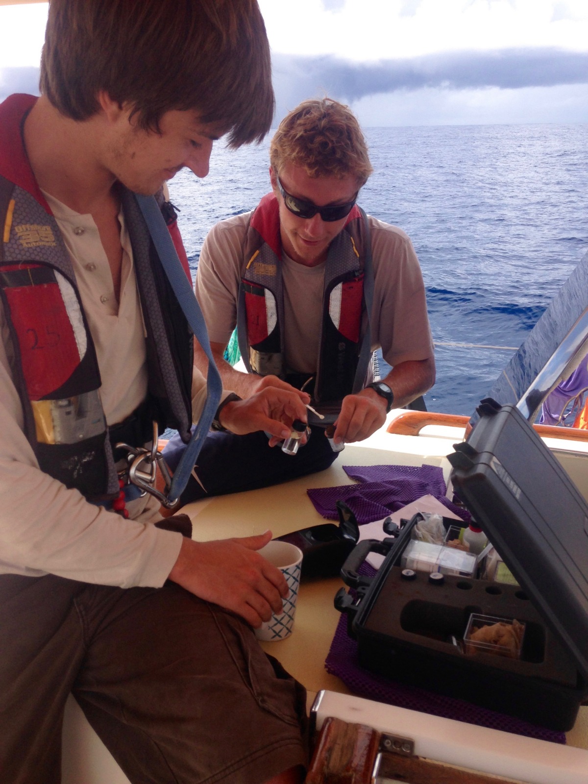 This morning, I, along with the rest of watch team 3, was on the 8-12 am watch. I started out with a stint on bow watch and enjoyed a beautifully bright rainbow that looked like it was being rained straight out of the large, puffy cloud above it. We then stayed busy conducting some science – first collecting a water sample and filtering it through two types of filers (one for nutrients and one for microorganisms), which we will send to the Indigo V Expeditions group, which is conducting research on the health of the oceans by sequencing the DNA of all of the microorganisms (mostly phytoplankton and bacteria) found in it. Jack and a few others then switched over to some nutrient sampling of their own, which they are collecting for their oceanography research projects. That group is looking at the levels of nitrogen and phosphorus in relation to our distance from land. Other projects going on include a cetacean survey as well as a fish survey (this one also ends up with us getting some delicious tuna for dinner some nights), both looking at species diversity and abundance with relation to our distance from seamounts and other areas of upwelling. Another group is monitoring plastics in the ocean, while the last is keeping track of our meteorological conditions while on passage, with special attention to the types of clouds and any correlation between this and barometric pressure or wind speed. (In case you couldn’t tell, I am the oceanography instructor onboard.) After lunch, everyone worked on practice problems for navigation; we have completed all of the theory and are now just working on our skills to prep for the upcoming Nav master exam. Those who are choosing to pursue their Rescue Diver certification then met in the salon to go over the first set of knowledge reviews, and everyone else enjoyed some time to work on assignments or hang out up in the cockpit.