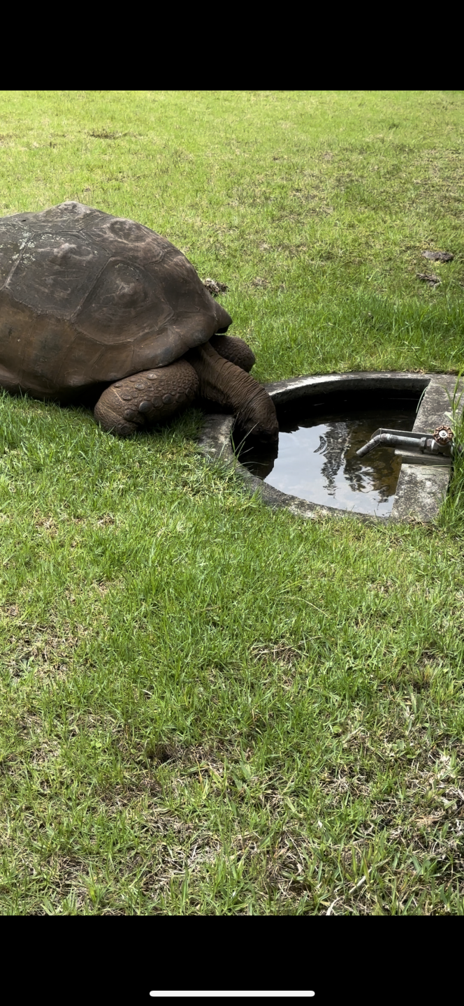 Right around the corner from the Shrodinger’s Cow waypoint was the Governor’s Plantation – home to 4 giant tortoises, including the world’s oldest giant tortoise (and maybe the oldest anything??) named Jonathan, who recently celebrated his 192nd birthday. We were lucky, and Jonathan came right up to the fence to drink some water – and let me tell you, pretty limber for a 192-year-old! He was moving quickly, and then we saw the Governor’s black lab run outside, which may provide an incentive for his agility into old age. Anyway, he might’ve moonlighted as a pirate or frat boy somewhere in those 192 years because Jonathan can DRINK! He had his entire head submerged in this pond for minutes at a time. Honestly, we were getting nervous we were going to witness Jonathan’s demise at one point, but then he sauntered away a few steps before collapsing in the grass, at peace with the world around him and raising many questions about his sentience.