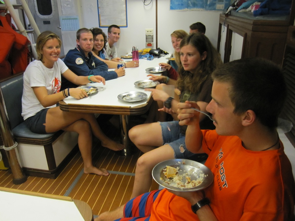 Everyone was pleased as we gorged ourselves with Maltesers and M and M’s. Our first Advanced Diving course was next (for those who are taking it). Britt taught us the ins and outs of Deep Diving and Night Diving to prepare us for our dives in the Caribbean. Shortly after, Holden and Staige caught us a 15-pound tuna!! The excitement was high as Holden perfectly filleted the baby tuna for Beasley to prepare for dinner. The crew split up after that; most went to take a nice 2-hour nap before dinner, and others did some work while Watch Team 1 stayed on deck to keep watch. I was lucky enough to stay on bow watch with Karl, Liza, and Biz.