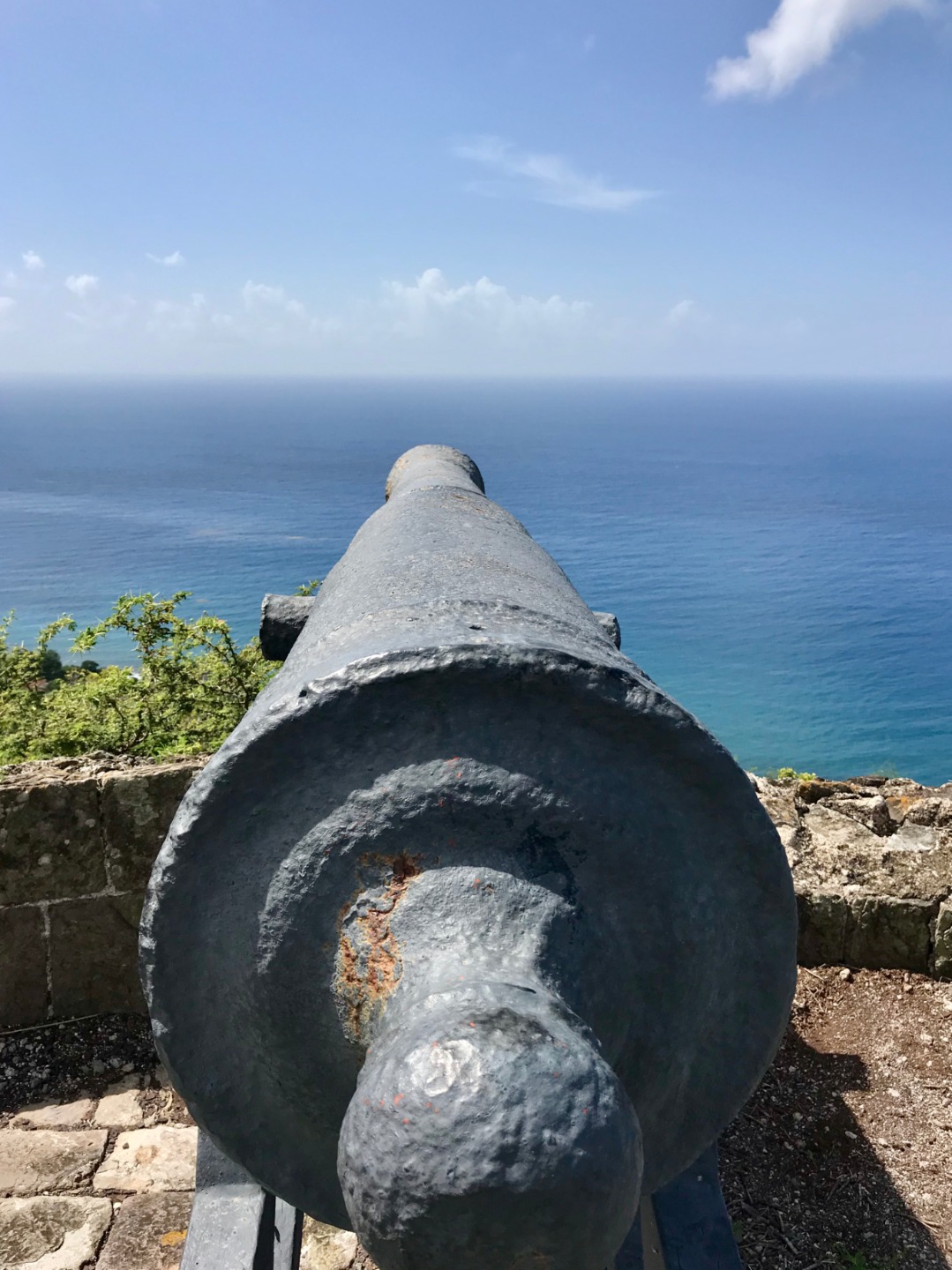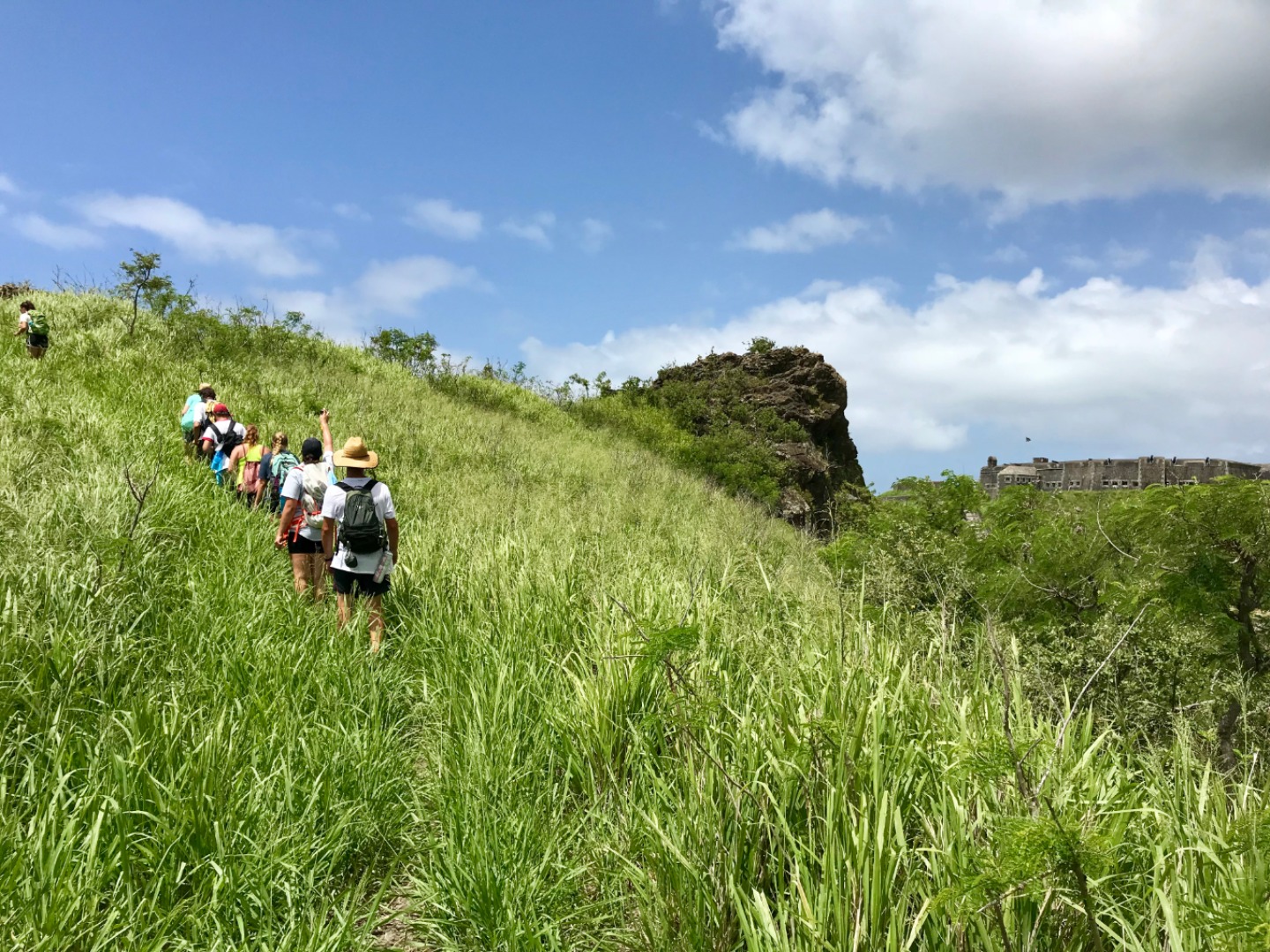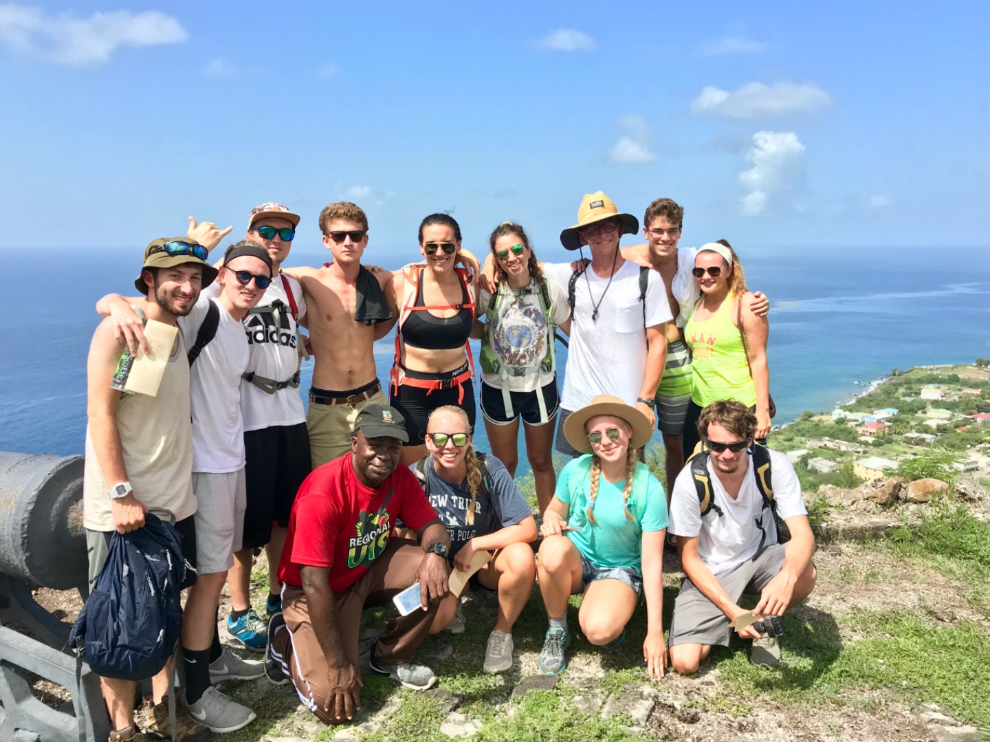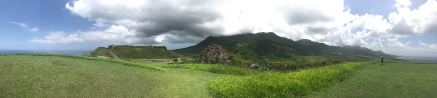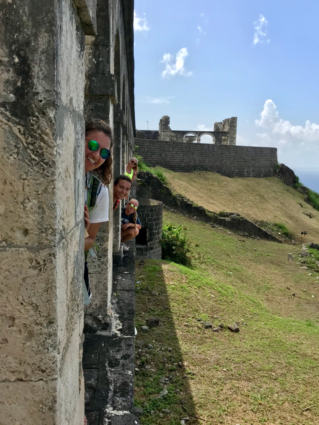 This morning we woke up to the smell of bacon and eggs. Breakfast was absolutely phenomenal; we crafted our own breakfast sandwiches from toast, bagels, scrambled and fried eggs, as well as crispy bacon. Next, we headed the dinghy into shore on St. Kitts for our hike up to Brimstone Hill Fortress National Park. We enjoyed a tour on our way to the edge of the trail with our taxi driver and tour guide, Magic, who told us all about the island and how the French and British had fought over the territory years ago. A fun fact we also learned was that Samuel Jefferson (The great-great-grandfather of Thomas Jefferson) had lived on the island and owned a rum distillery. The initial trail hike up to the main path was short and steep, and from there, we gradually made our way up to the highest point of the fort, taking boatloads of pictures on the way. Once we reached the base of the fort, we stopped to catch our breath and grab a few refreshments… some enjoyed a cold beverage while others enjoyed popsicles and fresh mangoes. Magic led us through the back to the fort, where he showed us the ropes that the soldiers used to sneak in and out of the fort. The view was breathtaking, and we saw where the soldiers would have parades, cannons, and at the top of the fort, we got to read about how the fort was run. It started to rain as we were heading back to the car, so we sought out shelter under an arch while Magic, so courageously, ran to get the car for us. Once we were back in town, everyone split up to get some lunch and hang out around the island until Irv (one of Ocean Star’s two dinghies) picked us up around 16:30. For dinner, we had a mini Thanksgiving, but instead of turkey, we had chicken. Overall, it was a great meal. However, the green bean casserole was no match for my mother’s recipe. The seamanship class directly followed dinne,r taught by Carolyn. We learned about different types of anchors, how to trim our sails, how to read the telltales, and different parts of the boat. Tomorrow we sail to Nevis, and I can’t wait to explore all the other islands to come!
