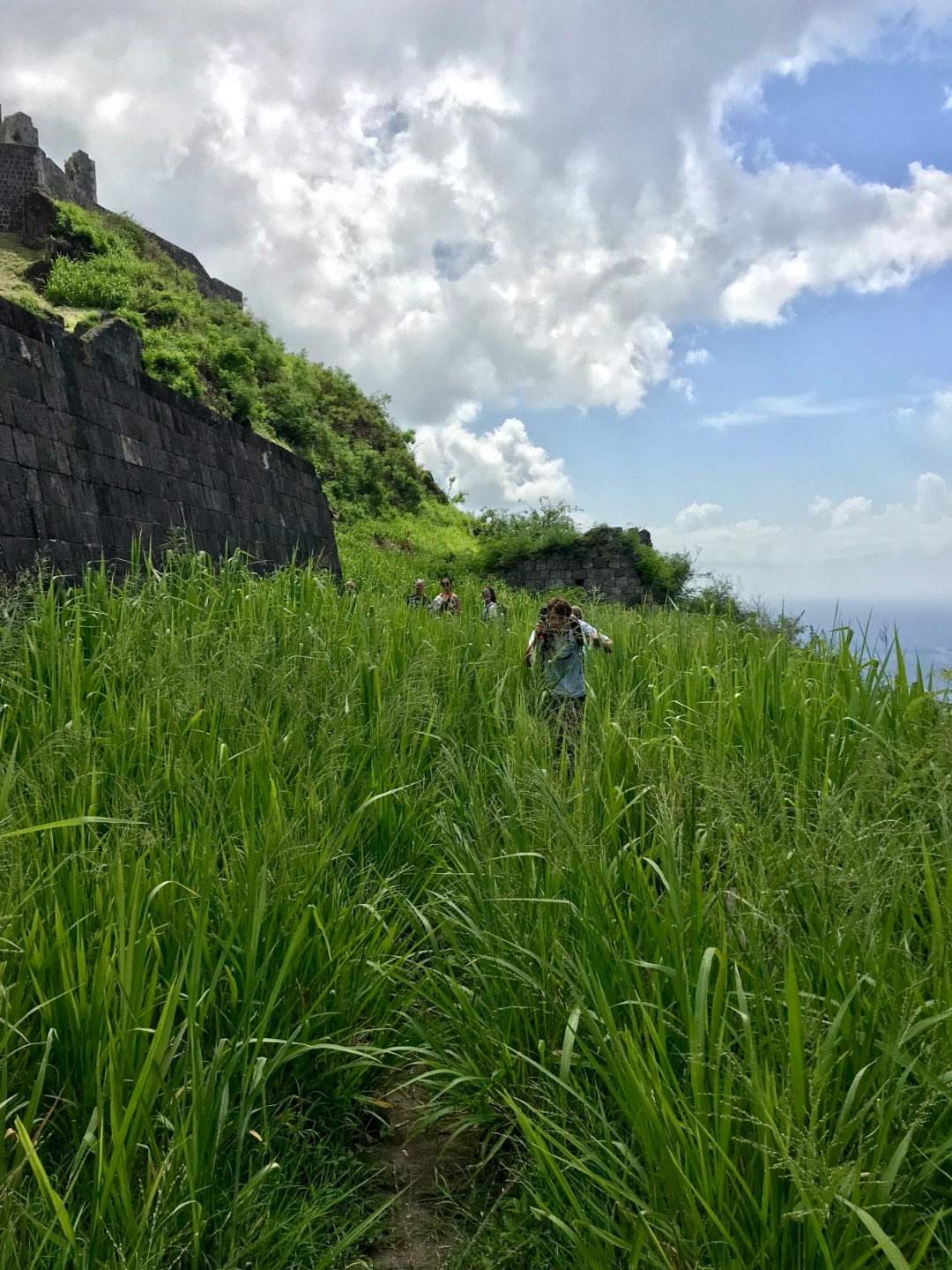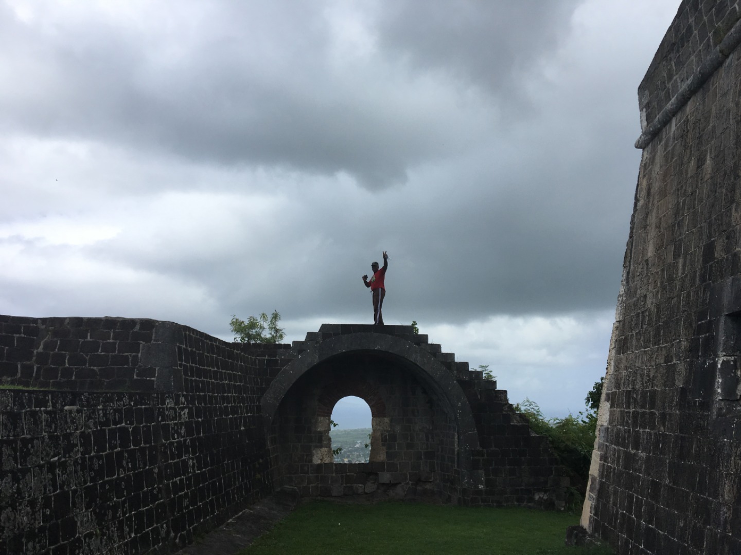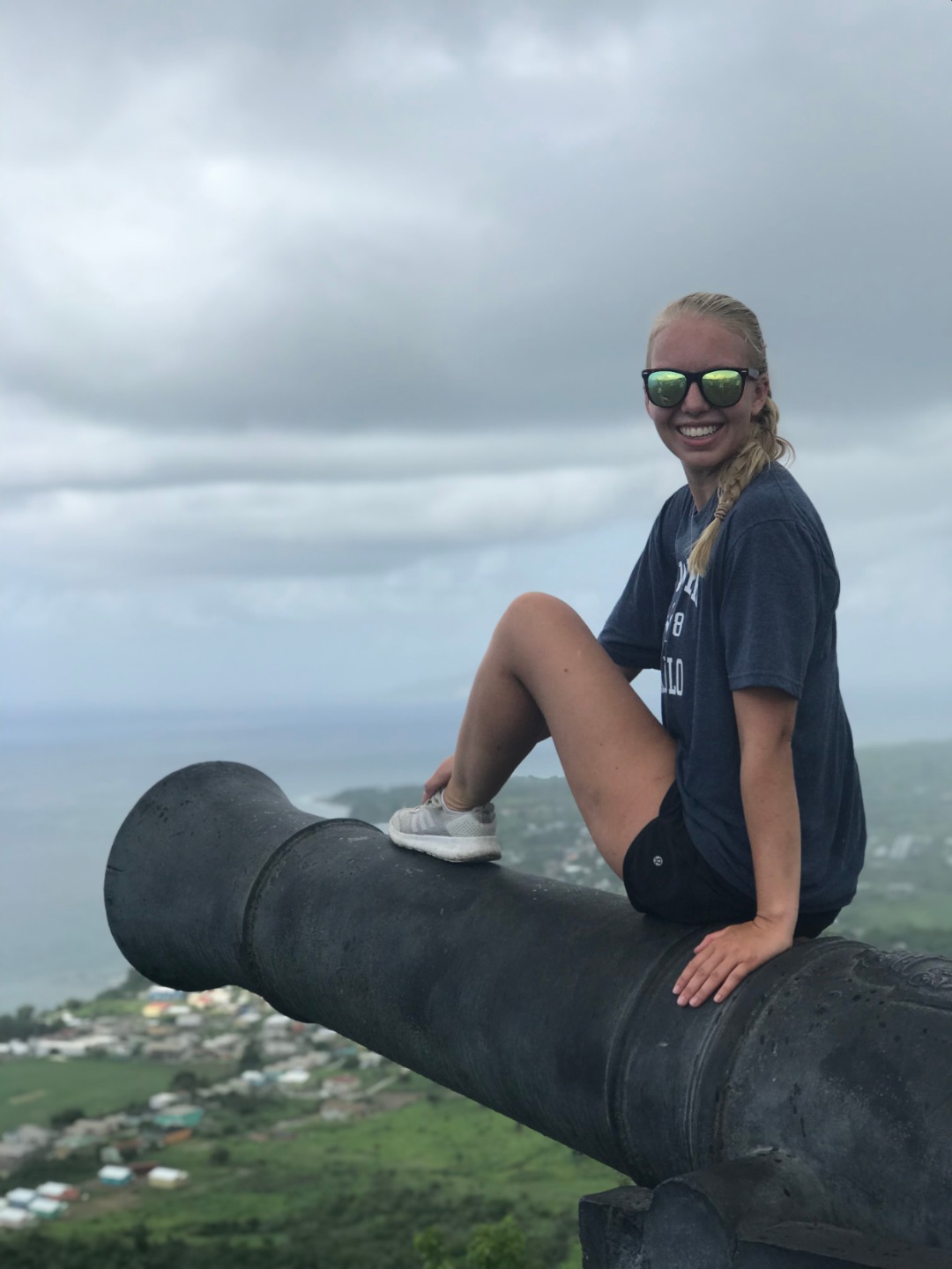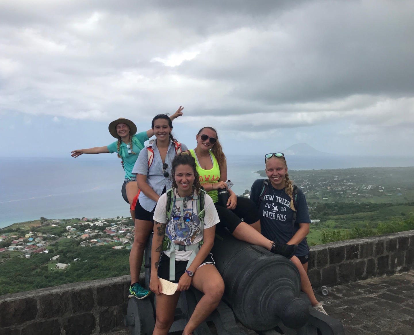 This morning we woke up to the smell of bacon and eggs. Breakfast was absolutely phenomenal; we crafted our own breakfast sandwiches from toast, bagels, scrambled and fried eggs, as well as crispy bacon. Next, we headed the dinghy into shore on St. Kitts for our hike up to Brimstone Hill Fortress National Park. We enjoyed a tour on our way to the edge of the trail with our taxi driver and tour guide, Magic, who told us all about the island and how the French and British had fought over the territory years ago. A fun fact we also learned was that Samuel Jefferson (The great-great-grandfather of Thomas Jefferson) had lived on the island and owned a rum distillery. The initial trail hike up to the main path was short and steep, and from there, we gradually made our way up to the highest point of the fort, taking boatloads of pictures on the way. Once we reached the base of the fort, we stopped to catch our breath and grab a few refreshments… some enjoyed a cold beverage while others enjoyed popsicles and fresh mangoes. Magic led us through the back to the fort, where he showed us the ropes that the soldiers used to sneak in and out of the fort. The view was breathtaking, and we saw where the soldiers would have parades, cannons, and at the top of the fort, we got to read about how the fort was run. It started to rain as we were heading back to the car, so we sought out shelter under an arch while Magic, so courageously, ran to get the car for us. Once we were back in town, everyone split up to get some lunch and hang out around the island until Irv (one of Ocean Star’s two dinghies) picked us up around 16:30. For dinner, we had a mini Thanksgiving, but instead of turkey, we had chicken. Overall, it was a great meal. However, the green bean casserole was no match for my mother’s recipe. The seamanship class directly followed dinne,r taught by Carolyn. We learned about different types of anchors, how to trim our sails, how to read the telltales, and different parts of the boat. Tomorrow we sail to Nevis, and I can’t wait to explore all the other islands to come!