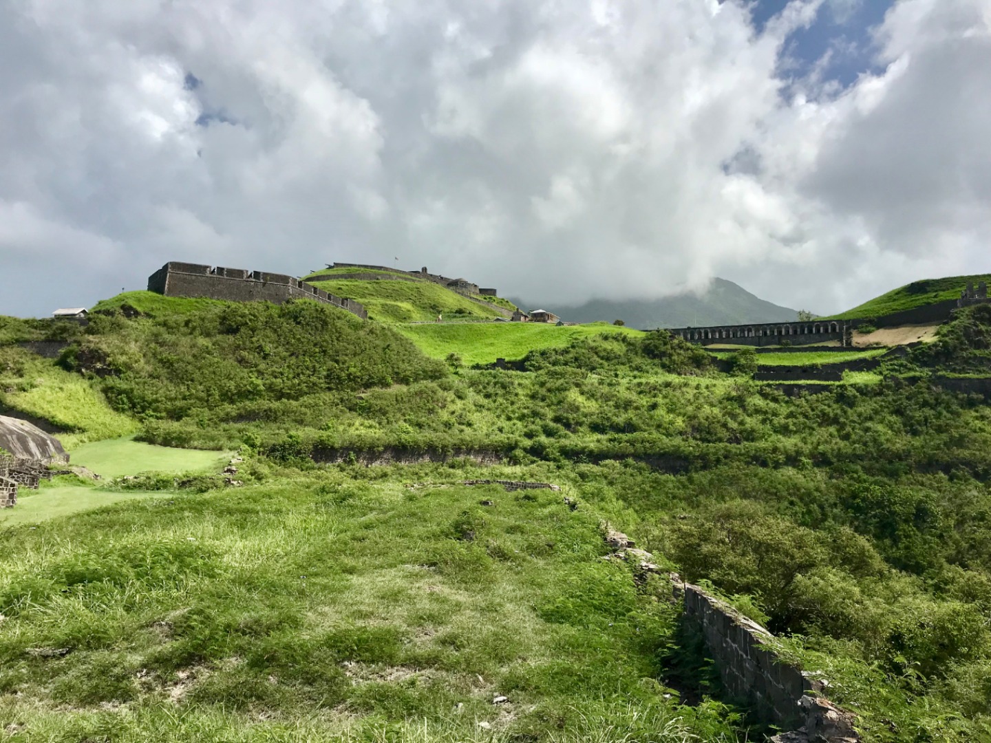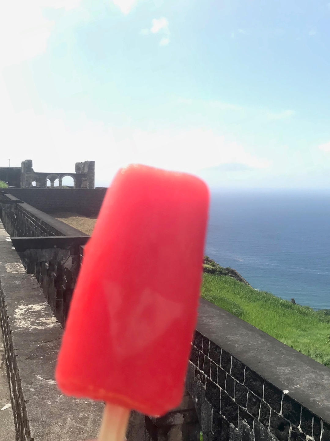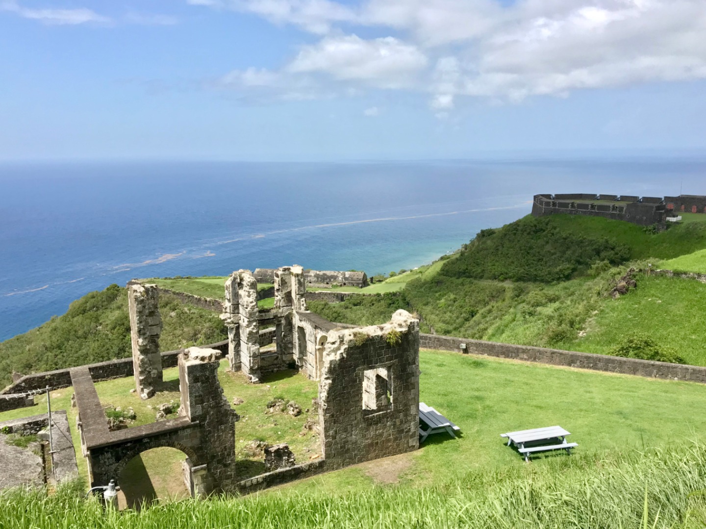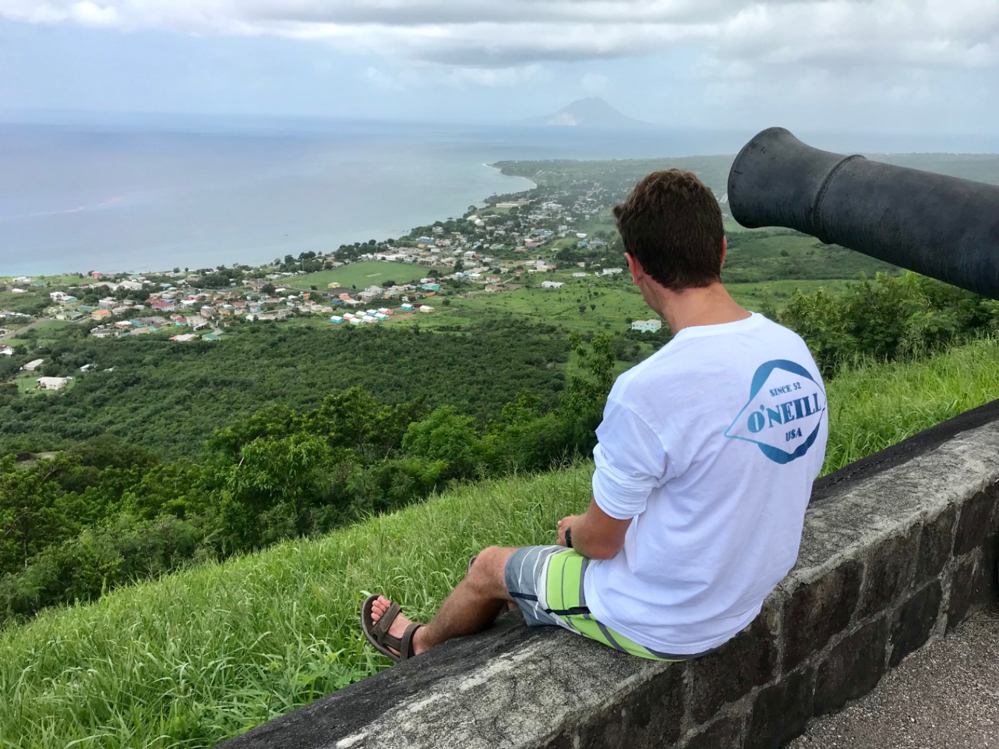 This morning we woke up to the smell of bacon and eggs. Breakfast was absolutely phenomenal; we crafted our own breakfast sandwiches from toast, bagels, scrambled and fried eggs, as well as crispy bacon. Next, we headed the dinghy into shore on St. Kitts for our hike up to Brimstone Hill Fortress National Park. We enjoyed a tour on our way to the edge of the trail with our taxi driver and tour guide, Magic, who told us all about the island and how the French and British had fought over the territory years ago. A fun fact we also learned was that Samuel Jefferson (The great-great-grandfather of Thomas Jefferson) had lived on the island and owned a rum distillery. The initial trail hike up to the main path was short and steep, and from there, we gradually made our way up to the highest point of the fort, taking boatloads of pictures on the way. Once we reached the base of the fort, we stopped to catch our breath and grab a few refreshments… some enjoyed a cold beverage while others enjoyed popsicles and fresh mangoes. Magic led us through the back to the fort, where he showed us the ropes that the soldiers used to sneak in and out of the fort. The view was breathtaking, and we saw where the soldiers would have parades, cannons, and at the top of the fort, we got to read about how the fort was run. It started to rain as we were heading back to the car, so we sought out shelter under an arch while Magic, so courageously, ran to get the car for us. Once we were back in town, everyone split up to get some lunch and hang out around the island until Irv (one of Ocean Star’s two dinghies) picked us up around 16:30. For dinner, we had a mini Thanksgiving, but instead of turkey, we had chicken. Overall, it was a great meal. However, the green bean casserole was no match for my mother’s recipe. The seamanship class directly followed dinne,r taught by Carolyn. We learned about different types of anchors, how to trim our sails, how to read the telltales, and different parts of the boat. Tomorrow we sail to Nevis, and I can’t wait to explore all the other islands to come!