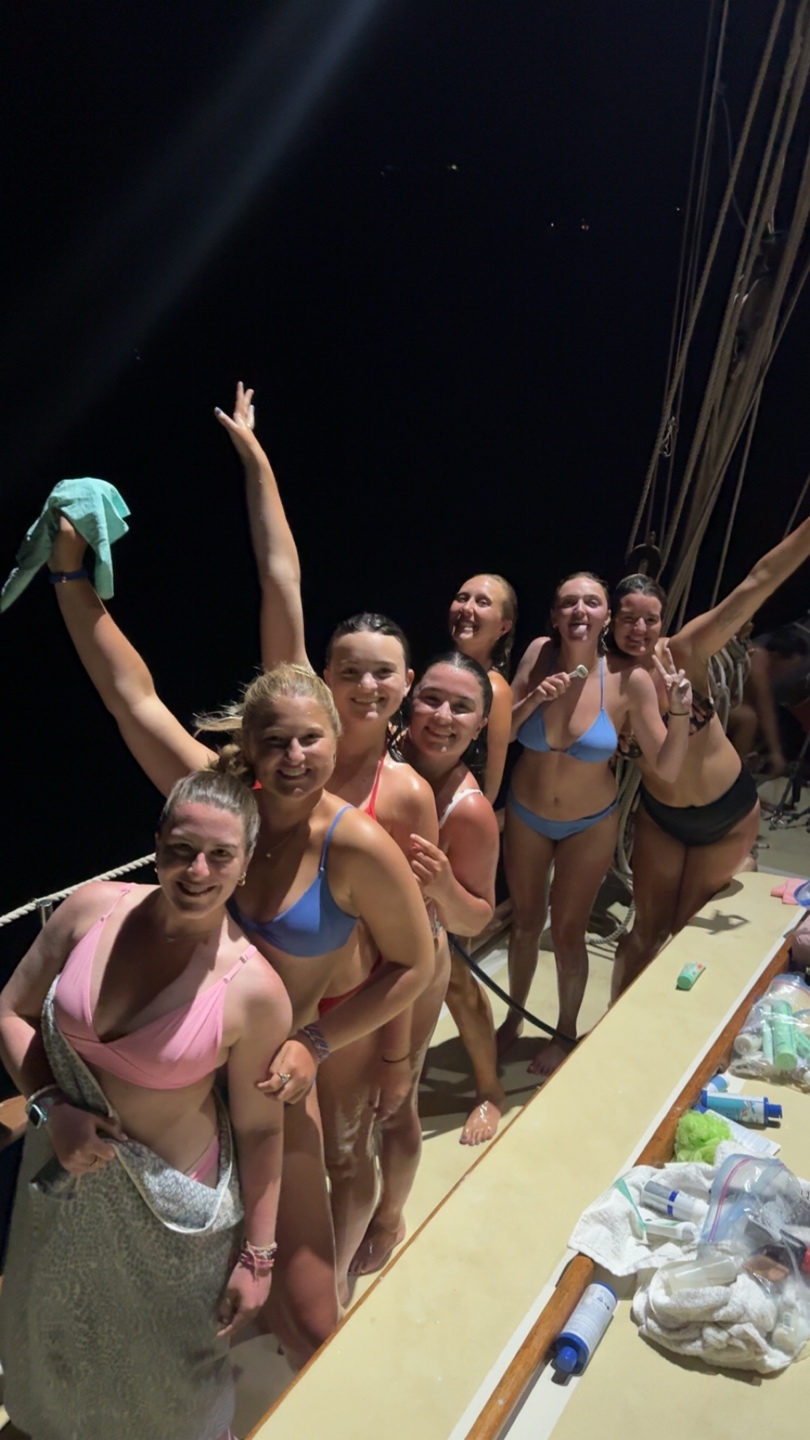 Having our classroom be the cockpit of our beautiful ship was an amazing experience. We received a brief history of sailing in the Pacific Islands and Mediterranean, including how sailboats evolved to sail upwind. We learned about the points of sail (irons, close reach, beam reach, broad reach, and running). We learned about tacking and jibing, and about the physics of sailboat sails and keels. Our lesson concluded with a knot-tying session where everyone learned and practiced to tie a bowline (an essential knot for every sailor). Our destination appeared on the horizon around 6 pm, and we were anchored and sailing down just before the sun set behind us in St. Barts. We had completed our first and longest passage, lasting about 25 hours and traveling about 100 nautical miles. The crew is excited to be on land soon! Surfing sounds like a possibility tomorrow, along with shopping, food, and drink in beautiful St. Barts.
