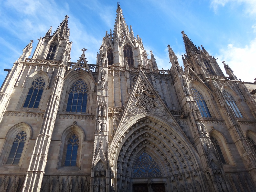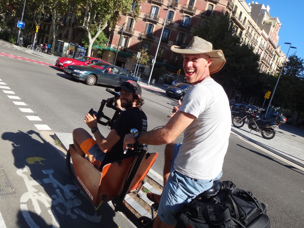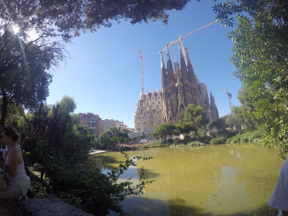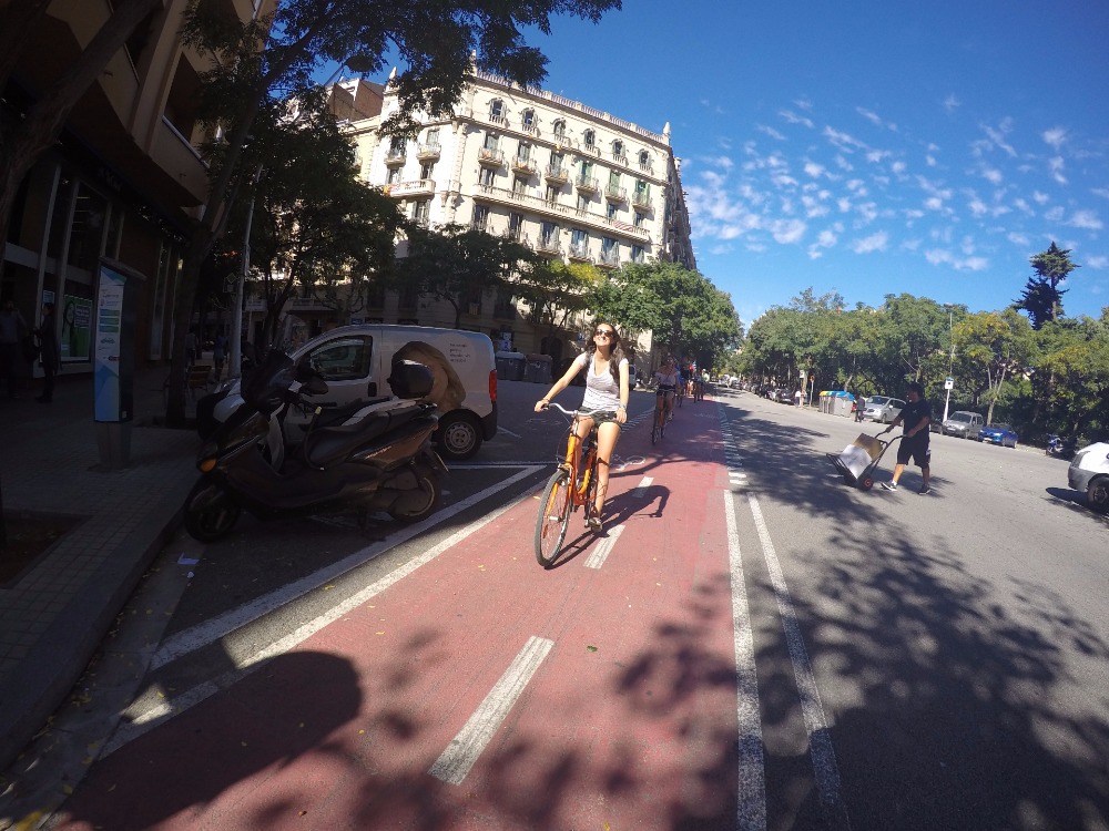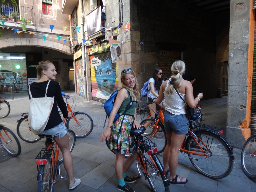 Good morning, Argo crew! It was time to rise and shine for everyone to catch the morning train for our day in Barcelona. Zigzagging through allies and side streets, we were headed to tour the beautiful city by Budget bikes. Sonya, Sydney, and I strolled over to a small cafe to grab some nom-noms before we headed out. After our croissants and cappuccinos, we were ready to leave in two groups to tour the city, especially Matt, who was being lugged in a basket with all his camera equipment while Kevin carted him around. The first stop of the chaos was the Arc de Triomphe. Then, we headed to the Sagrada Familia, which was a favorite stop along the way.