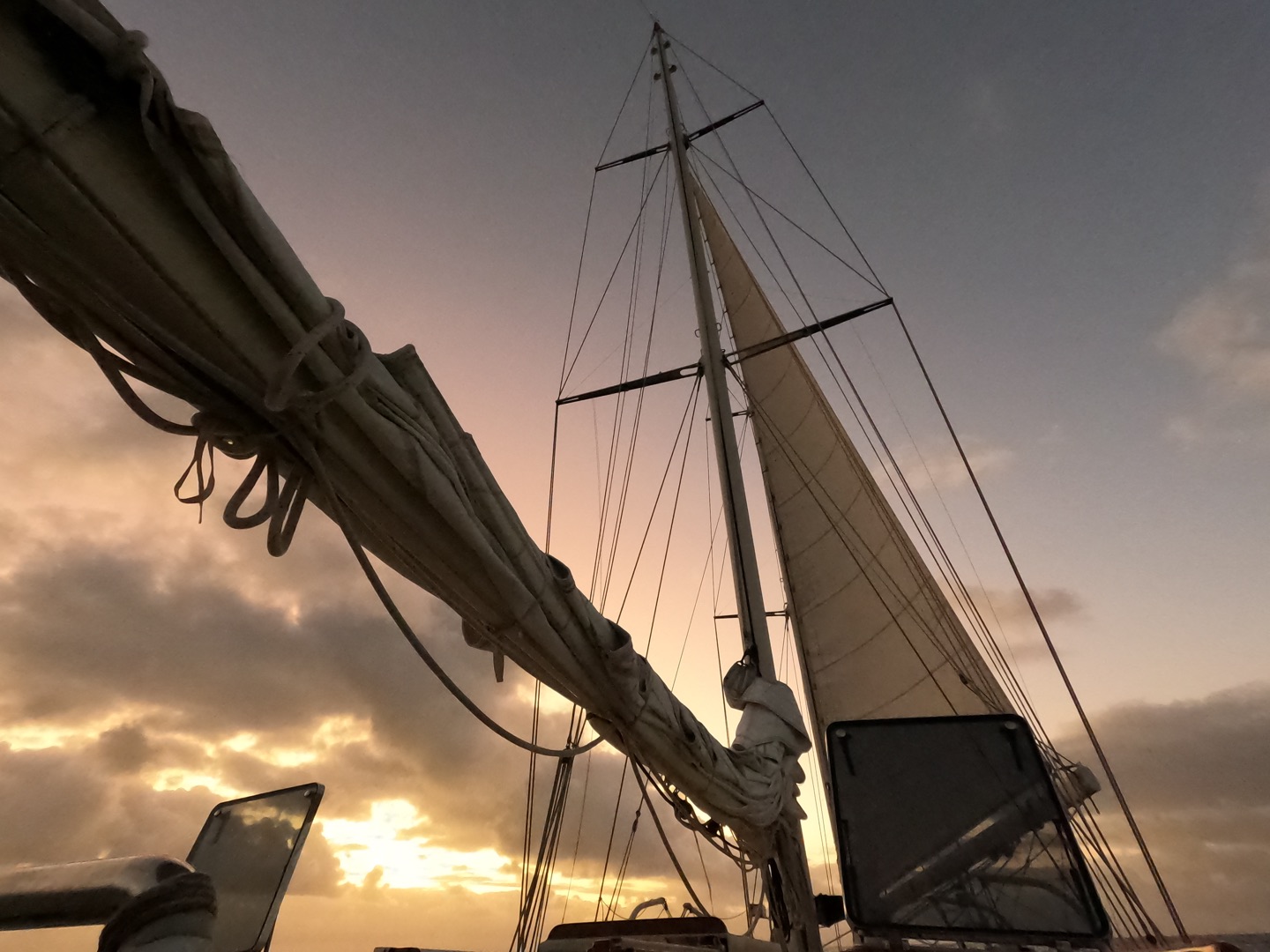 Calum cooked his mum’s famous pasta dish this evening with Darien and Kackie, as well as a brookie, which was fire, says Meg, for Eli and Dave’s birthday. However, cleaning the pan was not fire. says Meg. With Saint Helena being picked up on the radar now as we head into the night, the crew will sleep in keen anticipation for arriving at the anchorage by first light.