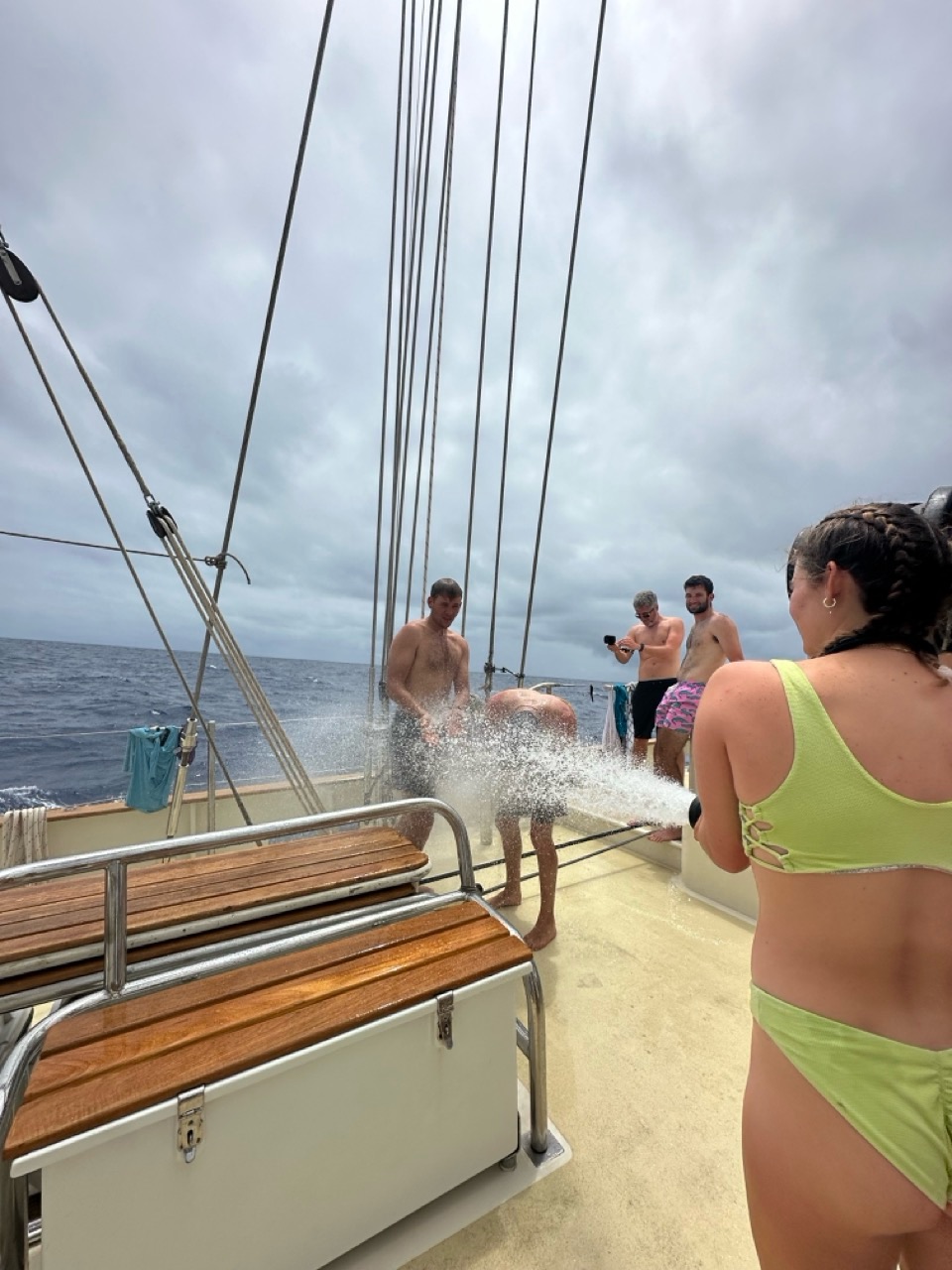 The wind backed and died on us last night so we turned on the engine to get us the rest of the way to Saint Helena. Some of the crew appreciated the slightly calmer conditions and subsequent helming, which took us into today. Despite it being Dave and Eli’s birthdays, watch teams 1 and 2 were awoken by a fire drill. Each watch team ran through their responsibilities in these scenarios: Watch Team 1 is in charge of deck operations, such as getting the fire hose ready, Watch Team Two getting medical and the engine room ready, and Watch Team Three sail handling. After we all mustered in the cockpit with type 1s, Gumbies, and fire extinguishers and fought an imaginary fire in the dingy, a deck shower with the fire hose was offered. The boys, myself, Calum, Dave, Shane, Benny, Zac, Isaac Eli, and Kackie, lined up for a spray down before we all gathered for lunch – a lovely sweet potato sandwich with homemade bread, sour kraut, and salad. Lunch was closed with a final time change, meaning we are now on GMT +/- 0!