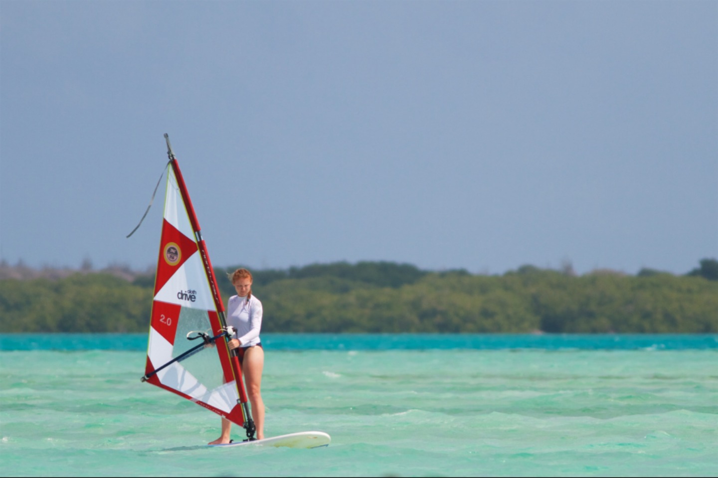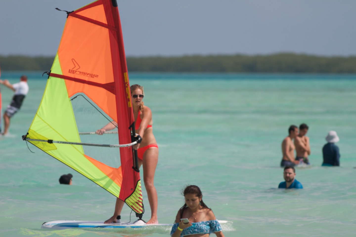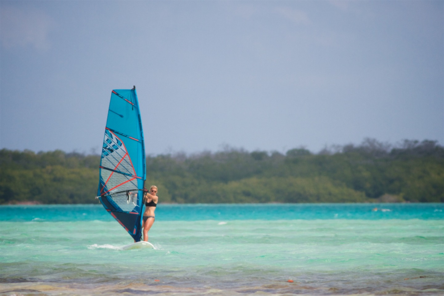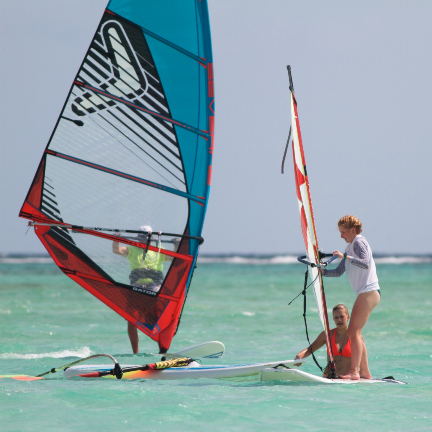 Pictured: London, Bianca, Eliza, and Sophie preparing for their windsurfing lesson; Bianca on the board; Sophie splashing around; Eliza getting the hang of it; Eliza and Sophie comparing techniques; Amy looking like a pro; Sophie enjoying the ride; the crew getting ready to go snorkeling; beautiful staghorn coral; wild yellow-shouldered Amazon parrot near the beach; the night dive crew.