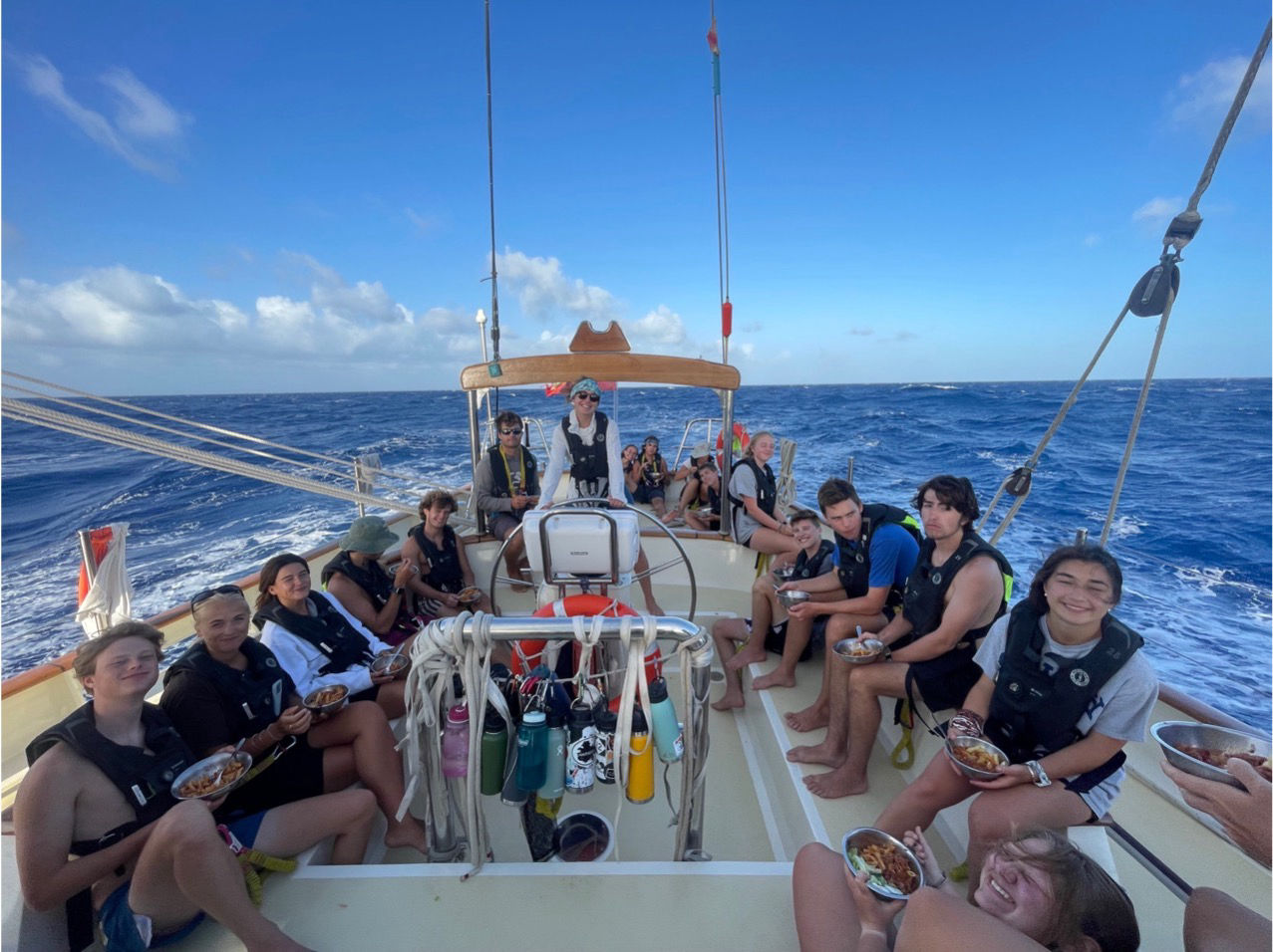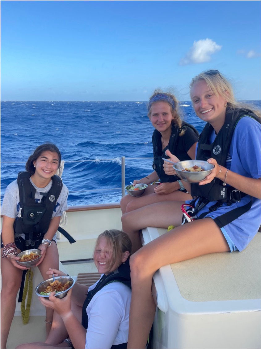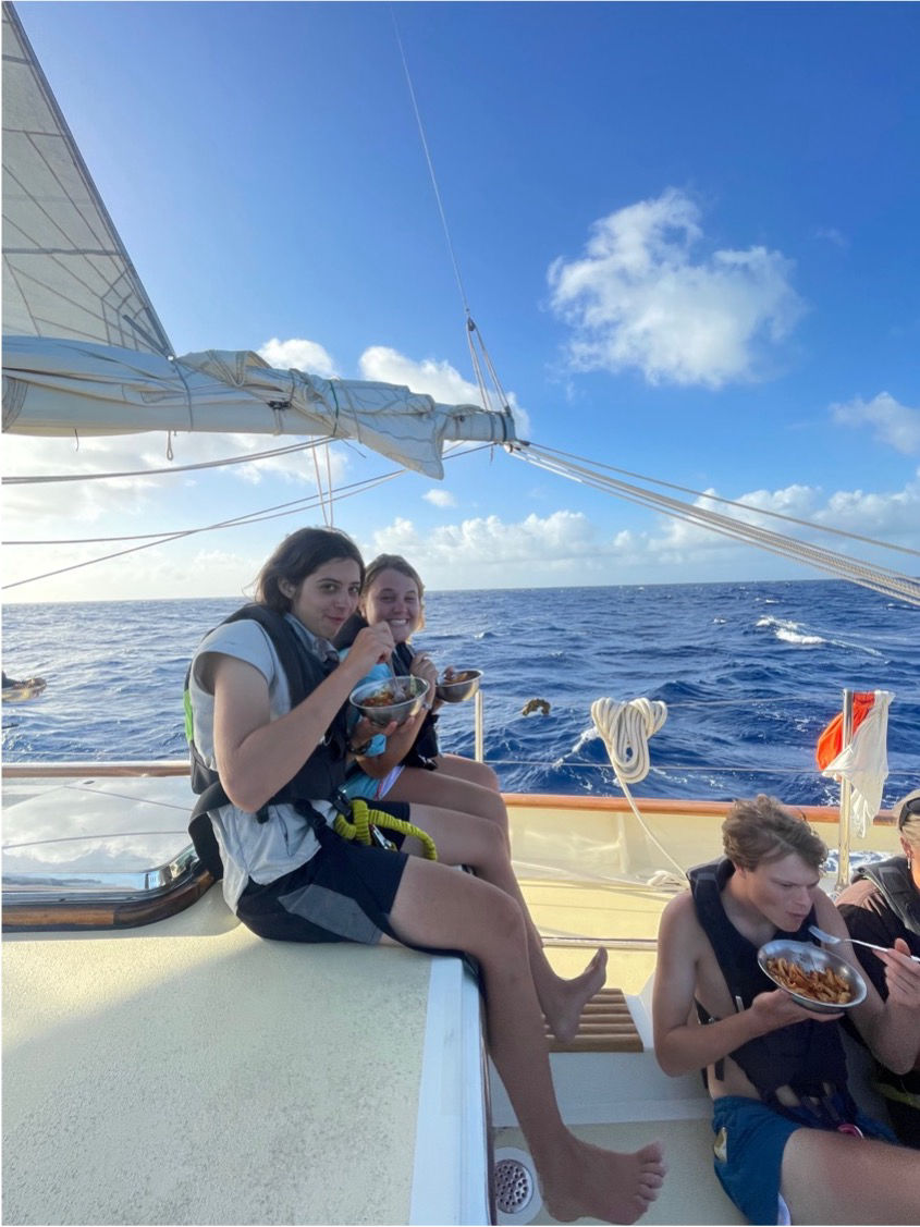 Panama, we’re coming for you! Today started with watch team one on the 12-4, which flew by as we told spooky stories, which then transitioned to funny stories so we’d all be able to fall asleep after. The wind has been consistently strong enough to keep Argo at a happy speed, and we’ve been cruisin’ since we left Bonaire. After all the watch teams transitioned throughout the early morning watches, everyone came up on deck for a lunch of bagel sandwiches made by the cheffy team: Chance, Gabe, and Emma. After lunch, we jibed to stay on course, and then everyone headed to the salon for an afternoon of Marine Biology and Leadership. We talked about the basics of biology, taxonomy, and how speciation occurs. The rest of the afternoon was divided amongst naps, cooking, PSCT class, and people on watch. The weather is still absolutely gorgeous out as the sunset is approaching. Here’s to another gorgeous day on Argo.
