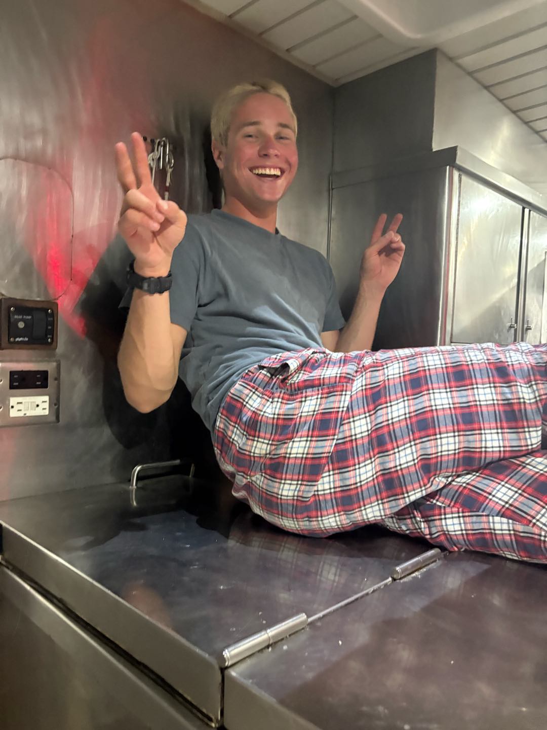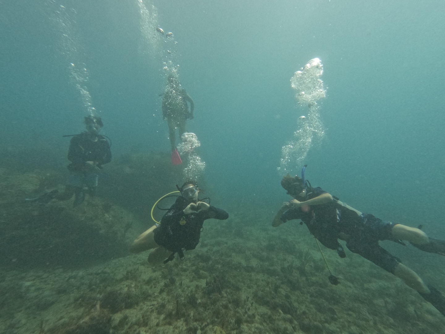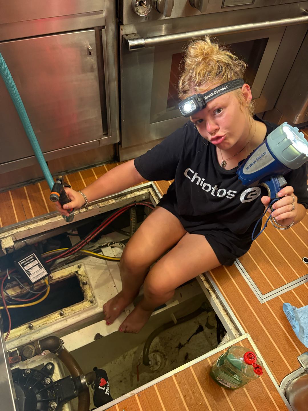 Breakfast consisted of eggs, bacon, fruit, and bread with a spread of peanut butter, honey, and jelly. We were truly spoiled. I was excited to take my nap after breakfast (gluttonous, I know), and then I was blessed and graced with the announcement that anyone who didn’t have dives to do (around 10ish people, me included) had a boat job to do: to clean the grey water tank. For reference, the grey water tank holds everything we say “out of sight, out of mind” to everything that goes down the drain. Whether that’s in the heads or in the galley. I took a minute to hang my head and embrace my loss before I stood up and began to get ready. I put on some clothes I was willing to get dirty, and got up on deck. Shane led the assignment, and my group consisted of Luca, Hailey, Gem, Matt, Bryson, and Emily. Our first task was the forward grey water tank, which- verbatim- Shane said actually smelled “quite nice”. I care to disagree. While Shane asked for volunteers to hose, I didn’t realize what I was signing up for when I raised my hand. I’m sure Hailey didn’t either. I’m only glad I wasn’t Matt or Bryson, because they had the short end of the stick, which was to shop-vac all of the water out in the first place. I don’t think words can describe the smell that came out of this tank. The tank was screwed shut with a long line-up of bolts, and one by one, as they were unscrewed, the smell got more and more pungent. Lovely. Bryson and I plugged our noses with toilet paper, but at one point, we accepted defeat and tried to get used to it. I could write a whole book on cleaning out the grey water tanks, but I think it would make all our readers lose their appetite, and honestly, I wouldn’t enjoy it. Honorable mention: Teagan and Amelia also greased the engine, my women in STEM.