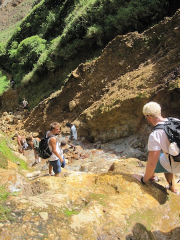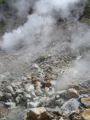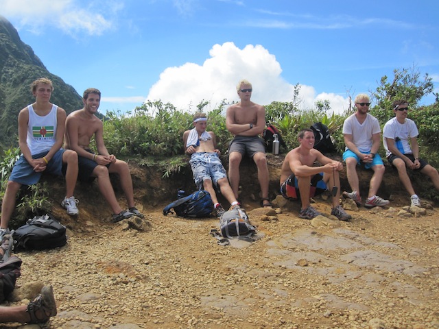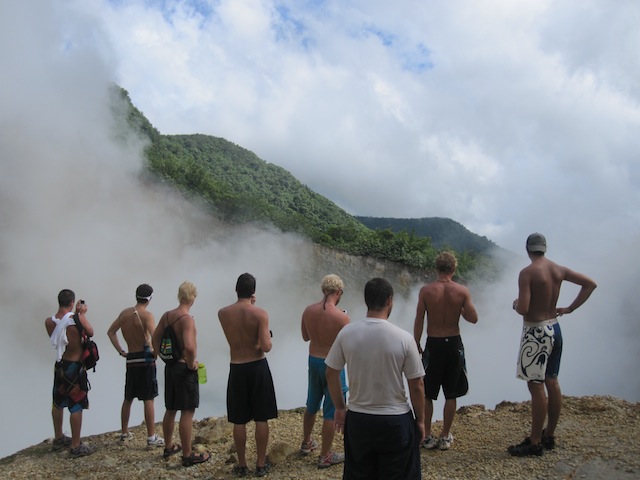 Today, we went on a gnarly all-day hike with Pancho through hot springs. I had woken up with pretty bad nausea, but I decided to go on the hike anyway because, even though Abigail and I lagged about an hour behind everyone else, it was so much better than staying on the boat all day, in my opinion. Also, I always find that I feel so much better, physically and emotionally, after a hike. Anyway, the beginning of the hike was pretty easy. Abbygail, Pancho, and I shared stories, and we found out that they were all Libras, along with Kristine, our marine biology instructor. The hike got pretty rigorous until it leveled off at the top of the mountain, where we witnessed the most beautiful view yet of all the mountains and hot springs. About an hour or a half down from there is where we ate lunch. Pancho boiled eggs for us in the hot spring and made us fresh juice with fruit, water, and sugar. Then we made mud masks and continued down for a little while until we got to the hot spring, which was cool enough for us to swim in. It was the most relaxing jacuzzi I’ve ever been in. After a few minutes of rejuvenation, we headed to the boiling lake, which looked pretty intimidating, especially standing so close. A few boys threw rocks in to see what would happen, but they just sank. Not too exciting. The hike up was brutal. Abbygail and I fell further behind and took a lot of breathers, but that’s okay because we get to see the scenery better when we go slower. When we got back to the boat, we dined on sausages, corn, and green beans. This evening, we finish up oceanography presentations, and tomorrow, it’s off to Portsmouth!