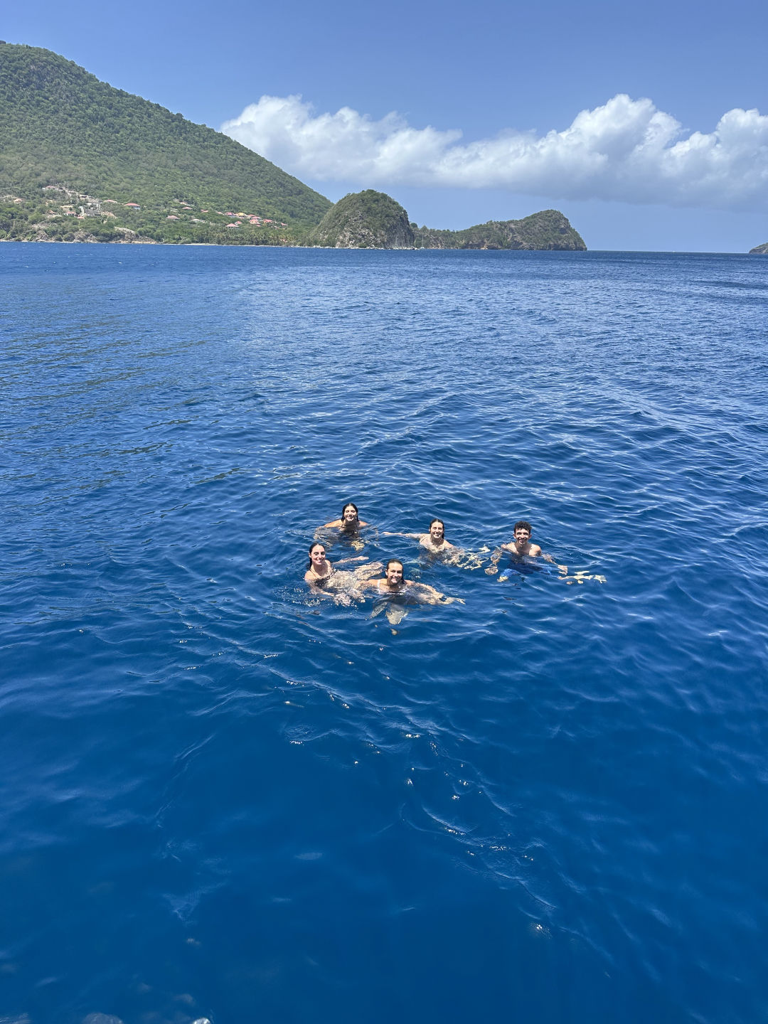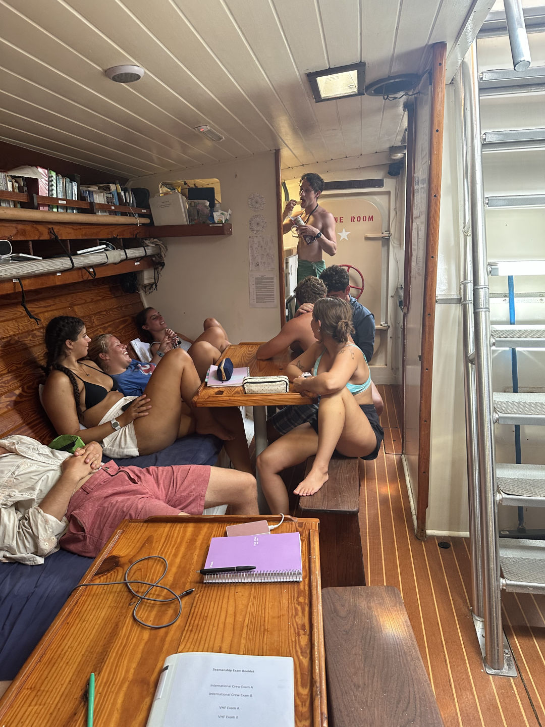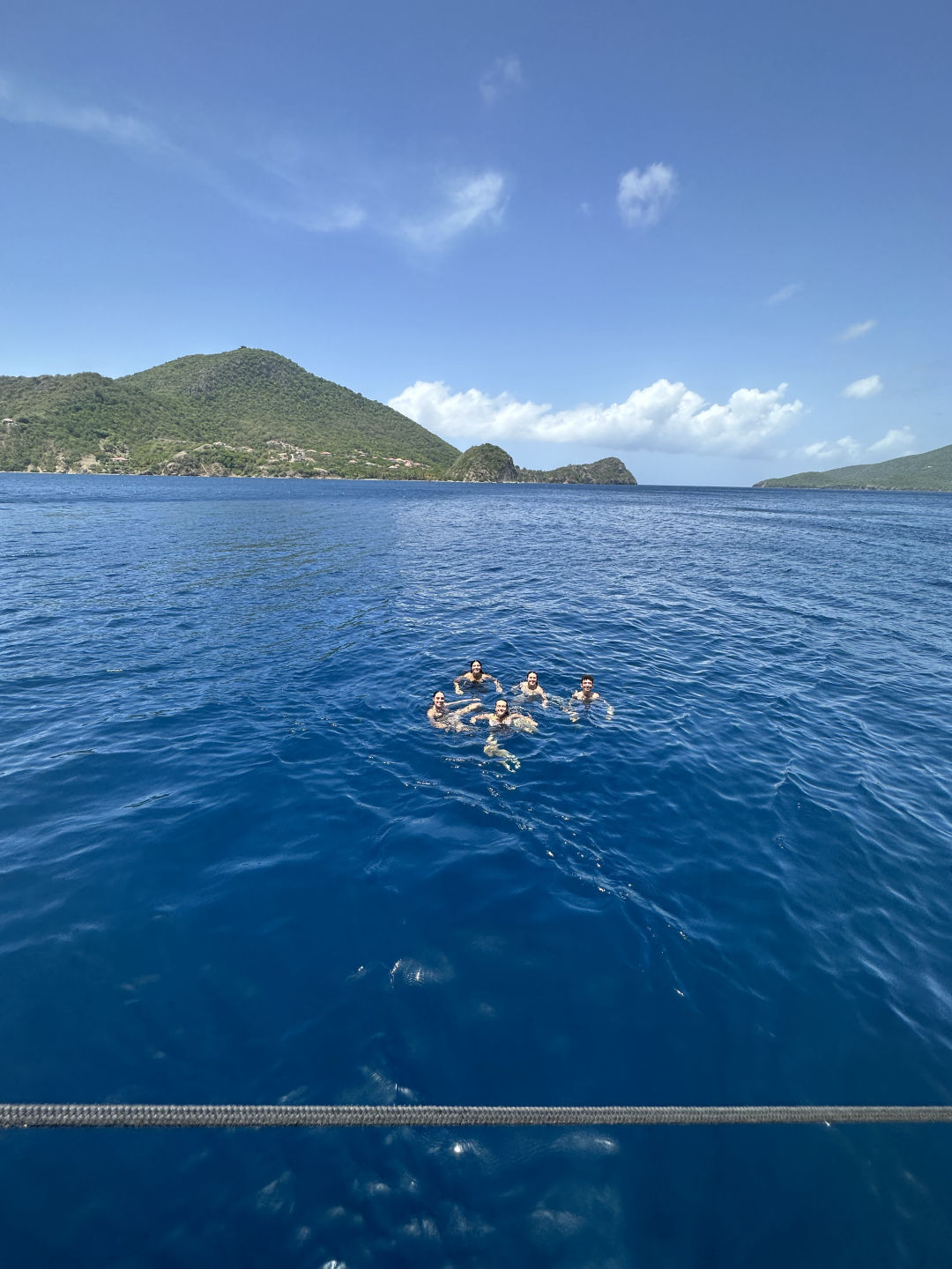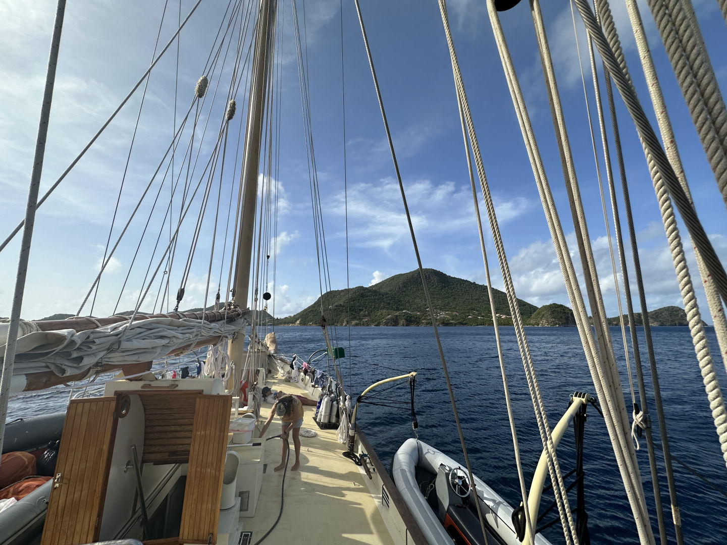 Ahoy from France and a Storm! Before I get into the day, I think it’s important to set the scene at the time of writing this: Right as I went into the chart house to begin typing, a huge storm hit us, and everyone was told to shelter inside as lightning struck around us and winds whip the boat. Ok, now back to your regularly scheduled skipper log: We start our morning off sleepy and exhausted from yesterday (At least I did, especially since I didn’t even realize I was skipper this morning until breakfast time) but got the day rolling with some yogurt and granola from our head chef Jake. Today is dedicated to getting some much-needed rest and recovery after all the exhausting sailing and excursions in Dominica, but first was Oceanography class and Seamanship class! We got to learn about the awesome powers of the Coriolis force and all the trade winds we’ve been using to sail with on this trip so far, as well as our radio exam and learning how to read and plot on maps for Seamanship! After class, we rewarded ourselves with a dip in the ocean to cool off after being stuffed in the sweaty saloon for a few hours, and Ari learned how to do a backflip which he seemed very proud of. After a quick break for lunch, the fun part of the day could begin! Our afternoon was a dedicated “choose your own adventure” type day, and most people decided the kind of adventure they needed most right now was relaxing on the shores of France at the nearby beach while others went swimming in the waters above the coral reefs lining the beach and exploring the trails leading to an old fort on the top of the island. While others enjoyed basking in the afternoon sun, Lauren, Desmond, and I kitted ourselves up for our final step in becoming Advanced Open Water Certified: Deep Diving! We took our first narc test (A nitrogen narcosis test designed to see if you’ve been narced, basically a field sobriety test for SCUBA diving), found a cherry tomato from the galley, and jumped in the water, ready to descend! After a brief replacement of Desmond’s regulator, we floated down our descent line to nearly 80ft and took our narc test again to wonderful news: we hadn’t been narced on our descent and actually sped up our times. We then carefully observed Lauren’s cherry tomato and its lack of redness at depth before swimming around and exploring the small patches of coral scattered about our anchor lines among the seagrass beds. I ran out of air first, as always, and we ascended back to the surface where we were knighted by Ash and his inflatable SMB as Advanced Open Water Divers. Diving had only just begun for us, however, as we switched our tanks over and, after a brief surface interval, took our dinghy Exy out to a nearby coral reef, along with some science equipment, to go on our first solo dive without an instructor to gather data for our research project! Our project is correlating fish populations with salinity, water temperature, and O2 concentration, so we got to enjoy a relaxed, fun dive where we swam about the reefs writing down data on our underwater slate and counting all the fun fish we saw (As well as a moray on the move, a pufferfish, and a stingray, so cool!). Now late in the afternoon and the sun setting over Les Saintes, we returned to OceanStar in chaos as the beachgoers worked to move our anchor lines after they got twisted up somehow over the course of the day. With anchors secured and the ship no longer endlessly spinning in our anchorage, we settled in for dinner as Elodie, and I asked our dual squeeze questions: Who do you most want to get to know better on the boat, and if you could go back in time, when and where would you go?