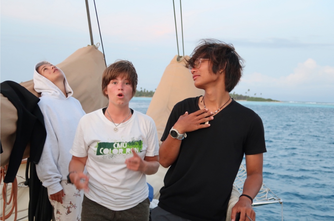 For some of us, the day began at 4:20 am with a sunrise dive. Ava, Hannah, Juliette, Amanda M, Charlie, and I plunged into the dark waters from the deck of Argo and made our way out to a nearby reef. At first, there was very little life to be seen, but as the sun rose over the horizon, the reef came alive once more. Despite being exhausted from the Challenge Course yesterday, it was a worthwhile experience for us, as well as our last requirement for Advanced Open Water diving (yay!). For others, the day began with me running through the hallways and yelling into each cabin that there was a pod of dolphins checking out Argo. Unsurprisingly, the prospect of swimming with dolphins before breakfast was enough to get people up and moving. We carefully made our way into the water and paddled out to meet them. The dolphins took an interest in us, too, and swam all around, chirping and clicking. To put a capstone on the (so far) perfect morning, Bodhi prepared a breakfast of crepes, which were absolutely delicious. After our regular cleanup, the first main activity of the day was boat appreciation, featuring new sheets, cleaning topsides, and a special Clayson removal unit (which failed, as they all have). Despite boat appreciation sounding rather unexciting, it is actually a very fun task. Many of us, staff and students alike look forward to it. Some honorable mentions for cleaning include Amanda D, who cleaned most of the galley and is undefeated at “marrying” provisions. Ainsley, Bodhi, and Ava, who carefully scrubbed the entire outside of Argo.