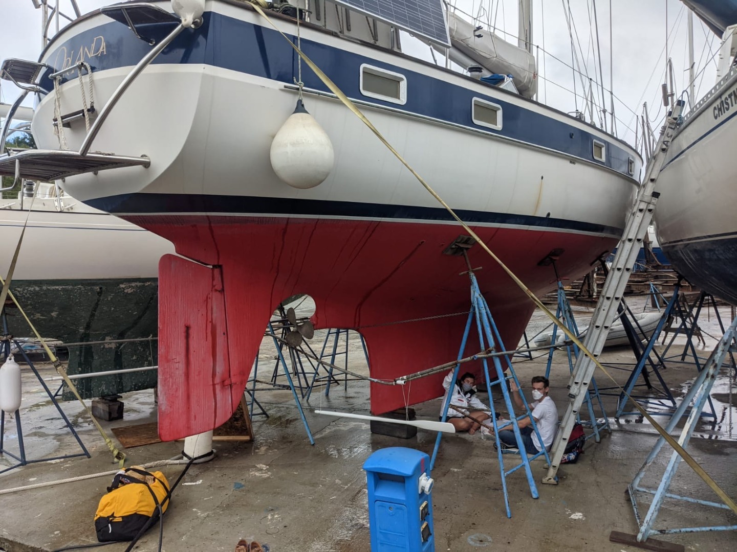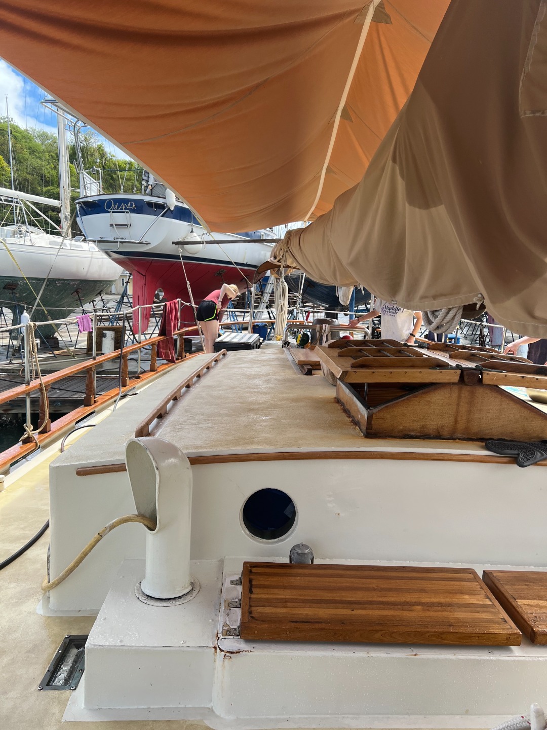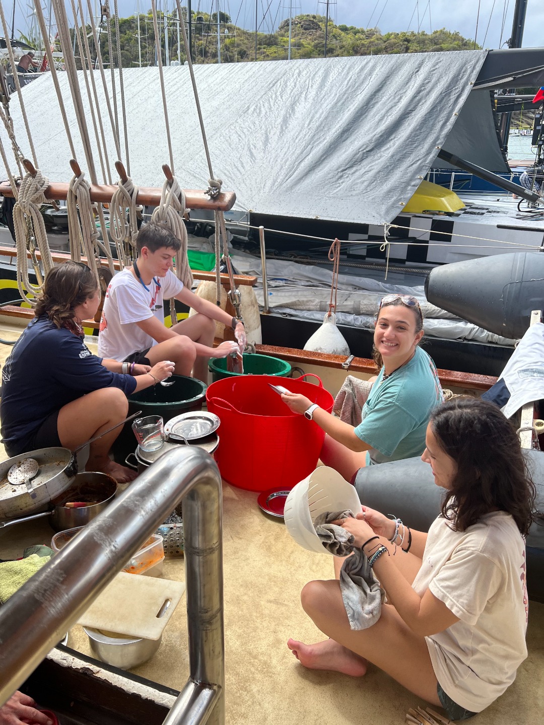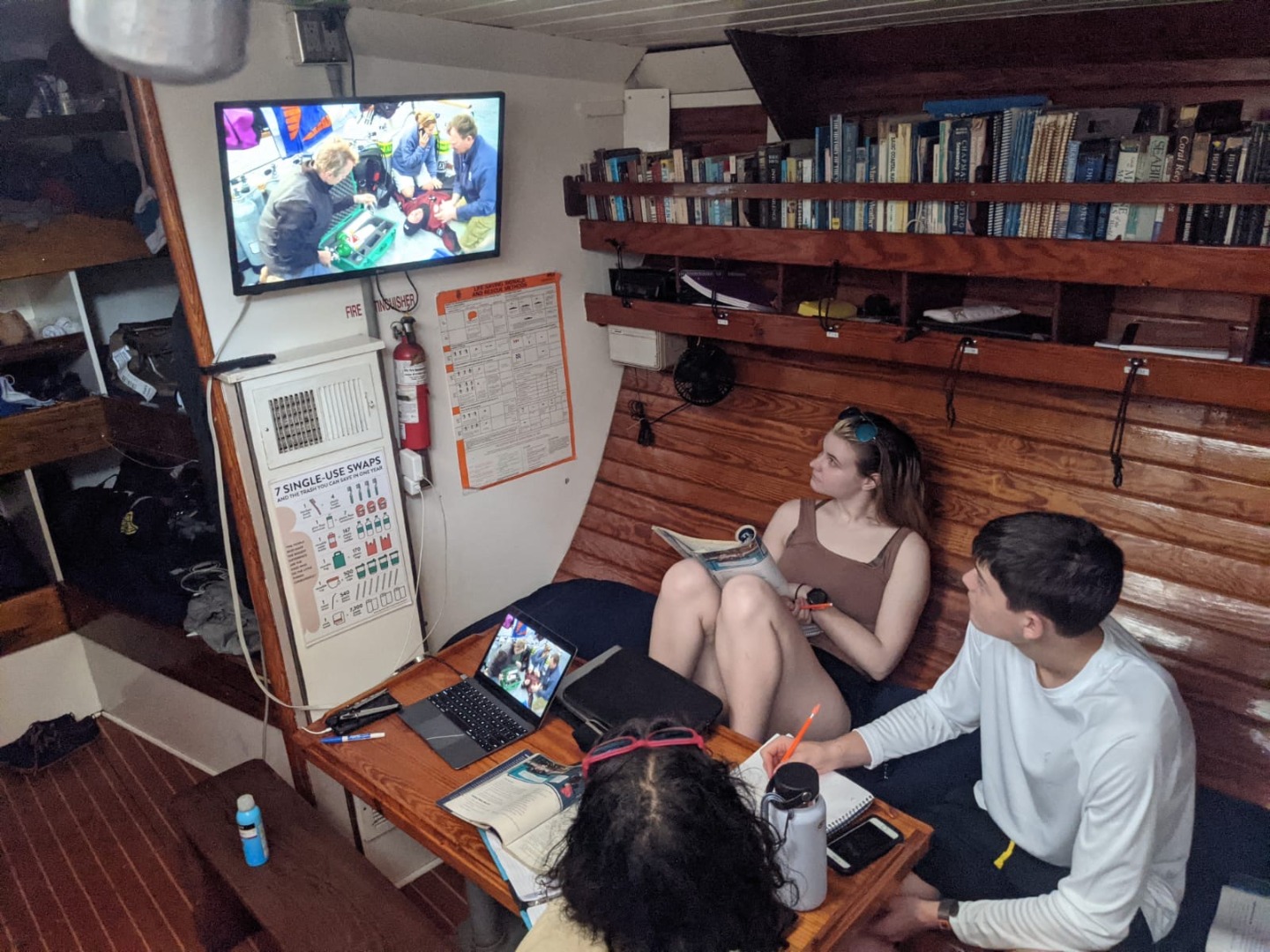 (Picture one shows some excited group members cleaning after a meal. The next two images show our gorgeous vessel. Our certified divers chatting with Ash about scuba stories on the chart house roof. Some open water students watching the PADI videos. Brett arriving and taking his COVID test hiding from the rain with Amanda. )