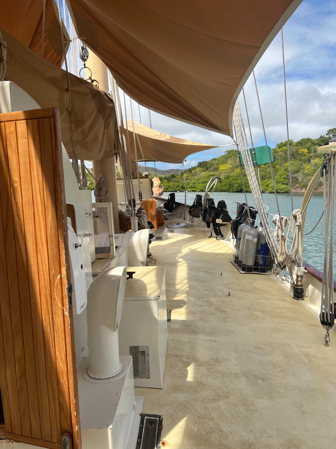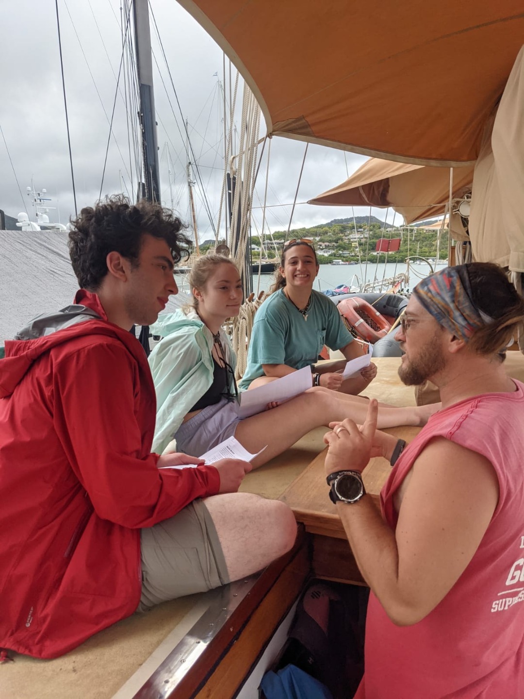 Another day began here in Antigua. The day began bright and early at seven am. A selection of bagels was available, along with some gluten-free options. Although some of the group was rather tired after long travel windows and the uncertainty of what the days to come were to hold. After our first meal of the day, we jumped right into a policy meeting where the expectations were laid to put us in a group setting. While this meeting definitely was not the highlight of the day, it was nice to understand the rules and why those had been put into place. Afterward, we jumped into a plethora of smaller meetings as well as our first-class onboard Ocean Star. Captain Hedrick was more than willing to get right into our seamanship class. He was quite animated in his explanations of various pieces of equipment and navigation charts. What could be more exciting? We continued to move along with our day getting into some PADI scuba diving classes. We watched an exhilarating video that showed the ins and outs of different pieces of equipment, hand signals to communicate, and some more safety information. This may not have been a hands-on part of the day, but everyone was very excited to get the ball moving on scuba. We continued to chug along, getting into swim tests. The dinghy was in the water and was used to shuttle crew members back and forth from the swim location-just around the bend to Galleon beach. All students that were able to participate passed with flying colors. So concludes another day here on Ocean Star. The group is excited to get the anchor up and set sail to our next location in the coming days.