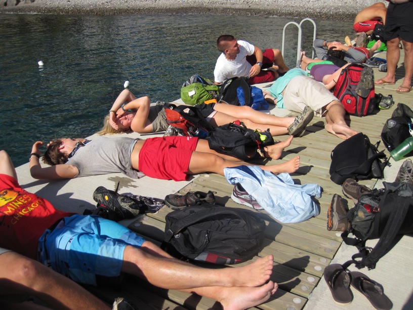 We piled out, and it immediately began to rain, leaving the trail slippery, muddy, and, um, trailey. Luckily, it stopped raining as soon as we piled into the woods, and we began our hike up a million flights of stairs to the top of the mountain. We got to the top, looking down at a lot of cool mountains and stuff. Then, for a change of pace, we got to walk down a million flights of stairs to the second part of the hike, through the Valley of Desolation, where people go to burn their skin off by wearing sandals and rubbing mud on their faces to clean their pores. After everyone was thoroughly impressed upon by peer pressure, we all had mud masks on, and we looked like a bunch of Juggalos (ICP for life). Next, we boiled some eggs in some boiling water lying around the mountain, ate them, and then continued on to the lake. After at least a 67 mile hike through rain, sleet, snow, and acid rain, we made it to the lakes, and they were ok I guess. We ate lunch, which was bread, peanut butter, and the mud that fell off our faces into our sandwiches, and then we were on our merry way back to the place we came from. Flash forward 600 million 726 thousand, and two steps later, we arrived back at the beginning of the trail and went down to the gorge where Johnny Depp swam in for Pirates of the Caribbean 2. It was the most incredible part of the trip thus far, and you could hear many people shout Best Day Ever, making Elis’s best day ever null and void. After that, we rode back to the pickup spot, and everyone passed out on the docks. We started a new program parallel to Seamester called Napmester, where you can travel to exotic places and set your own alarm. It was the best nap ever, and then we got to shower in Hibiclens and eat delicious chili. Then, I got to come down and tell you about all this stuff. THE END.