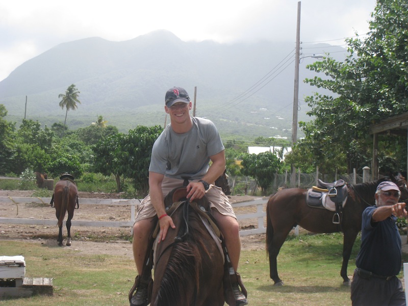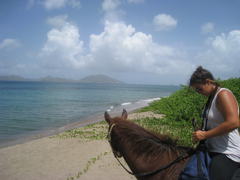 After a long passage at sea, it was due time to go ashore and experience the island we had journeyed to see, Nevis. The crew split up into two groups. One was going on a twenty-one-mile bike ride around the entirety of the island of Nevis. The other was mounting horses and going on a trail ride through the heart of the island and along its beautiful beaches. I elected to go with the horses. After we dinghied to shore, we were immediately shuffled into some vans that were bringing us to our various destinations. My group of eight reached the stable, and after Collin, Bret, Ben, Dominique, Keeley, Bridget, Brooke, and I stepped out of the cab, John, the owner of the stables, greeted us. It was a small area with a couple of dusty paddocks surrounding a central mounting area where eleven horses of various shapes and sizes stood, flicking flies in the bright Caribbean sun. John was an older fellow who moved to Nevis, where his family was from, after living in the States for a large portion of his life. We sat on the porch of the office and waited as John gave us each horse’s name. After he called the horse’s names, we were sent to our animals. He called my horse’s name, Mareina, and I walked across the paddock to where she was hitched. She looked pretty old and gaunt, with longer hair than was needed for the temperature. I climbed aboard her back, worrying if she would be able to support my weight. She didn’t seem to notice the new load that had graced her narrow shoulders and walked forward. As we were walking, John pointed out that she was also missing an eye that had been taken by an unruly tree branch ten years previous. She seemed happy enough, though. After everyone had mounted their beast, we set off. We rode through backwoods trails, passing cows and monkeys. We rode down by the water as the waves splashed across the hooves. We then went up through the villages. It was interesting to see the varying demographic of poorer citizens to wealthy tourist homes. After around an hour and a half of riding, beautiful views, and interesting tidbits about the island’s history, we returned to the stables. After that, we had some time in the main town of Nevis, Charleston, where some grabbed something to eat and others did some shopping. From what I was told about the bike ride around the island, it sounded like it was no easy task. For twenty-one grueling miles, the second half of the students peddled up steep hills and bombed down narrow passes. After nearly six hours of biking, they finally returned with legs of jello and souls of fire. After, we all returned to the boat and proceeded to shower and prepare for a night out at Sunshines. The boat is a bustle with everyone getting ready to chill out and get to know each other better. Until next time, parents and friends, this is Will signing off.
