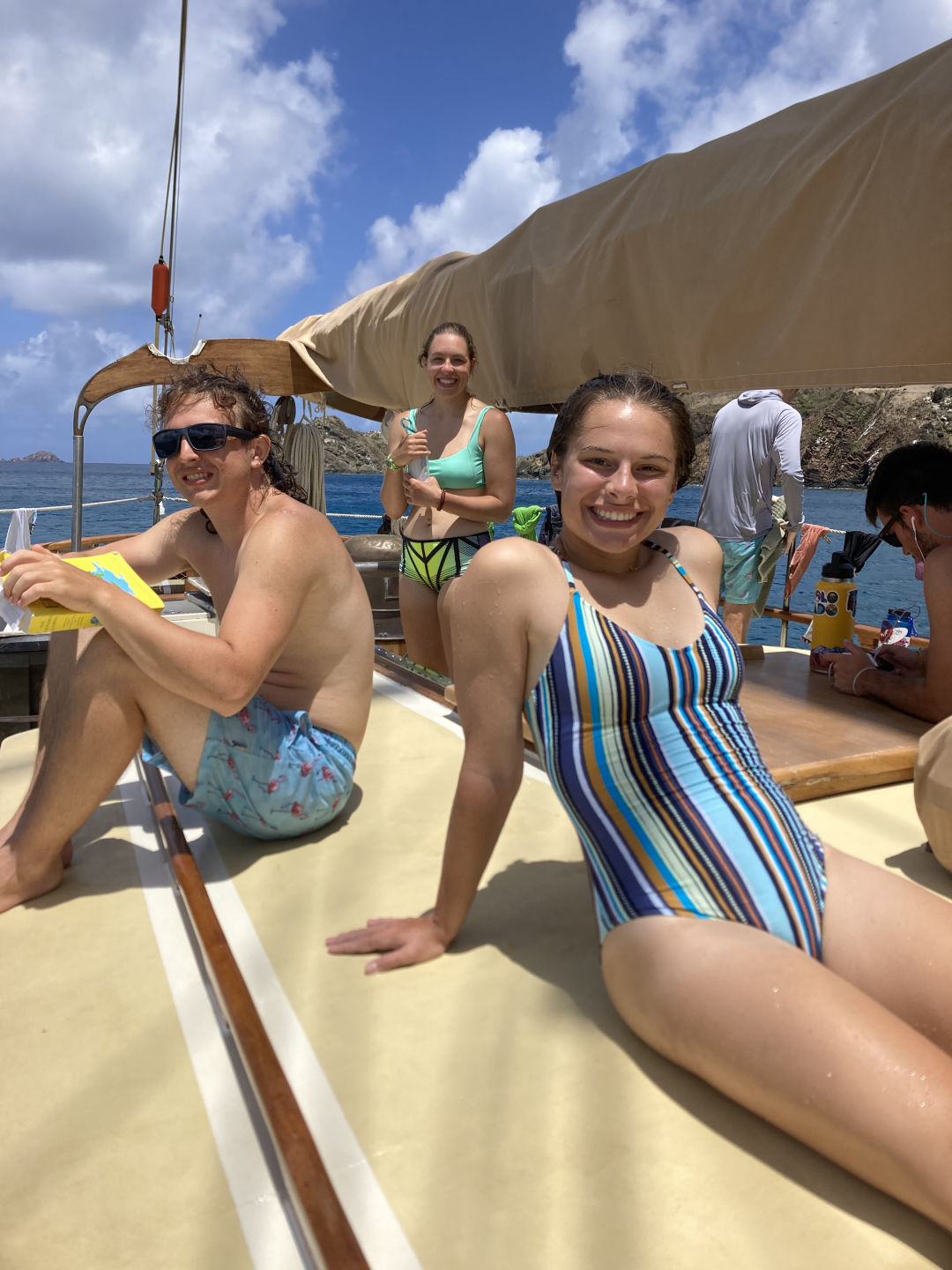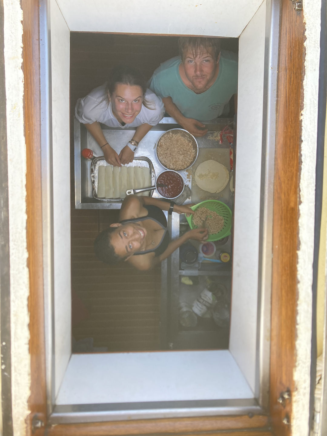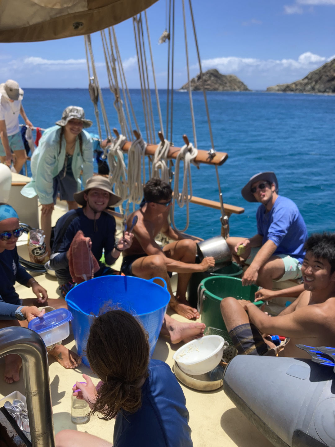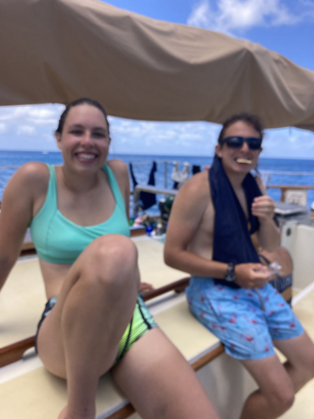 Everyone’s wake-up call today was me clashing pans together. A very bold move, as one of our instructors said, but hey, no one missed breakfast. For breakfast, we enjoyed crepes made by our instructor Smash (Thanks, Smash!) after we all briefed for our practice rescue dives. We all learned how to save a panicked diver, passive diver, and unconscious diver on the surface. It’s more fun than you think to pretend to need saving. The highlight of the morning for everyone, I think, was watching Q and Elling try to save each other. They went a step further into the rescue by trying to carry each other onto the boat using the ladder, with one of them pretending to be passed out. Let’s just say they were both failed rescue attempts, but verrrry funny to watch. After we were done the rescue exercises, we all passed out on top of deck and waited for lunch. After lunch, we hopped back in the water to practice our rescue skills but for underwater. Everyone did a great job learning all the skills today! Then Q, Elling, Rohan, Toby, Cameron, and Ripley tried to coach me into doing a backflip off the bow of the boat. No backflips were made, but there were plenty of laughs. Hopefully, I can make up for it by actually doing a backflip tomorrow. After shower time, Q, Ripley, Kat, and I all lounged out on the top deck and read together ’til we had a dive log book party in the salon.