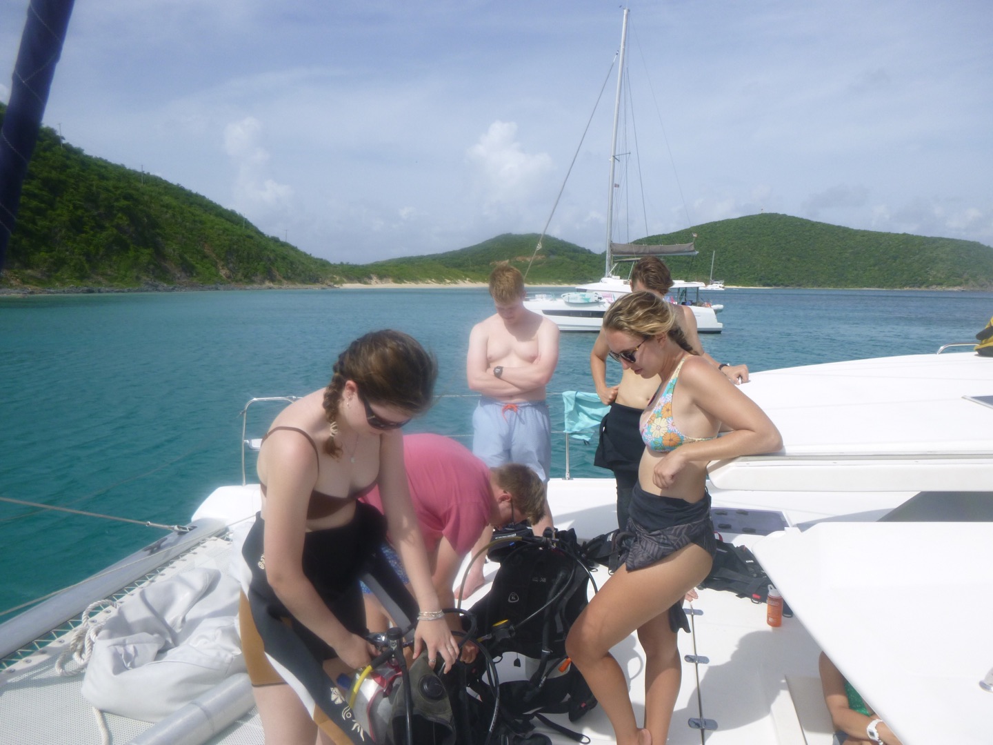 We woke up bright and early to enjoy breakfast in the beautiful Virgin Gorda, where we were told we would all be learning how to scuba dive today! We were all very excited, and our knowledgeable crew guided us through the process of setting up our gear, and then we got in the water. We dived for a total of 3 hours today and learned so many incredible skills that will prepare us for the beautiful dives ahead of us on this trip. We ended the day with a hearty dinner and a cool ocean breeze, which was very much appreciated. Also, we found a large barracuda under the boat and named him Barry.