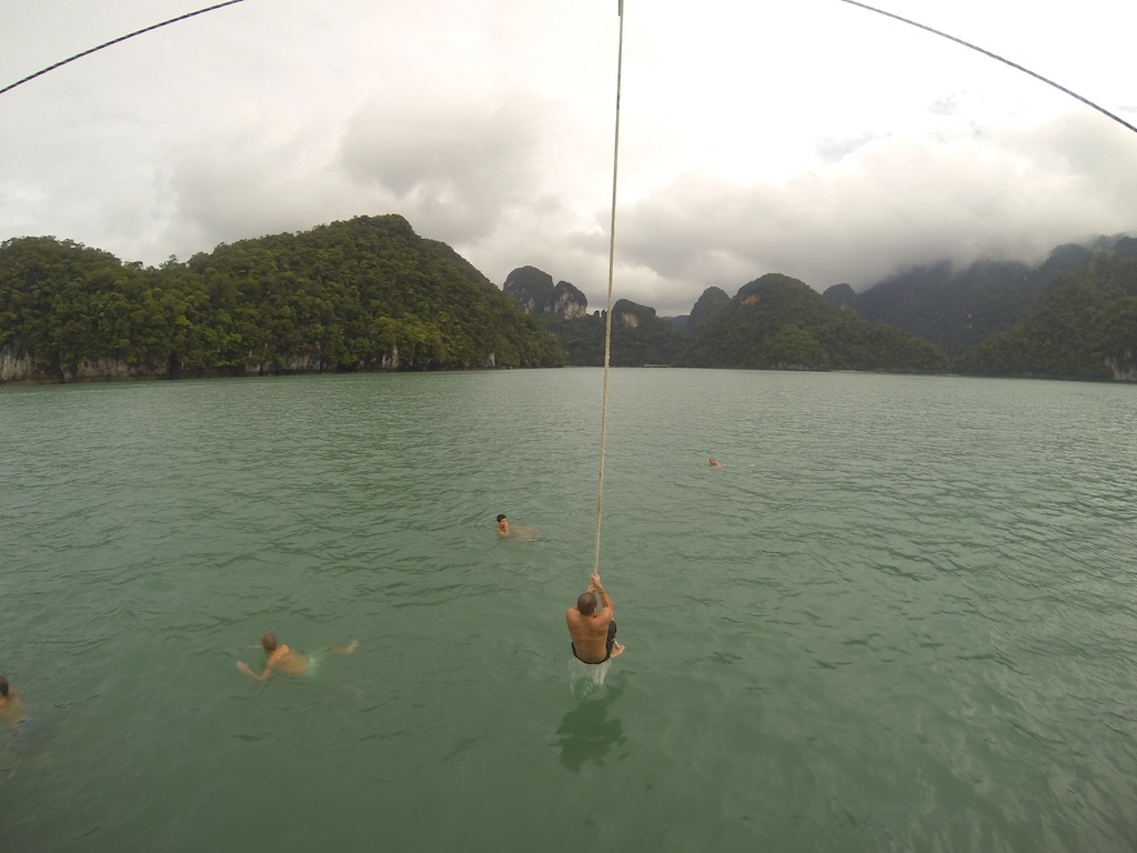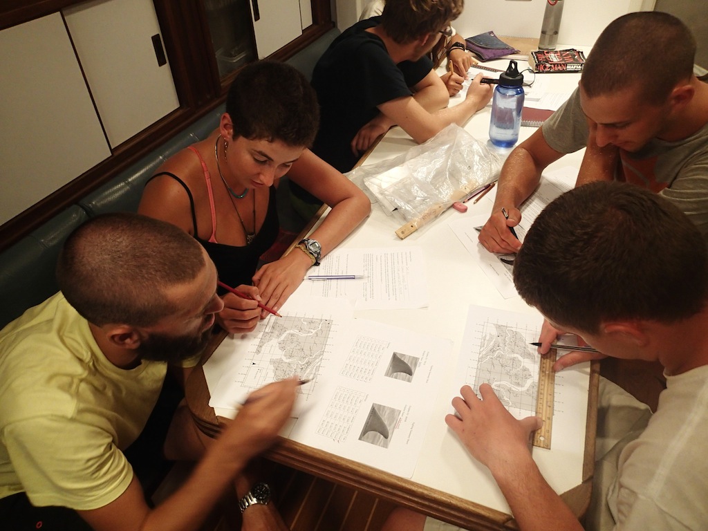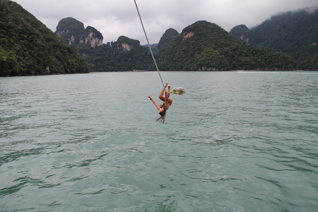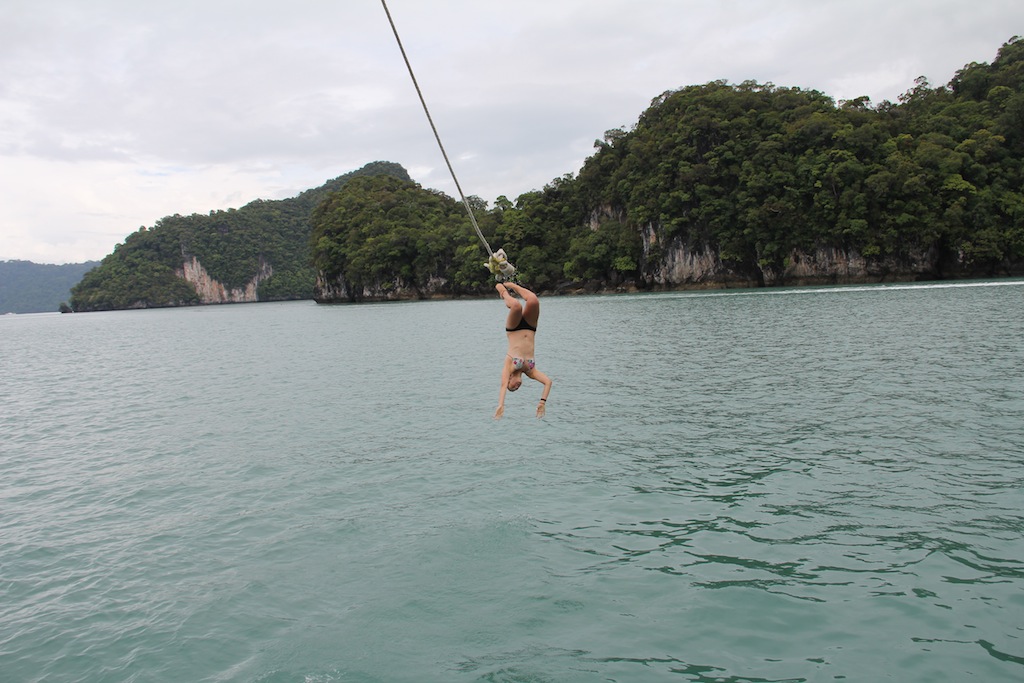 Today we started with a delicious breakfast of crepes with toppings of Nutella, peanut butter, fruit, lemon juice, and sugar, fruit prepared by our captain Sam. It was delicious and just what I needed after staying up late preparing bread for the next day’s dinner. After cleanup, we had an EFR (emergency first responders) class, where we learned how to treat victims for primary and secondary care. While EFR was going on, some of us went up on deck to start setting up the boom swing. We had to top the main boom using the mainsail halyard and then swing the boom out over the side of the boat with two guy lines on either side. Before all of that, though, you must tie the actual rope swing to the end of the boom, with about 8 of us working together to finally get the end knot where you stand made. After the swing was set up, we had to try it out; everyone was doing backflips, twist flips, and flips on accident. The only rule to the boom swing is you have to let go; as Leah would say, “130 tons will always win.” The boom swinging continued in the afternoon after lunch and then finally put back before dinner.