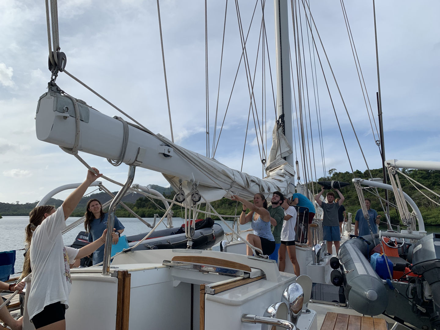 Getting out our dive stuff for the last time for a while, we went on a snorkel in the nearby mangroves as a combo oceanography and marine bio lab. There were yellow sponges the size of us and red sponges growing all over the mangrove roots, sea urchins, and so much sea grass, and Carla and I saw a squid! Mangroves are also a nursery for lots of baby reef fish, so there was a GIANT school of baby fish swimming around everywhere. Once back on Vela, we started to ocean shower (the last for a while) when, oh no! Dylan, Steph, Drew, and Allie had all fallen overboard, and we had to save them! Allie and Dylan were quickly recovered unharmed (Dylan was’ nocked out’ by the life ring (my bad) but still brought in). Drew and Steph, however, would’ve definitely died if this was a real scenario. No one reached them until 6 minutes after they’d fallen in. Even though we didn’t kill the game, we learned what we needed to improve and will de much better next time (we were told to be prepared for anything at anytime (as long as the sun was out)). We then did a passage prep for our 12-hour sail to Colon tonight, which included running jack lines (so we don’t die), attaching the halyards (google it), topping the main staysail (also google it), and taking the loads and loads of laundry off the lifelines. Because we finished early, we had some time to relax or work on school (the lionfish essay and leadership essay were popular ones) before dinner. Anticipation was in the air because, at dinner, we were being told our new watch groups, a truly tantalizing and voyage-defining topic. Dinner started easily breezy and beautiful when suddenly horror struck! Little tiny evil gnats came swarming out everywhere, attacking our ankles and arms and face. After half the line made it through the dinner line, the staff ran for the bow, pulled the anchors, and made a break for the open ocean. Some of the little bastards hid in the cockpit and had to be sprayed down to get rid of them before the squeeze (it was semi-successful). My appreciation was seeing the cutest little squid today while snorkeling that inked at me before running away (it was truly one of the best moments of my life). The question of the day was (provided by Drew, who was supposed to be skipper) ‘if you were going to murder someone on this boat, what weapon would you use, where would you put the body, and who would you choose as you accomplish.’ I said kitchen knife (the stainless steel one), in the deepest bilge, and Tom (because if Tom’s in charge, we won’t get in trouble. I also got to announce the new watch teams (so exciting)! Anyway, we’re off to Colon tonight and are all already so excited to go through the Panama Canal!