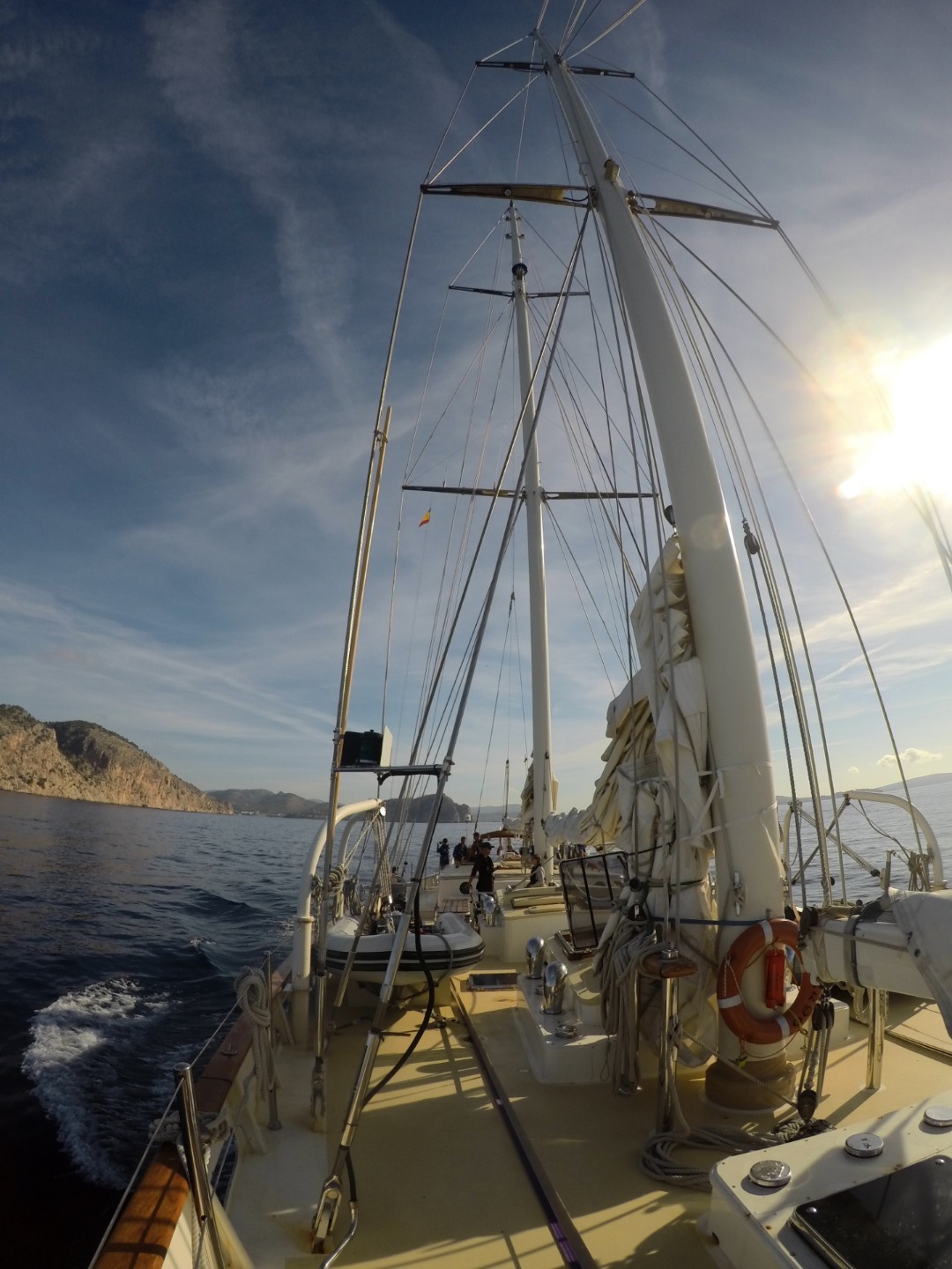 The sleepy Argo crew awoke to the delightful smell of fresh eggs and buttered toast. Seven dozen eggs and 120 pieces of toast later, the hungry sailors were sitting in quiet contentment overlooking the Mallorca cliffs. Alas, the peace was short-lived as the crew dived headfirst into passage prep. Lines were hauled and coiled, cumbersome dive equipment was awkwardly shuffled to the back of the boat for safe storage, beds were made, crew members frantically cleared the deck of loose clothing, cabins were begrudgingly swept, and the anchor was lifted from the dark abyss. Setting off for Motril, Spain, the loud grind of the engine signaled the beginning of a new adventure.