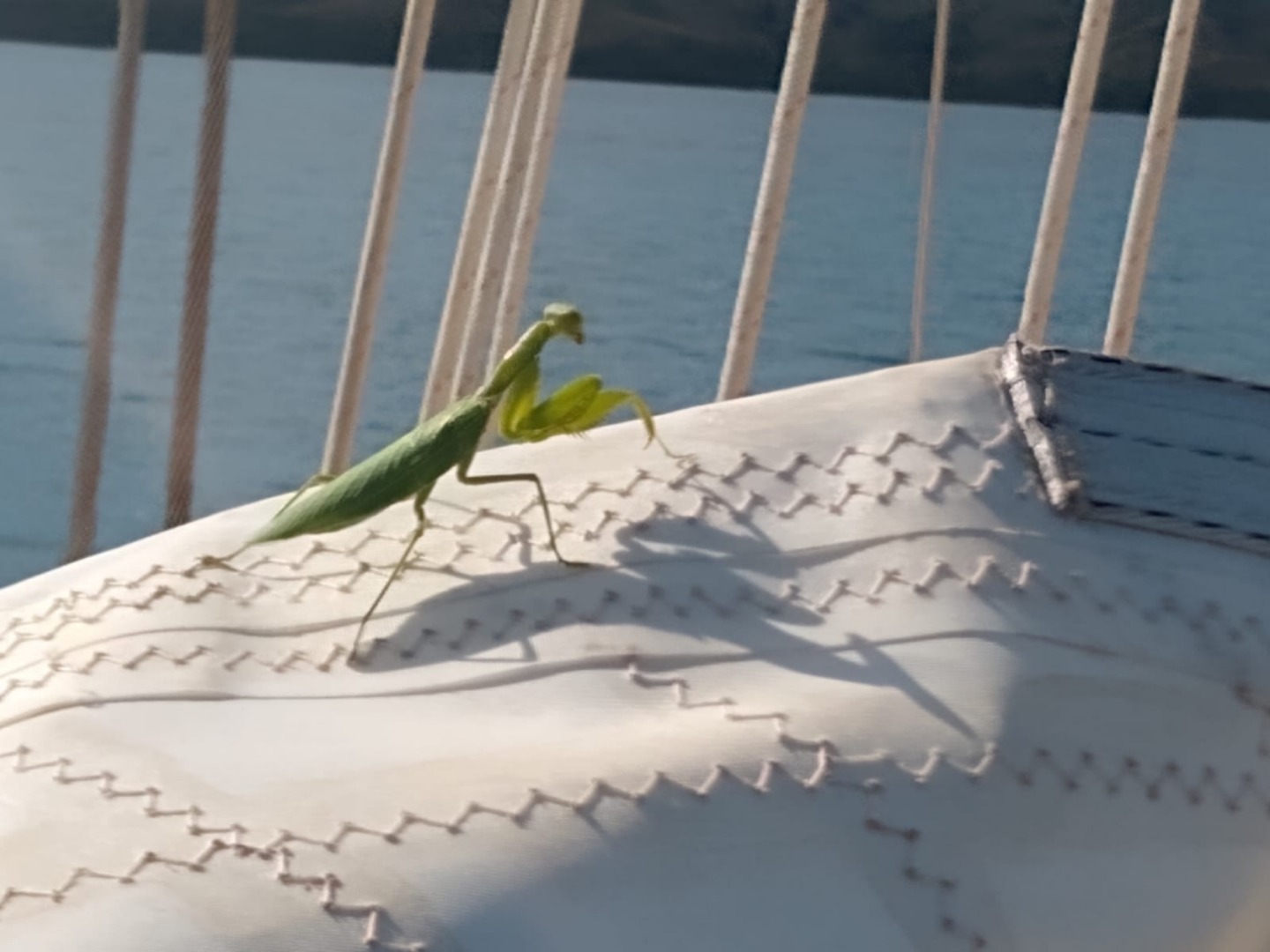 The past few days in Musket Cove have been incredibly beautiful. The water has been glassy, the sun has been shining, and the lack of wind has made it so quiet that we can hear the distant waves breaking on the barrier reef. We have even had a few visitors, including a praying mantis and a fairy tern. This particular praying mantis was first sighted by me when I was doing a rig check which involves going to the top of each mast and working your way down while checking various parts of the rig. The praying mantis was at the tippity-top of the foremast and was probably just as confused to find me up there as I was to find it. It has since moved down to deck level, and we have found it in various places over the past few days. Onboard, we spend a lot of time learning about marine life, but, in case you were wondering, praying mantis’s can live for a year, turn their heads 180 degrees, and the female’s eat their mate shortly after mating. They are sometimes referred to as the “perfect insect predator” because of their quick-moving arms and ability to grab prey with lightning speed. Among their normal diet of flies, moths, and other insects, they can also catch frogs, lizards, and birds. Basically, they are wicked cool, and I’m really pleased that this particular mantis decided to spend some time on Argo.