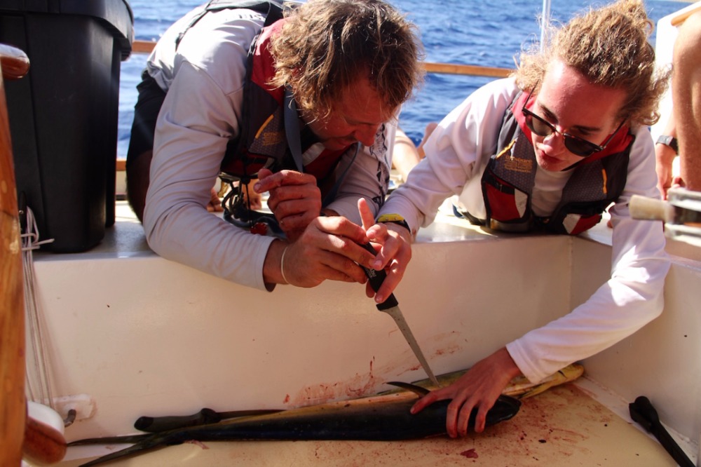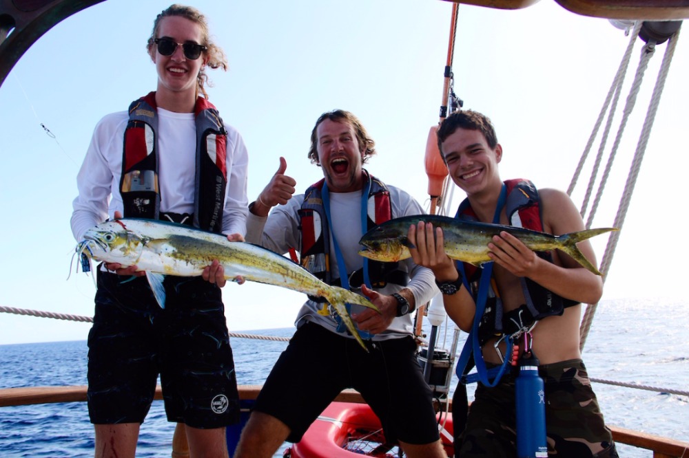 The afternoon excitement continued when we heard one of the fishing reels go, followed by ‘fish on!’, then immediately heard the other one go, and another ‘fish on!’ We caught two Mahi Mahi’s within about 30 seconds! Aaron reeled in one while Duncan took on the other. Duncan learned how to fillet the Mahi with Nick’s help and then took on the challenge of eating one of the fish eyes. Surprisingly, he quite liked it and decided to eat a second along with Cole (Cole decided to opt out of a second one). We continued to sail along, catching a beautiful tuna along the way, until we finally reached our destination of Antigua just after sunset and dinner, like I said, an awesome day!