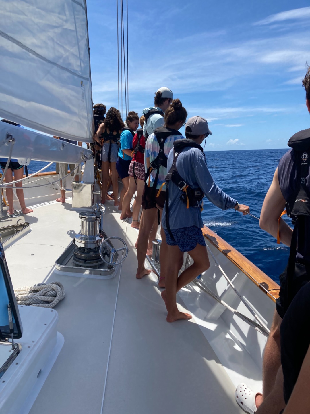 My day started with the 8 am to 12 pm watch. Watch is a magical time, often filled with exhaustion and an overriding sense of exhilaration. Such sensations were displayed in our 9 am dance party in the cockpit, in which the general display had a strange resemblance to that of an inflatable figure you might see bouncing around the front of a car dealership. Nonetheless, our spirits were high, and the day continued into lunch as most in the Caribbean do, sizzling. Soon after lunch, we sat down to our marine biology midterm review, which was only to be disrupted by the ecstatic call of “dolphins” from the deck. The speed at which people flew to their bunks to retrieve their PFDs and were up the companionway was unparalleled, and so too was the commotion on deck. Folks gasped in enthrallment as they leaped out of the water with unrivaled elegance. Once our porpoise friends had departed, we clambered back down to class. Following Marine biology was seamanship, in which we began looking at electronic navigation (GPS, RADAR, etc.). Despite our best efforts at focusing, the ruckus began once more at the holler of “WHALES ON DECK.” Sure enough, on deck was a pod of pilot whales. We watched them swim for some time before we were needed back in class. Fortunately for us, they returned just at the end of class, and we all went back on deck to watch them for the proceeding hour. The crowd dispersed, and I ventured to my bunk in an attempt to accomplish a modicum of work. However, following a common theme in this summation, my work was interrupted by yet another call. This, unlike the previous two, was a milestone. The past two days of passage had been rewarded with “land ho’. To me, this brought both relief and dejection. I thoroughly enjoy passage. It’s a time like no other. You never know what to expect; in fact, as I’m writing this very blog, there is what appears to be a Venezuelan helicopter circling Vela while we motor along the coast of Bonaire. Though simultaneously, I do believe I speak for many of us when I say much of the freedoms granted by anchorage are sorely missed during the passage. It’s expected that we will be docked by 12:30 am, at which time we will have moved over 420 miles from St. Vincent to Bonaire. I’m forced to conclude this day’s summary, so I thank you for reading and bid all you back home farewell.