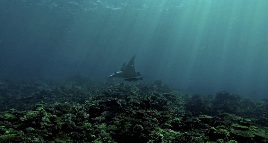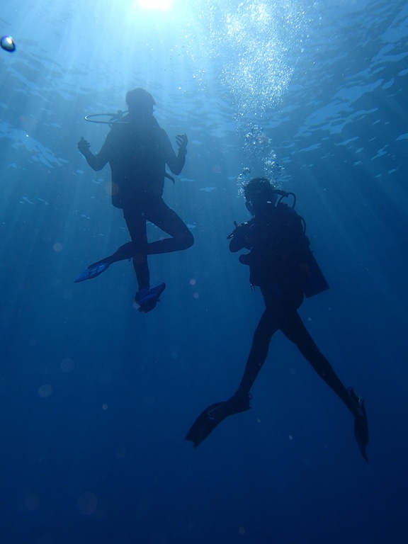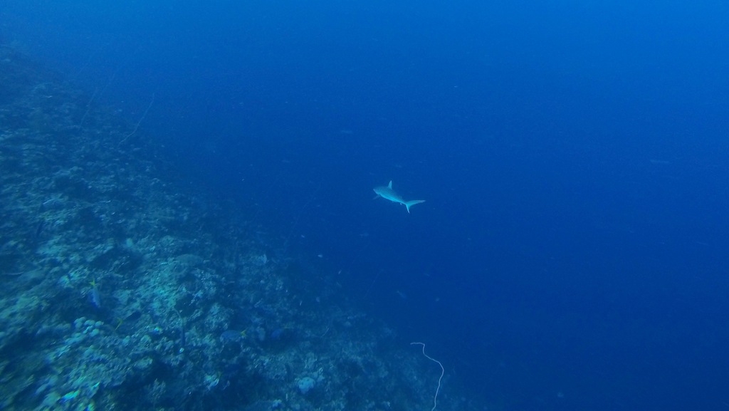 The third dive became a joke. What cool things would dive group 1 see this time? The good ol’ GBR didn’t disappoint. Before we even descended, we looked down and saw a three-foot Black Tip Reef Shark! We descended as fast as we could safely (don’t worry, Mom) to chase it, but he left pretty quickly (probably because I was squealing like a little kid in a candy shop). We continued on our merry way, drifting along a wall on the edge of the reef, all the while listening to the whales singing. It was pretty majestic. Just when we thought that our dive luck had run out, we saw something from out of the blue in the distance.