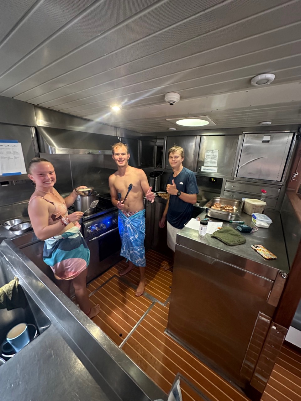 “WHALE! WHALE! WHALEWHALEWHALE!!!” There you go, everyone; now you get the same greeting I was fortunate enough to receive after my 12 am-4 am watch. Usually, someone screaming down the companionway would not be my ideal wakeup, but when what’s being screamed is “whale!” even I won’t complain. Watch team 1, newly formed with students Charley, Nora, Will, and Anda joining Dan (the person who saw the whales first) and Mac as staff leads, spot a pod of over 20 pilot whales off Vela’s starboard side at about 10 am and (thankfully) they were not quiet about their exciting find. All of us, even the head and sous chefs who were already hard at work on their bagels (more on that in a little bit), raced to put on our PFDs and hurried onto the deck to see these beautiful creatures. Now, I’m sure that, like me before this trip, when most of you picture the middle of the Atlantic Ocean, you’re probably imagining some pretty big waves. Not to say we haven’t had our fair share of wind, but today, the water was, in Charley’s words, “like silk.” Other terms I heard tossed around included “mirror,” “pond-y,” and simply “flat.” Regardless of terminology, it’s safe to say this is the calmest day we’ve had so far. While this meant that the sails would have to stay down, it did give us a perfect viewing of the whales and even allowed Tom to get the drone out to fly it over to them. The glassy water meant we all watched the whales for almost an hour, with squeals of excitement and the occasional “oooh!” at a whale’s reappearance being the only sounds to interrupt the surreal moment. While it may seem like the day couldn’t get any better, dare I say, “But wait, there’s more.” I had gone below deck when Flo, with her typical excitement, told everyone that we would be snorkeling with them. She said it with a little jump up and down and one of the widest grins I’d ever seen and I swear I don’t think I saw that smile leave her face all day. Also, let me just repeat that since I can barely believe it, and I got to experience it firsthand: the entire crew of Vela would be snorkeling with a pod of pilot whales in the middle of the Atlantic Ocean. I would say I’m getting chills just thinking about it, but truthfully, this boat is too warm for actual chills. I’ll call them figurative chills. We all put our swimsuits on and dug around the lazarette (“az,” if you like all of us and love giving everything a fun, silly little nickname) for our snorkel gear, which had been packed away since we began our passage. Then, we launched our dinghy—something that is usually a bit of a chore, but today was done with a fair bit of excitement, understandably so—and split ourselves into groups of five to head over towards the whales. Now, if any of you are lucky enough to swim with wild whales in the middle of an ocean, let me give you this critical tidbit that we heard over and over: be. quiet. And, let me also tell you that, for a group of 13 high school and college-aged kids, this was a pretty big ask. But, again, like being okay with the wakeup, there’s very little that the crew of Vela won’t do for a pod of whales. Despite my best efforts to be part of the first group to go out to the whales, I was placed in group 2. However, this meant I got to see the absolute best reactions from group 1, with Nate, Joey, Charley, Michelle, and Runyon returning with smiles that might have made the already sunny day even brighter. I know it sounds cliche, but I promise there is nothing like seeing the people you’ve gotten exponentially closer to over the course of three weeks smiling so big. After group 1 got back, it was time for group 2 of myself, Flo, Will, Anda, and Shelby (with Dan again as surface support and dinghy driver) to go get this once-in-a-lifetime experience. We quietly motored over to where the whales were still relaxing and got into the water to share the space with them. Yes, we got into the middle of the Atlantic Ocean, with nothing but horizon, 23 whales, and Vela to keep us company, and swam. Group 3 was next to go out, and they were lucky enough to actually see the whales underwater (Emma swears it happened even though the GoPro didn’t catch it. Personally, I believe her, but there is the saying “pics or it didn’t happen,” so it’s still up for debate). Group 4 was last, this one made up of staff—including Captain Tom! If we were going to take over the boat, this would have been the time to do it while he was off the boat. Oh well.—and Jonathan. Upon their return, we got another “but wait; there’s more” moment: now we would get to swim around Vela! This meant flips off the bowsprit (big shoutout to Garrett for doing his first front flip and to Mac for teaching everyone about the Lemondrop method of entering the water) and a much-needed refresh for everyone. Despite living in an endless world of the ocean for the past twelve days, this was the first time wwe’dgone in the water all passage, and boy, was it wonderful. We took pictures and videos, listened to music, all got a little more sunburned than usual, and kept just repeating, “This is unreal. I love today.”” and jumping up and down with each other like we were all little kids in a candy store. When the inevitable end to our fun was called, we were treated to another special part of the day: Emma and her sous chefs Joey and Runyon’s homemade (“oat made,” perhaps?) bagels! Even though lunch was two and a half hours later than usual, I think I speak for everyone when I say it was well worth the wait. We had options including cinnamon sugar, everything, sesame, and even crushed cereal. In fact, I even heard Will claim it to be “the best bagel” he had ever eaten. After lunch, we had to get back into our routine a little bit more, but there was nothing that could dull the energy on the boat. Fittingly, oceanography students learned about energy transfers today (a
