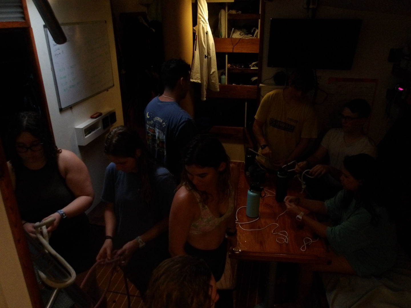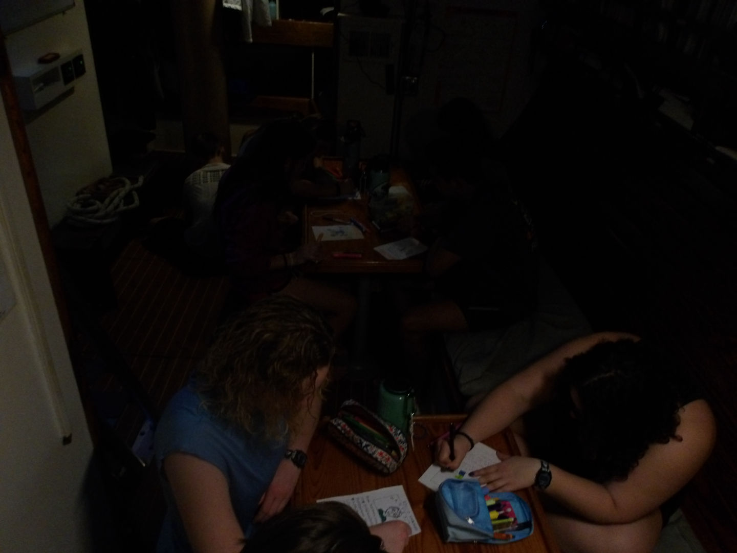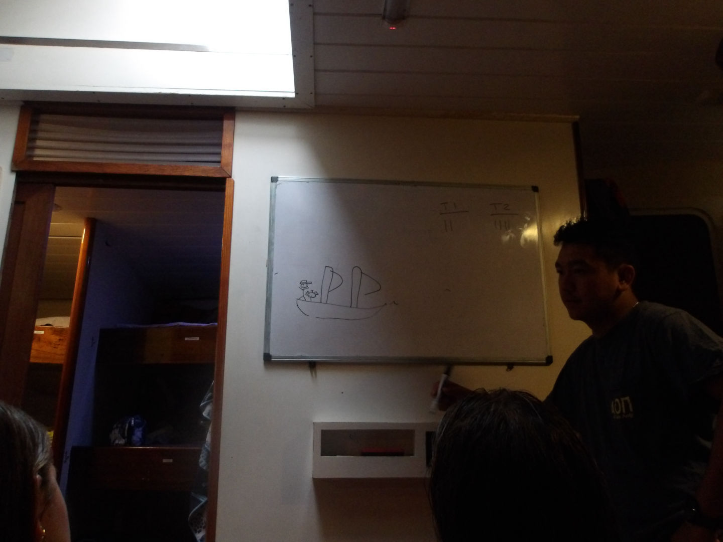 Hello, all friends and family! Today was a bit of a different one, as it was raining pretty much the entire day. Apart from dropping the starboard anchor in the morning, most of the day was spent in the saloon, being introduced to academics and playing some fun games. Drew introduced the leadership course, and Ben introduced the Marine Biology course, which is really exciting! We had a little bit of downtime before lunch as it was a bit too treacherous to go swimming or scuba diving. After lunch, all of us were either introduced or given a refresher on RDP tables (recreational dive planner) and had some lessons on some of the important knots that we will need to know moving forward. Drew gave us a crash course on the bowline, figure 8, reef, clove, round turn, two half hitch, barrel, sheet bend, and double sheet bend knots. Some are definitely much easier to pick up than others, but I am confident in our ability to get all of them down in no time! After that, we did an icebreaker activity involving creating wanted posters for each other based on their likes and interests (nothing criminal), which turned out to be a really fun activity. We then had some time to take showers, with many of us embracing the rain and having a fun time swimming while washing ourselves (Check Photos). We then had some downtime where we played some Pictionary and some card games. Drew really appreciated the lovely drawing that Evan created of him during Pictionary. We then ended the day with a delicious spaghetti bolognese made by Kackie, and some of the uncertified scuba divers are currently taking some quizzes so they can get in the water tomorrow! The weather tomorrow is supposed to be really nice, so it’s looking like we will resume normal procedures and finally get some underwater action for the first time, which is super exciting!