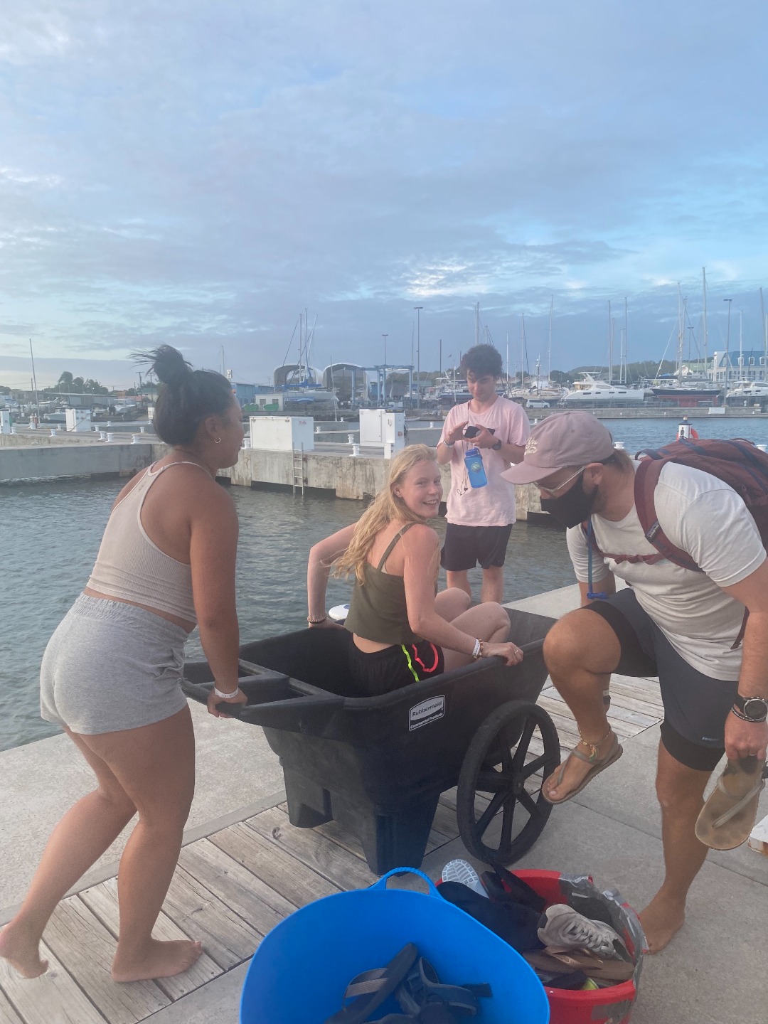 Picture 3: Ash getting back with provisions while Sunny and Sarah ness around with a dock cart