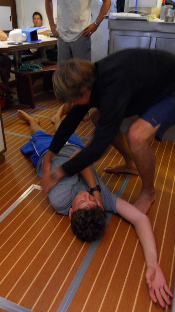 Last night, on our passage, we did something few people get to do in their lives. We crossed the Prime Meridian. It happened late, and the people on watch did the traditional spins to bring in good luck. When the bright red (and gorgeous) sunrise finally came, we were ready to take on the day. It was a great morning to be out on the water, and we all got a little more experience getting the boat ready to tie up to a dock. We pulled into the marina in Valencia and set to work scrubbing Argo until she shined. We waxed, polished, rust busted and scrubbed all morning. After our scrub, we had a great afternoon of learning CPR and how to bandage wounds in our Emergency First Responder class. This consisted of practicing CPR on dummies and log rolls on each other. It was very much a crash course in first aid, but good enough that we all feel confident that we could save a life if we had to do so. After practicing CPR on our plastic dummies, we took the test and got Emergency First Responder certified. Tonight is a night out on the town, and we are all excited to explore.