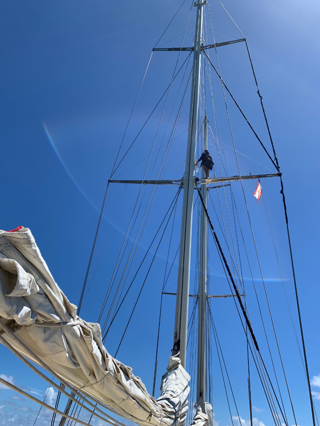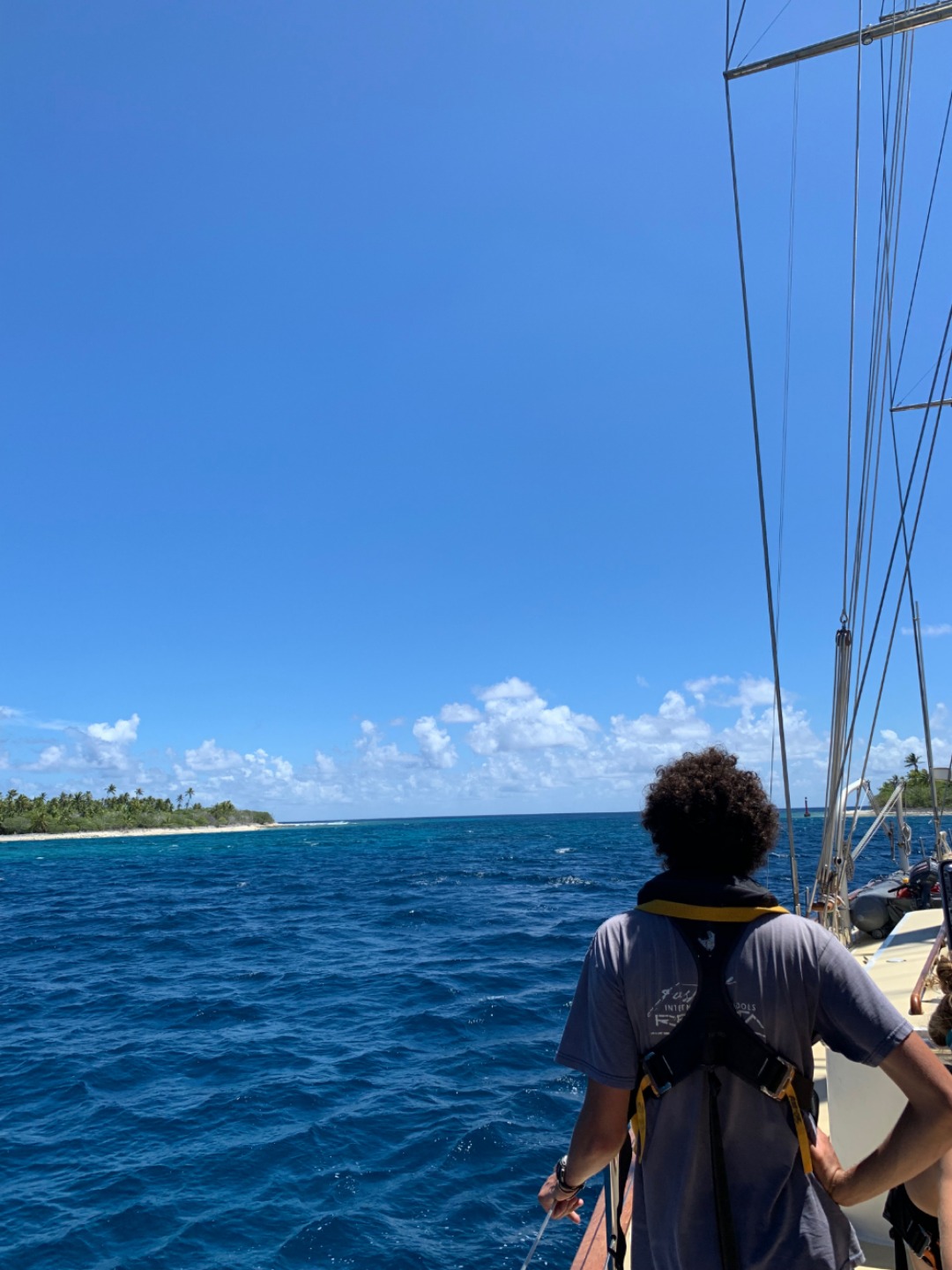 Pictured: Jack (our student skipper for this final passage) surveying the pass as we exited Ahe Atoll; Tim up the rig as our lookout on the way out during slack tide; students in the salon listening to each other’s final research presentations.
