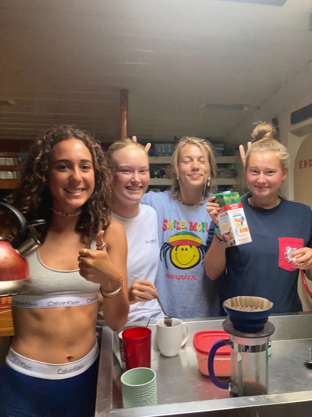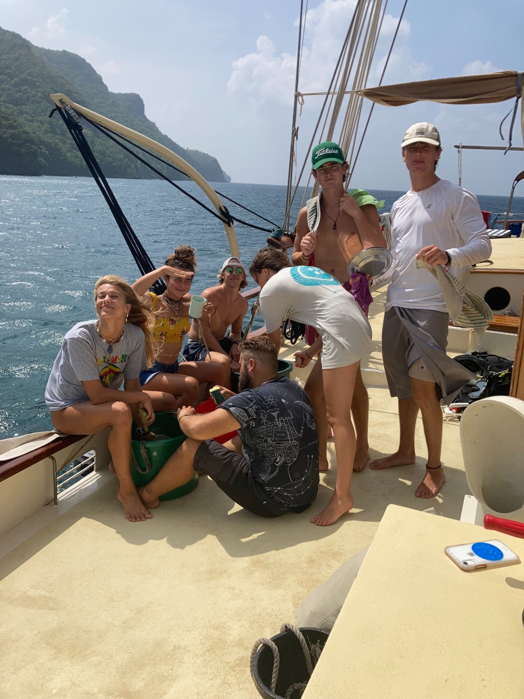 I was one of the lucky ones who didn’t have an anchor watch last night, so my morning started a few minutes before 7. At this point, everyone has fallen into the routine of what their mornings look like. Because of this, quite a few people were already awake working out, meditating, or just having some alone time (a rare occurrence here). After a breakfast of yogurt and granola, we gathered for marine biology class, where we learned about different multicellular organisms. Afterward, we split into two groups to begin our advanced open water training. Eamon and I (the two people who came certified) only had our beginner certification. This was our first diving class. We learned how to navigate underwater and use our compass. Although Eulalie and I accidentally started floating to the surface, and Eamon and Logan made a shape that definitely wasn’t a square, we all had fun and got the skills down. The afternoon group even got some additional skills as they practiced underwater flips. After both groups had gone and had Seamanship class had finished, we had a delicious dinner of fried rice with pineapple and chicken. Most of us are finishing our night by completing our leadership essays about our challenge course, which means that I have to leave for now. Good night everyone!