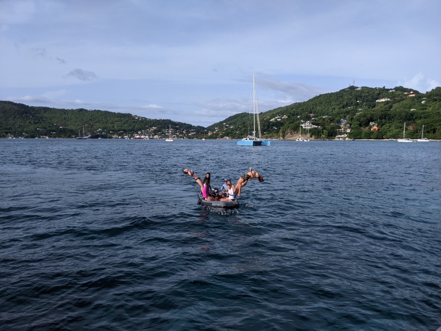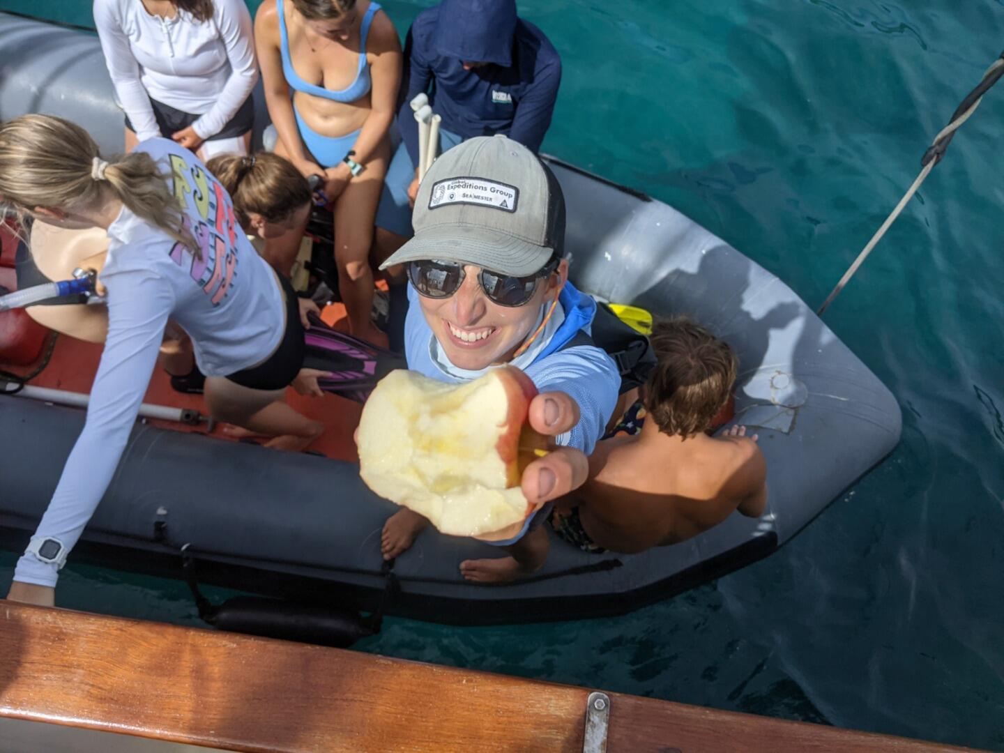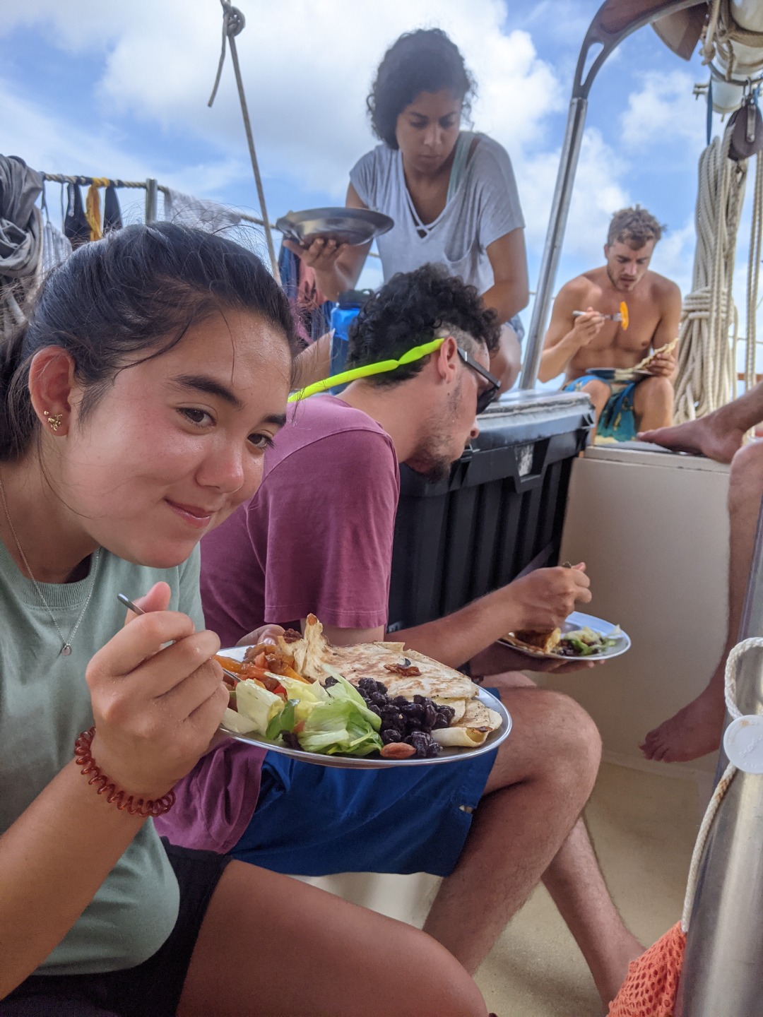 Upon arrival back at OceanStar, one group showed off their backflipping skillz from the dinghy. Pictured is Teagan, Cleo, and Jaden. Then it was time for jump-in showers whilst the Galley Crew finished preparing an epic dinner of homemade fries and burgers! For our squeeze question at the end of the meal, I asked, “if you had your own boat, what type would it be, what would you call it, and the names of any dinghies?” The best response goes to Jaden as he wants to name one of his dinghies “Winnie, after Pooh” because he loves honey so much. The problem is, Sam and Smash heard him say, “Winnie. I have to poo.” Which caused them to be completely in hysterics for the rest of the squeeze.