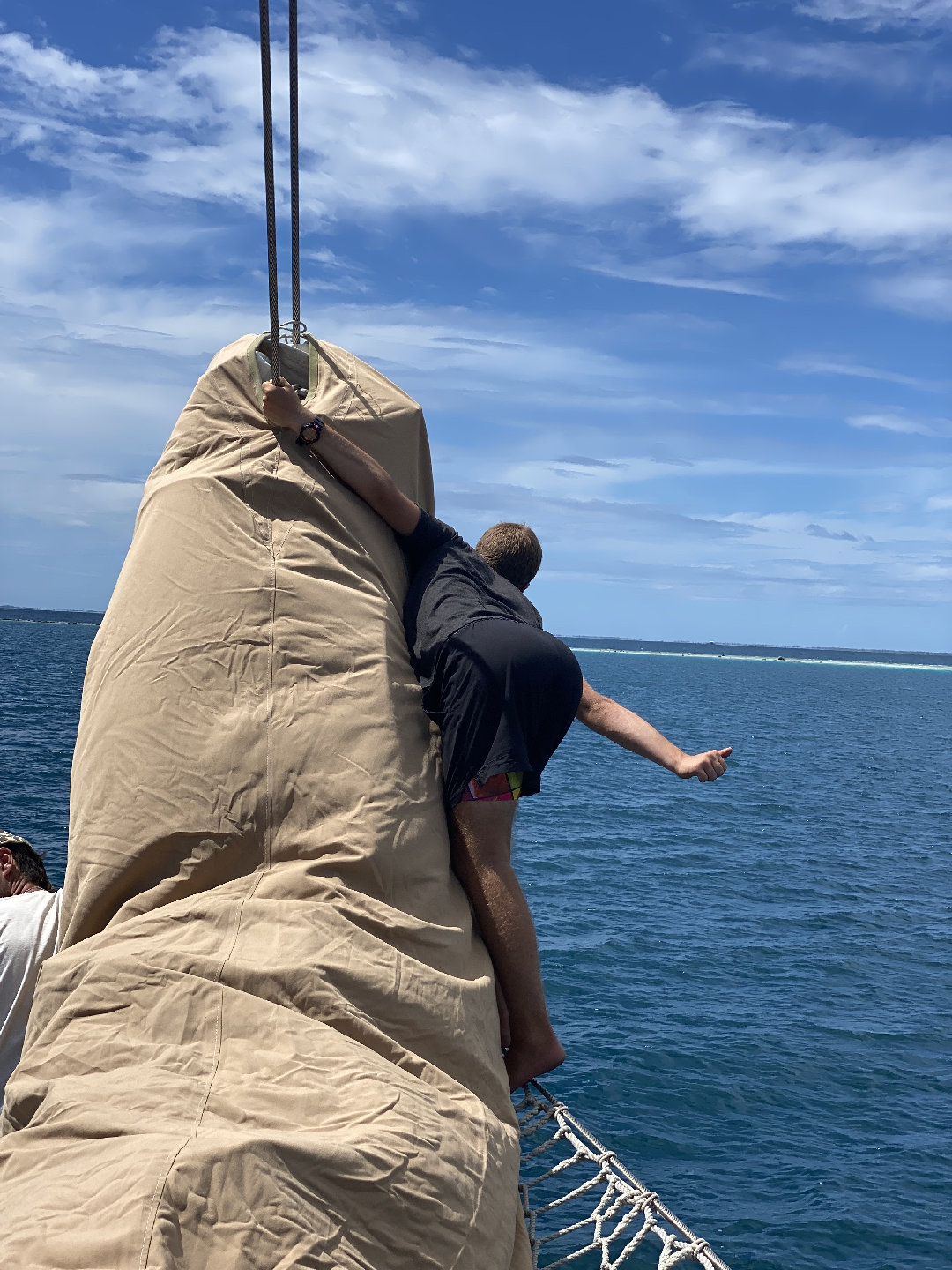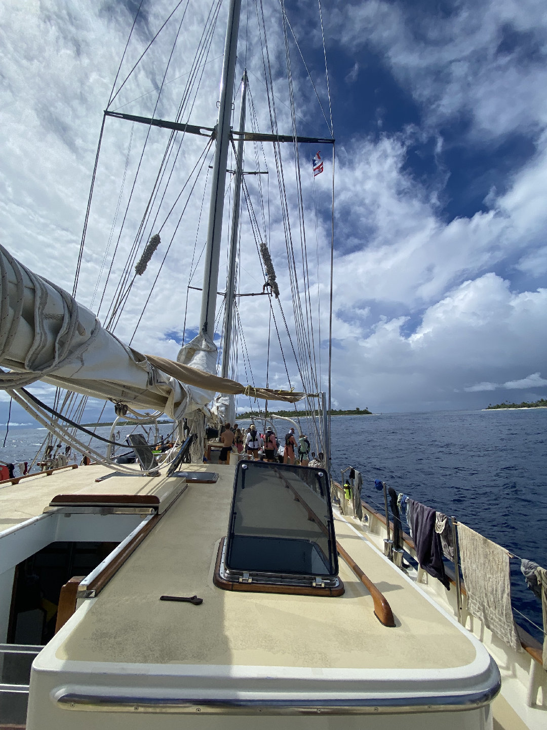 What an amazing final day as skipper! It started off with us (watch team 2) having an awesome 4-8 am watch and gaining site of land at about 6:30. As our watch progressed, the little lines on the horizon became much more detailed and clear, revealing just how gorgeous of a place this is. At around 10:30, we went through the very narrow shallow channel into the center of the atoll to make our way to the other side, where we dropped anchor. After lunch, we headed to shore, got to walk around a bit, and went to the beach. Though the beach was a bit rocky and sharp, it was super cool. We ended up walking inside the atoll and found a super calm little patch of sand where all of us swam and chilled for a while. Then, around five-ish, we came back to Argo and finished boat to bed, ate dinner, and celebrated Olivia’s birthday 🙂 Also, the sunset was insane tonight!