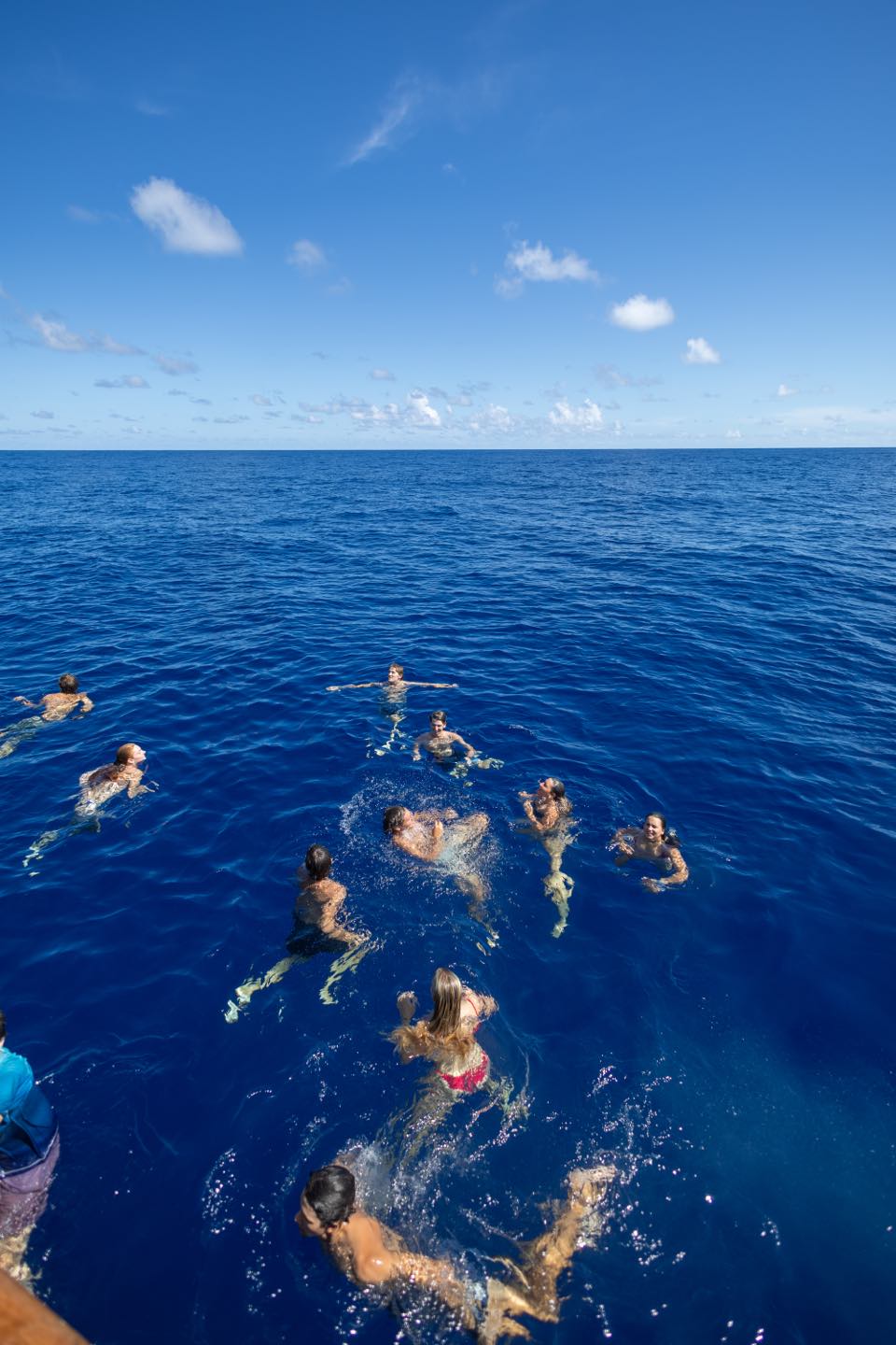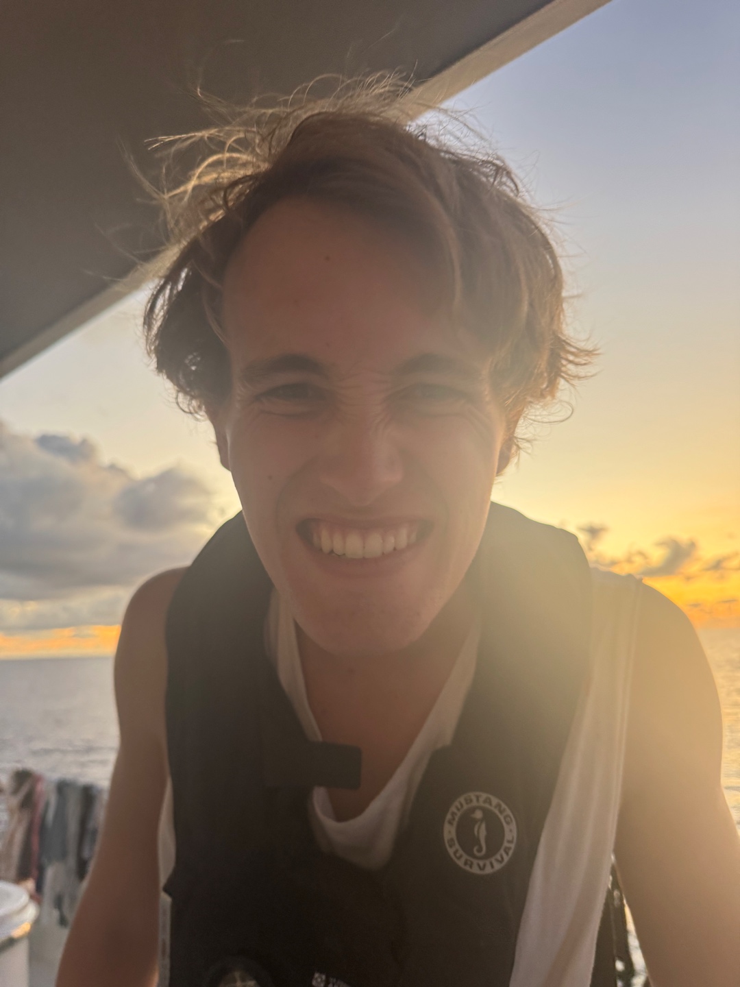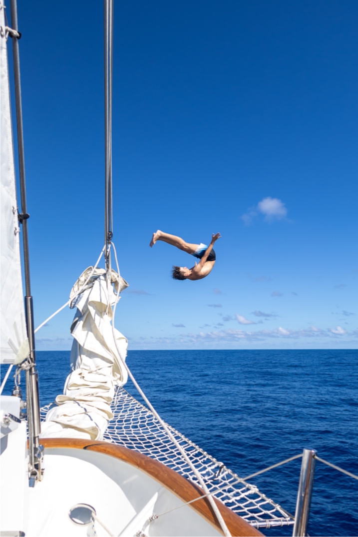 Second full day of our passage from Nuka Hiva to Ahe! Upon relieving watch team 2 (Graham, Maisy, James, Morgan G, Morgan C), my watch team (Caro, Paloma, Brooks, and I) had a great 4-8 watch. The sunrise was beautiful, and we had great conversations, talking about our future goals and getting great advice from Sam. Once our watch was completed, we were relieved by Watch team 1 (Maya L, Maya W, Jay, Harry, and Henry), who completed some boat chores like a deck wash and dinghy appreciation. We then had a great lunch of Pasta Salad and Chicken Nuggets (first time Ive had this combo, but I was pleasantly surprised) made by Caro, Sam, and Jake. Following lunch, we had our VHF exam for seamanship, which encompasses Radio communication. While we were eating lunch, our skippers (Mac and Jake) chose to slow down and put the engine into idle. We were all crossing our fingers and hoping for an ocean swim. Our prayers worked out, and Jake gave us the awesome news that we could swim! Swimming in the open ocean was such a surreal and awesome experience. We were all astounded by the crystal clear visibility and beautiful dark blue color of the water. Everyone broke out into their best backflip, front flip, dive, etc., attempts. I keep trying my best to land a backflip to no avail, just to the great amusement of Mac and anyone else who watches. During our ocean swim, Ben and Claire continued Emergency First Response Training. They did scenarios of swimmers being injured in the water and needing immediate attention, which required the help of our EFR students. Once we all got our last bit of ocean time in, we climbed back onboard and continued motoring along our course. During our 2 to 6 watch, Paloma and I got to sit and do bow watch on the Martingale, which was awesome. To close out the day, we had a great meal, Chipotle bowls with sausage, onions, corn, rice, etc. Ahe tmrw!