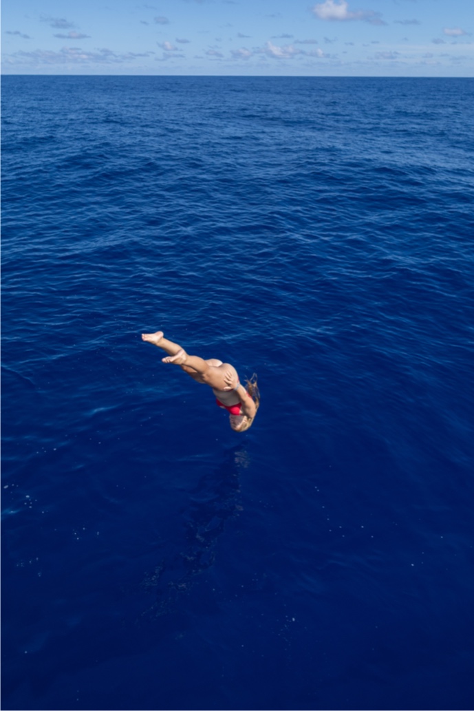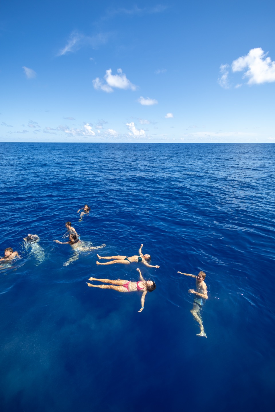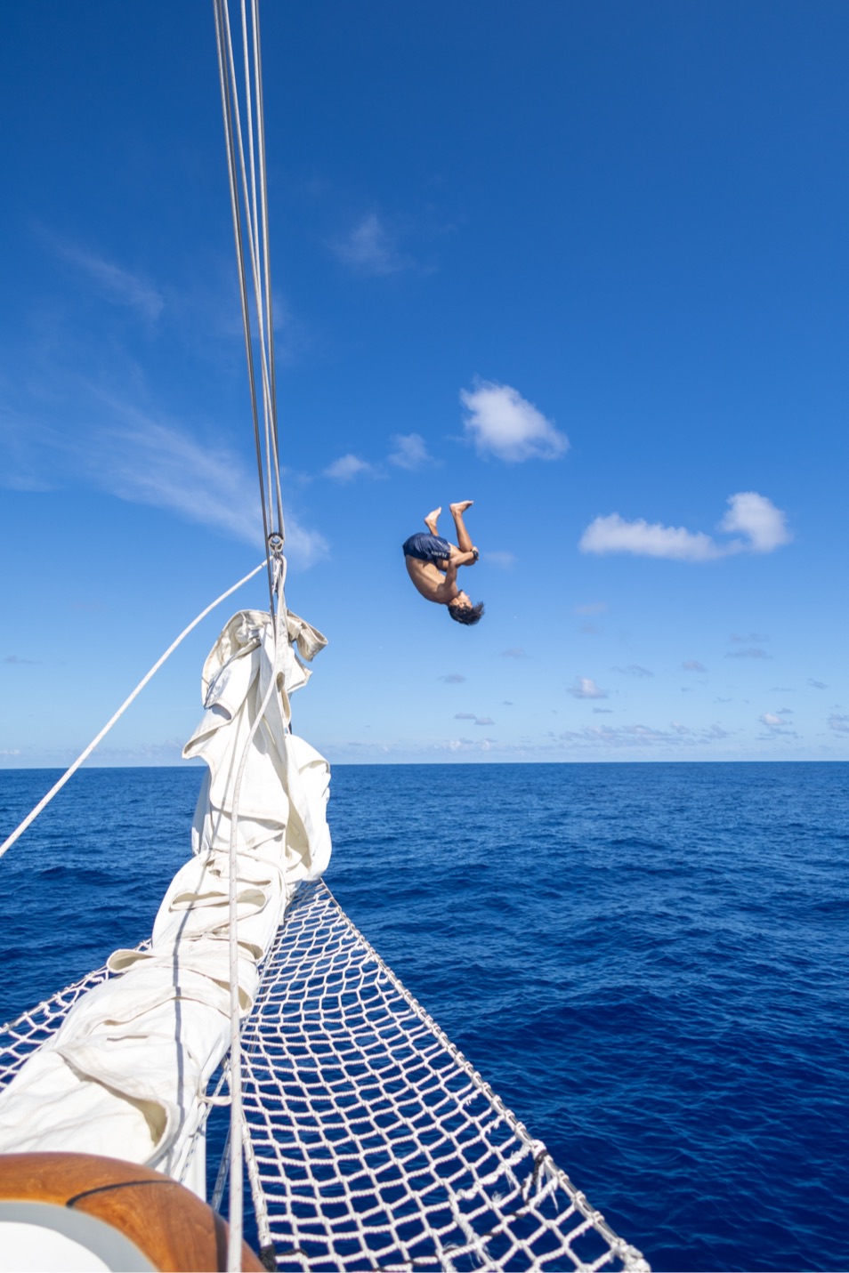 Second full day of our passage from Nuka Hiva to Ahe! Upon relieving watch team 2 (Graham, Maisy, James, Morgan G, Morgan C), my watch team (Caro, Paloma, Brooks, and I) had a great 4-8 watch. The sunrise was beautiful, and we had great conversations, talking about our future goals and getting great advice from Sam. Once our watch was completed, we were relieved by Watch team 1 (Maya L, Maya W, Jay, Harry, and Henry), who completed some boat chores like a deck wash and dinghy appreciation. We then had a great lunch of Pasta Salad and Chicken Nuggets (first time Ive had this combo, but I was pleasantly surprised) made by Caro, Sam, and Jake. Following lunch, we had our VHF exam for seamanship, which encompasses Radio communication. While we were eating lunch, our skippers (Mac and Jake) chose to slow down and put the engine into idle. We were all crossing our fingers and hoping for an ocean swim. Our prayers worked out, and Jake gave us the awesome news that we could swim! Swimming in the open ocean was such a surreal and awesome experience. We were all astounded by the crystal clear visibility and beautiful dark blue color of the water. Everyone broke out into their best backflip, front flip, dive, etc., attempts. I keep trying my best to land a backflip to no avail, just to the great amusement of Mac and anyone else who watches. During our ocean swim, Ben and Claire continued Emergency First Response Training. They did scenarios of swimmers being injured in the water and needing immediate attention, which required the help of our EFR students. Once we all got our last bit of ocean time in, we climbed back onboard and continued motoring along our course. During our 2 to 6 watch, Paloma and I got to sit and do bow watch on the Martingale, which was awesome. To close out the day, we had a great meal, Chipotle bowls with sausage, onions, corn, rice, etc. Ahe tmrw!