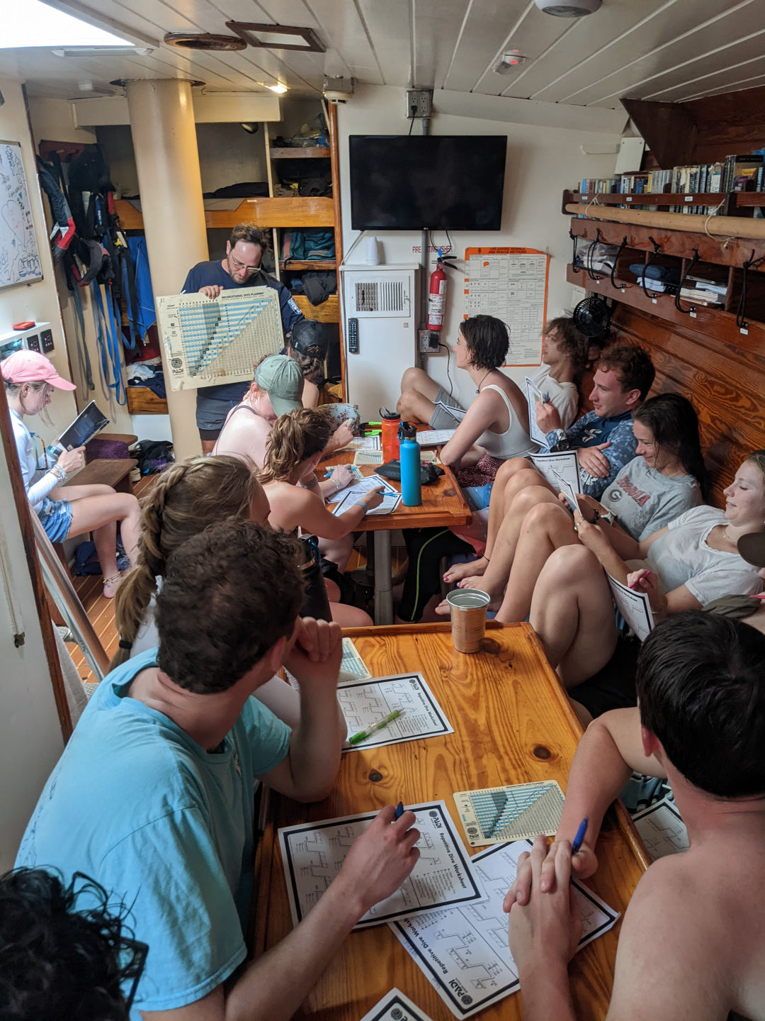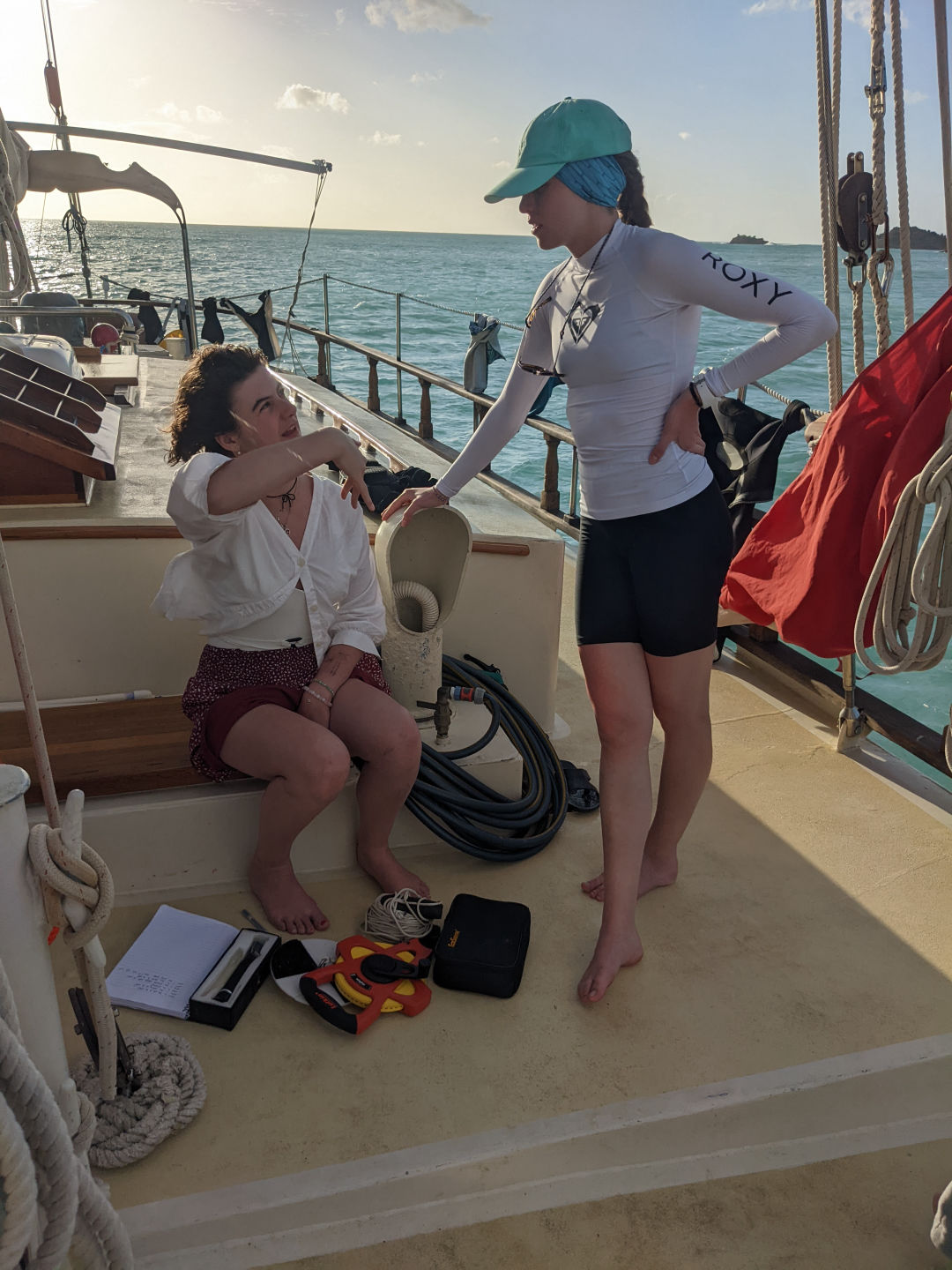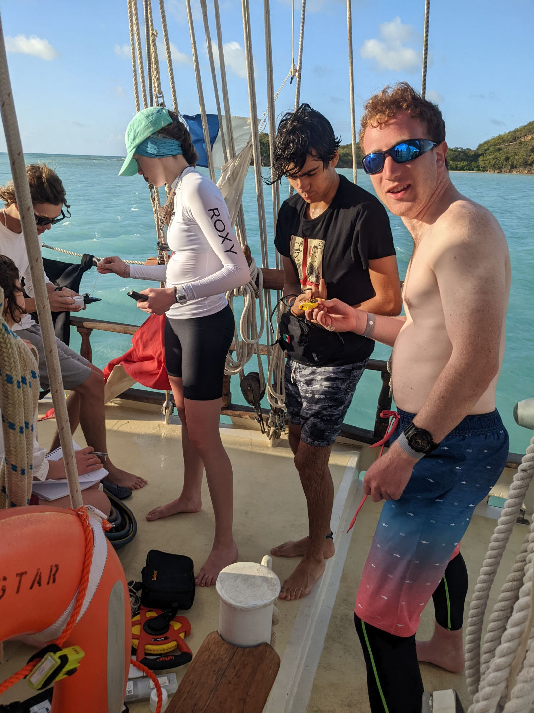 It was another fantabulous day on Ocean star! Waking up this morning and coming up on deck, we were greeted by a double rainbow before breakfast. Once clean up and breakfast were done, we had an intro to Oceanography with Sam, where we learned what the class would be like and what assignments we would be doing over the course of the semester. After we had the intro, the open-water students finished the last PADI videos and are one step closer to taking their first breaths underwater. While they did that, the certified divers were finally able to get in the water to do our refresher dive, even though the visibility wasn’t very good again today. After lunch, all the divers worked on RDP (recreational dive plans) tables and got better at them. Before dinner, we did our first marine science lab, where we got to check out all of the equipment that we would use for different labs during the semester. While doing the lab, one of the groups who was looking for plankton and other microorganisms found one tiny microscopic thing moving, and we all spent a good while trying to see it and then trying to identify what it was using our ID book. We couldn’t quite figure it out, though, since getting it on the slide was incredibly difficult. Not only was the food all day delish, but it was also the first day of students being head chef, and Sara did an amazing job. We got to readjust the anchor a few times today due to the wind and swells we have been getting, and we had another absolutely beautiful day in Antigua.