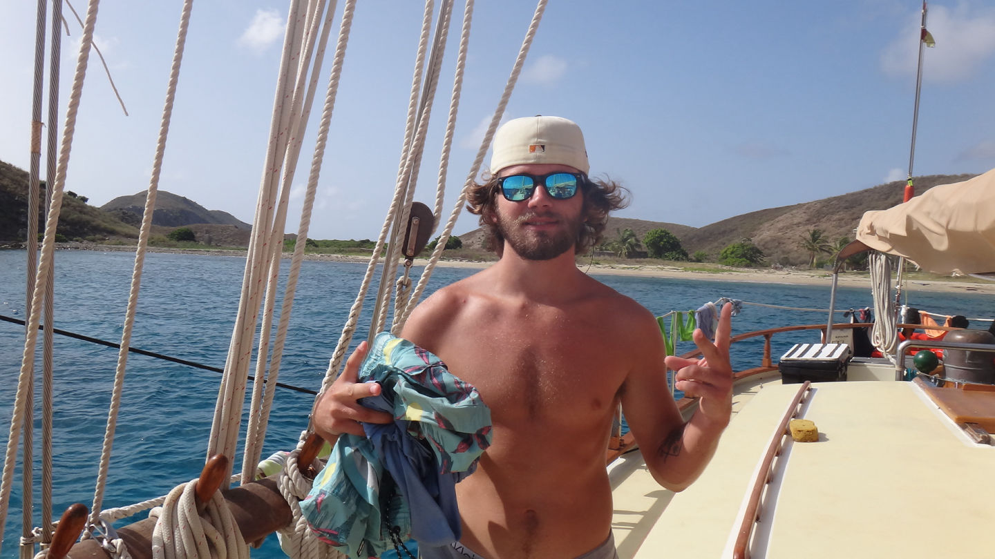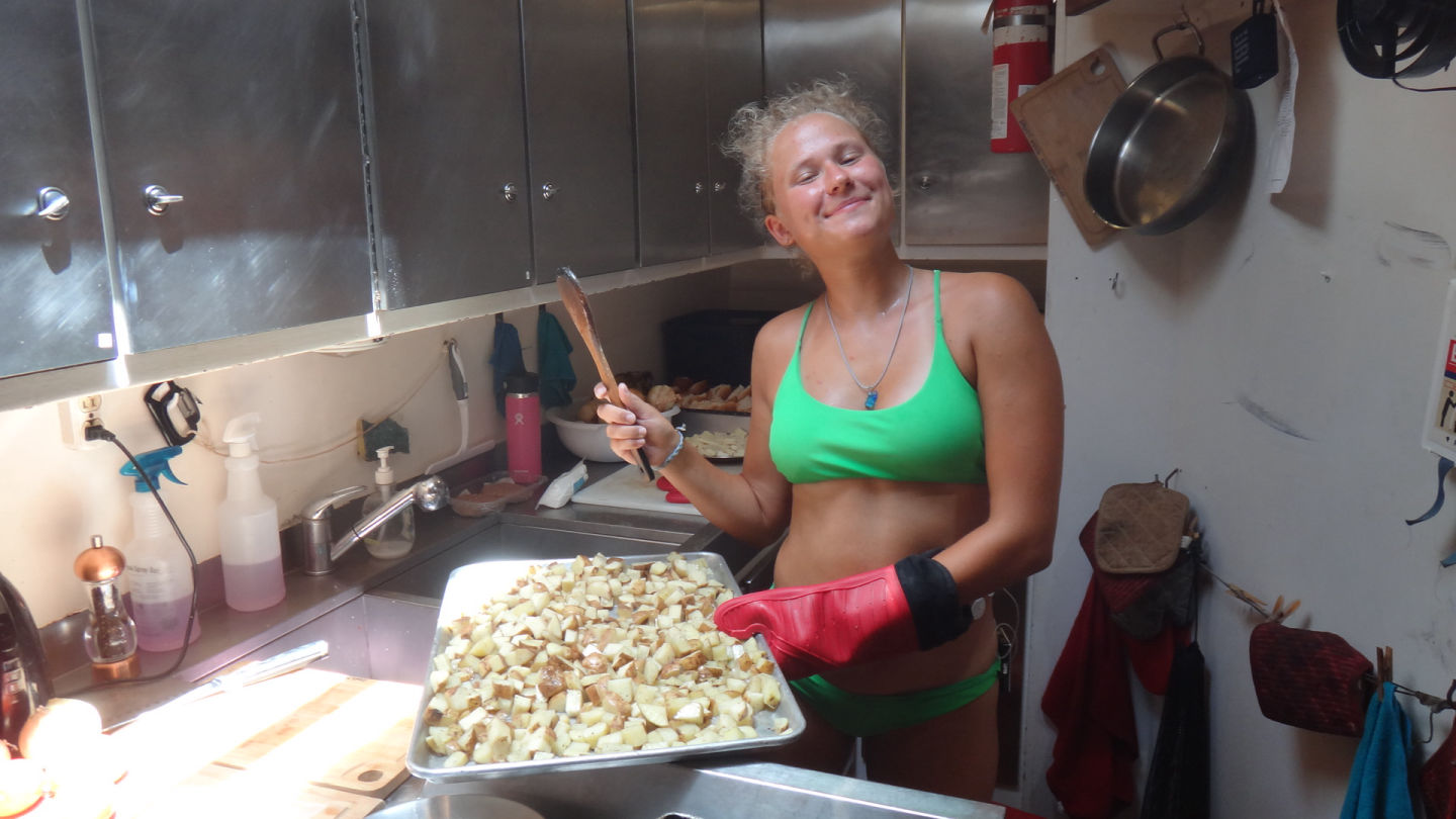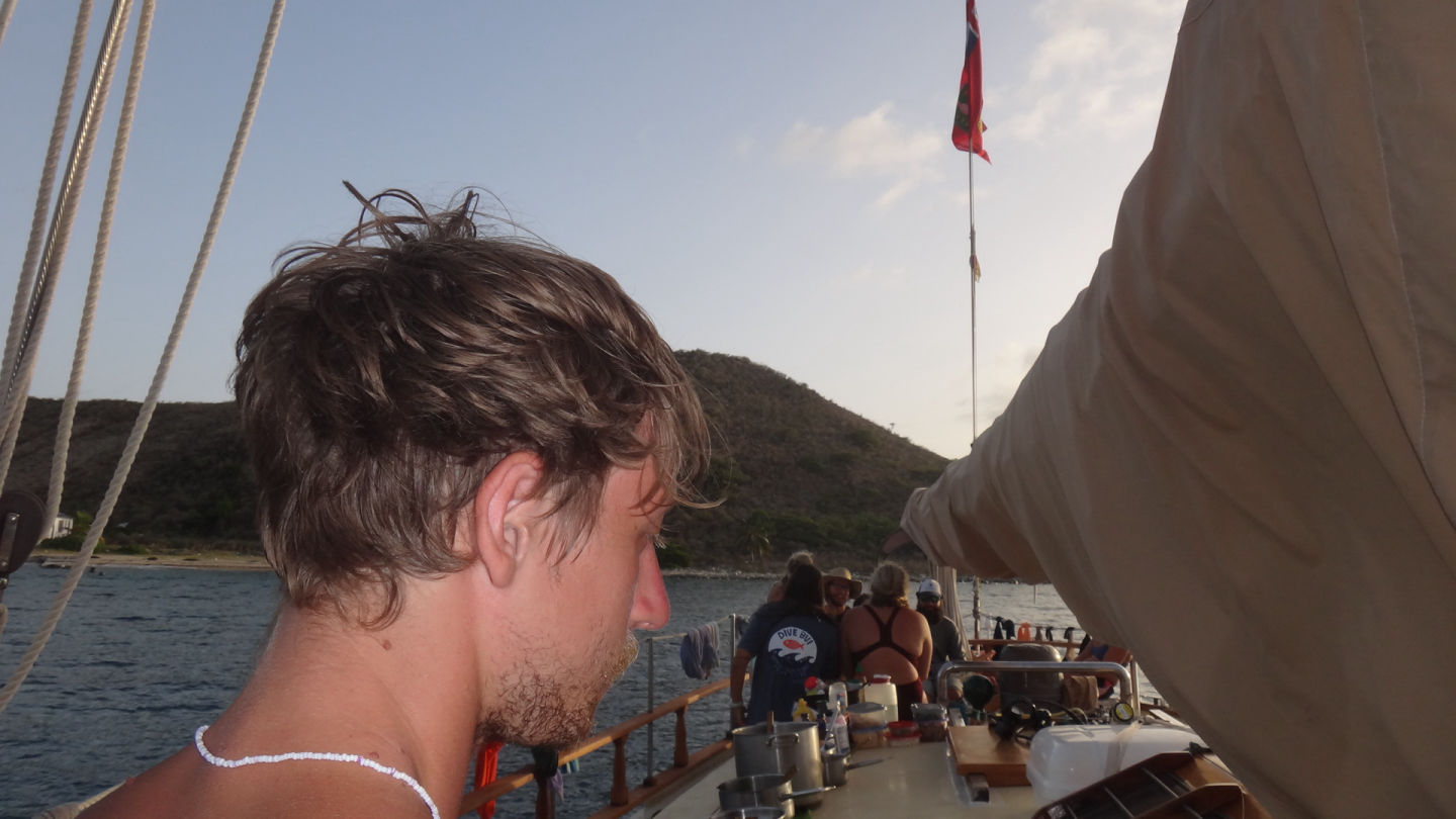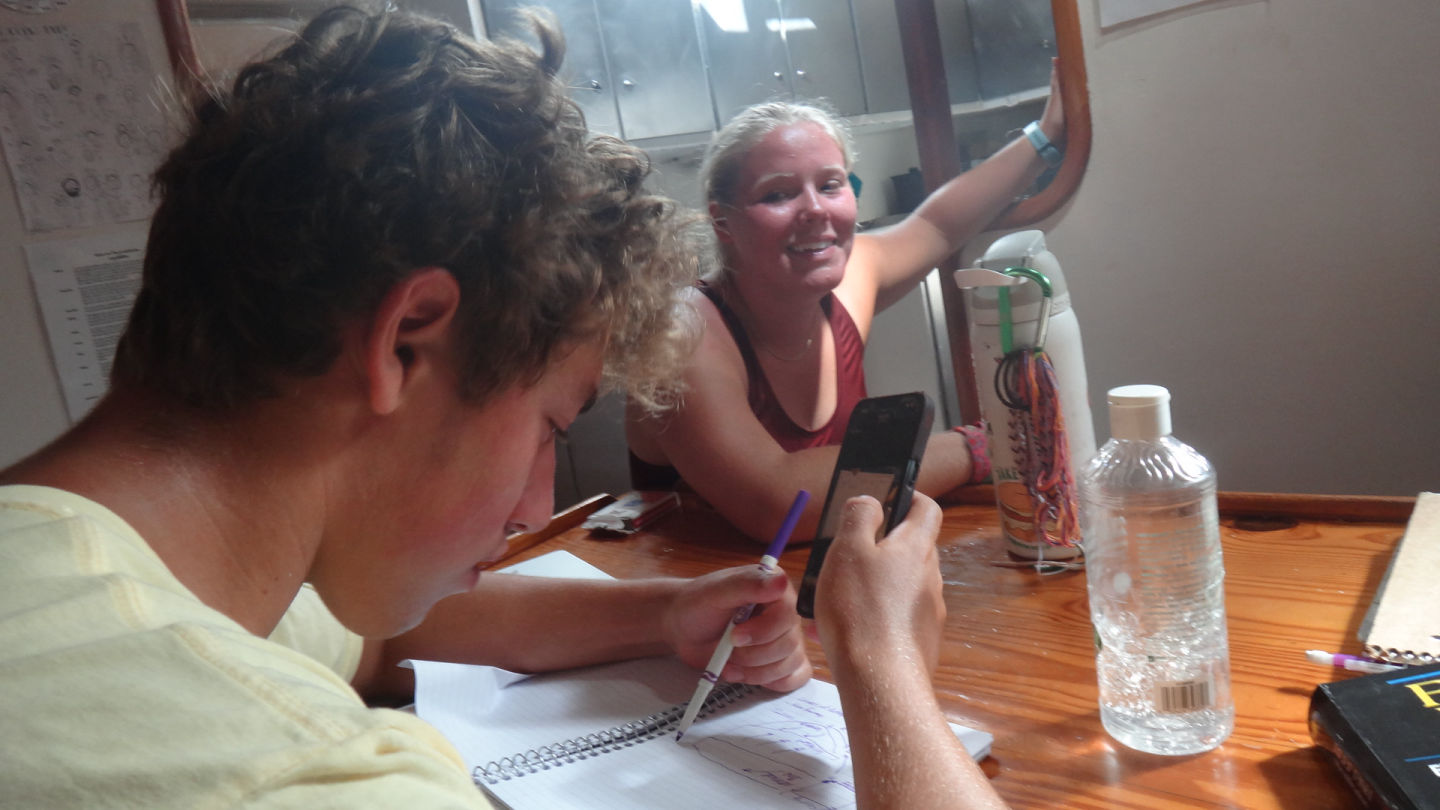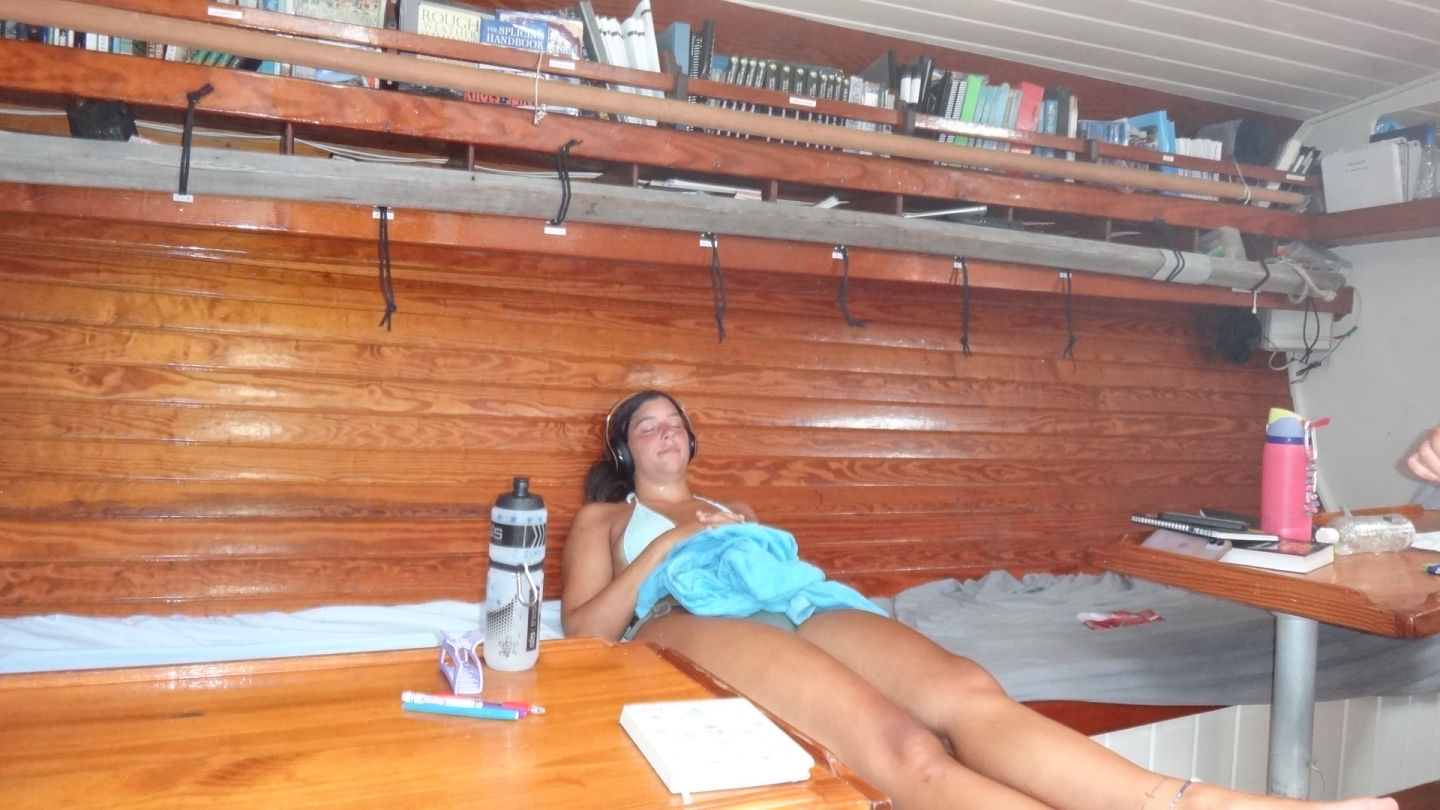 We woke up to a wonderful chia seed pudding breakfast made by head chef Sissy with a view of the magnificent Salt Island. As we chowed down on our food, the lectures of our Oceanography classes flashed through our minds because the final exam was today. After breakfast, as everyone was getting ready for the exam, we saw a strange ship headed in our direction. As it came closer and closer, we realized that it was none other than the action quest fleet. We rushed to get the eggs; what ensued could only be described as modern-day naval warfare. We threw our eggs at them, and they circled us in their cat and rained eggs down on us. After the commotion had settled down, we then had to take our exams. Rescue divers finished part of their certification, and lunch was served soon after. The lunch was good burgers. Following that delicious meal, rescue divers, advanced water, and Maris all prepared to go for their dives. The Advanced Water group completed their Navigation dive, and an eagle ray floated by. Rescue divers continued their certification, and Maris performed the stress test with Ray. After that dive, the crew rested for a while until dinner, which was BBQ ribs and mashed potatoes. After that delectable meal, the whole boat played hide and seek and cleaned up the boat.