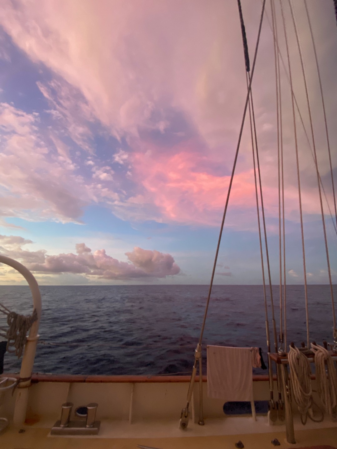 As our night comes to an end, a squall is quickly approaching. Everyone is out grabbing foulies and bracing themselves for the storm’s impact because this cloud is looking quite promising of a whole lot of rain. I can still feel that energy in the air growing stronger. I know that tonight I will not be getting much sleep as the student lead passage is reaching its climax, but I would not want it any other way. I am sitting with Kylie now as she prepares her charts and as Caleigh and Caroline in the saloon, next door prepare plans for bringing us into dock tomorrow. It is pure magic, is all I can say. Parents, I assure you we are arriving safely soon. Your kids are in great hands. in my opinion, the best. I will miss passage so much, but all good things must come to an end. Our night is just starting, and I can not wait for us to update you all soon with stories of success and arrivals in Palau.