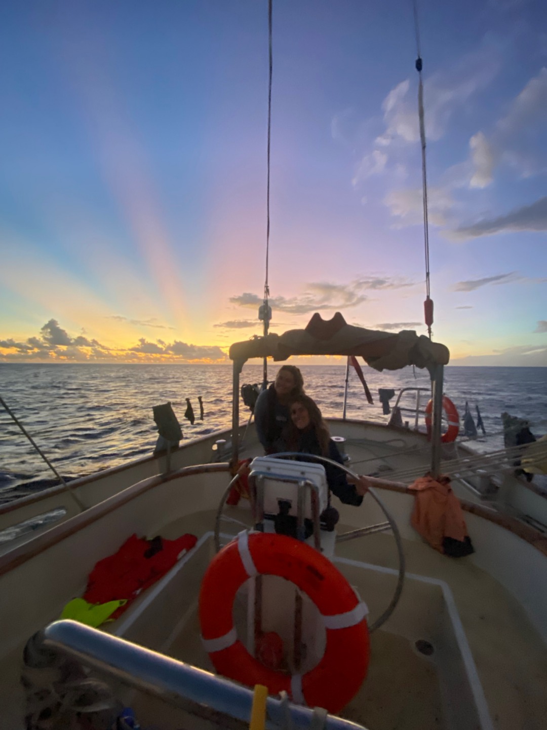 By the time our meeting was over, I could not sleep because I was too excited for the days to come. I spent a good amount of time doing fuel calculations and using our current RPMs and knot average to find an estimate about what time we would arrive in Palau. I made different options for Caroline to choose from depending on what was possible or not with the amount of fuel we had left. Kylie and Tyler stayed up with me. Kylie was in and out of the chart house working away on waypoints, and Tyler provided company and input on the calculations I was making. After working on that until about 12, I made a stop in the engine room to make sure the day tank sight glass was looking full. Then I made my way back to my little bunk to sleep before my next shift. This morning watch team two had the 4-8 shift. Early morning wake-ups are easy when you are waking up to be with people you love. I could not have asked for a better group of people to be with the past three weeks. Caleigh, Mia, Tyler, Cole, and Meg – it has been the best time. I will miss our dance parties, our power hours, Cole’s excitement for wake up time (even though I know it is funnier for us than it is for those being woken up, sorry watch team 3), bow watches discussing just about everything you could imagine, the iconic spooky shift featuring true crime podcasts, and of course our star gazing. Last night we saw more shooting stars in those few hours than I think I will see for the rest of my life combined. I could never forget Elle and Steph, who lead our team for the past three weeks. They have kept us going even when squalls came, which was just about every watch as our team was notorious for having squalls hit, specifically always during our hours. They were the glue that held us together, and I am so thankful for them. I am also thankful to have gotten a chance to spend more time with Elle after our time at AQ together four years ago this exact summer. I feel like we have grown up together, and everyone deserves to have an Elle in their life because she is amazing. Steph is equally amazing, and I would like to say she has maybe the coolest tattoo I have ever seen on her foot of an eagle ray. We loved you guys even when you made us do competitions to hold up our arms or when we chanted to Steph “cry on the helm!” when she was not feeling up to the task. It is these small moments that quickly become memories that I will cherish forever.